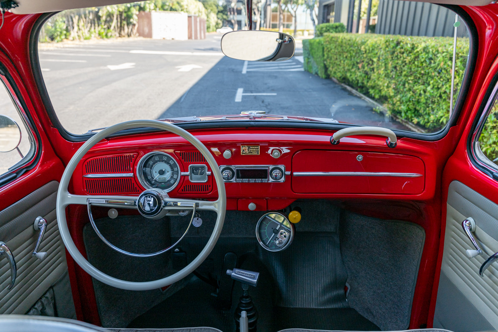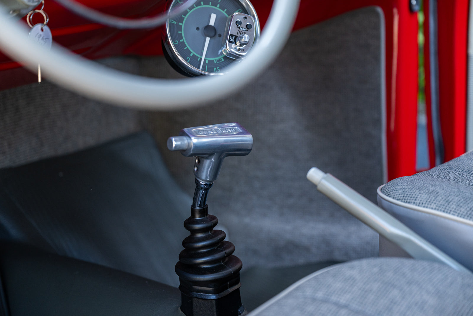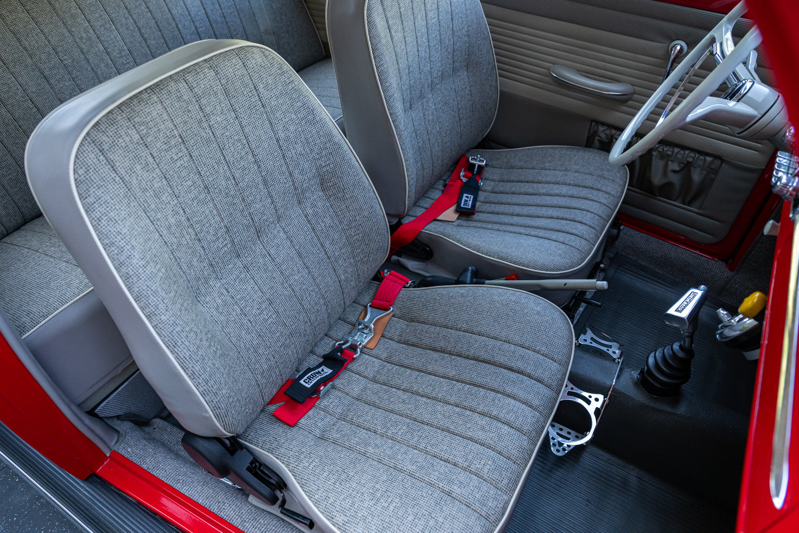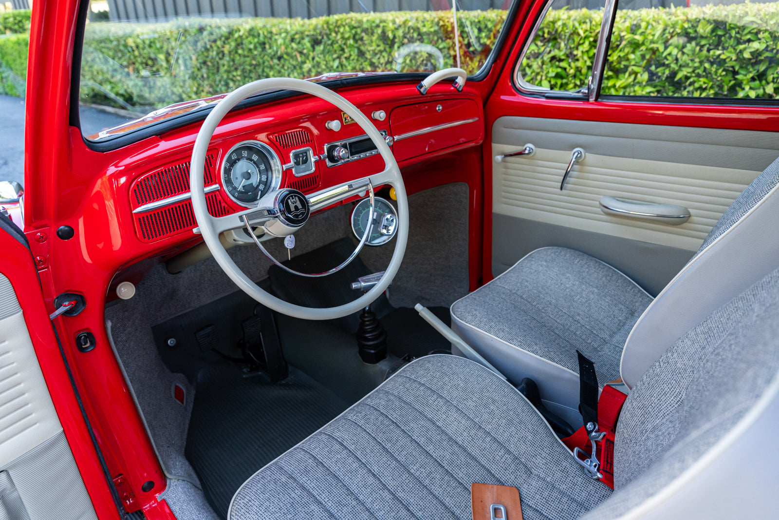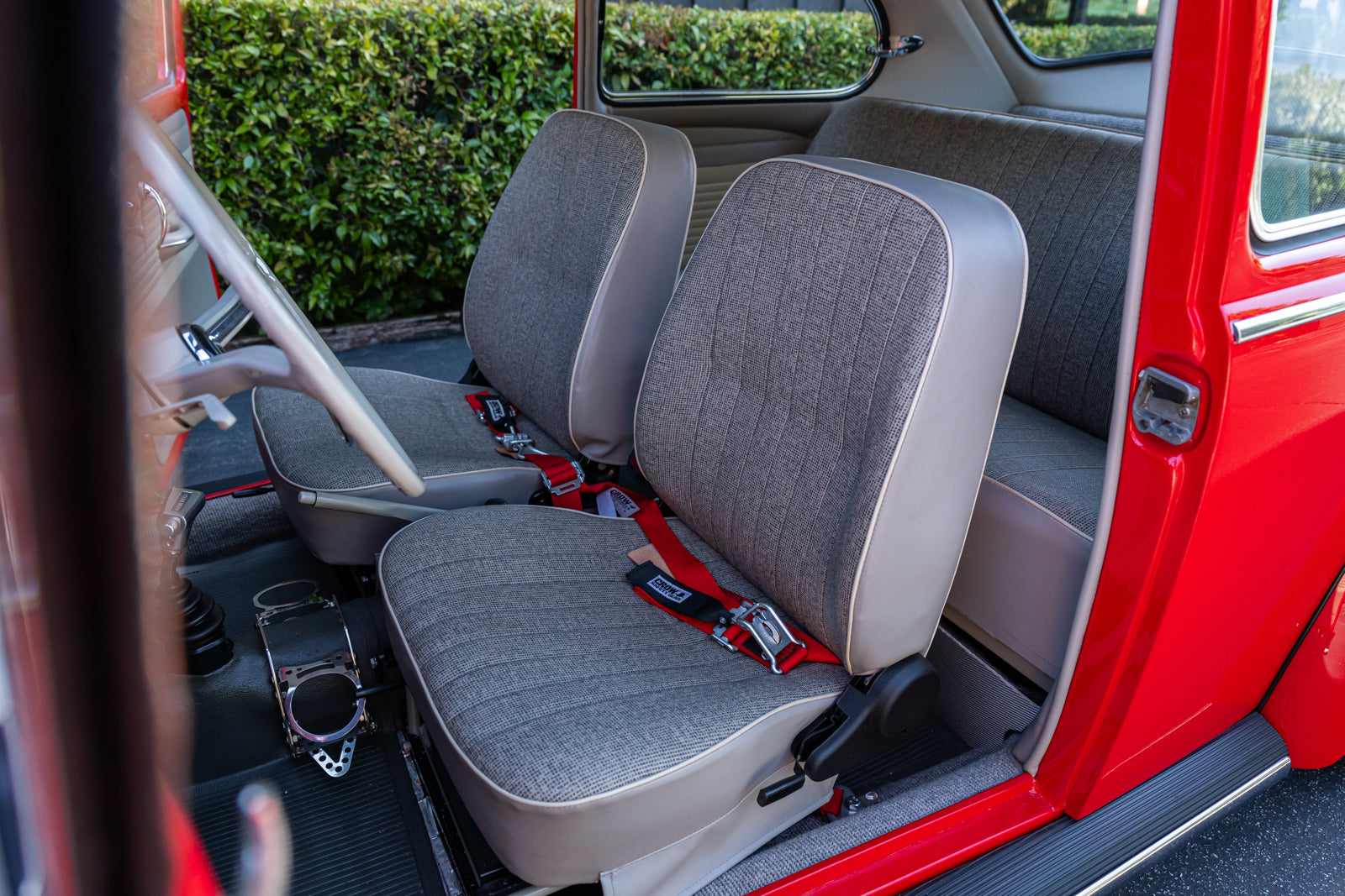 The replacement bucket seats are upholstered in gray and feature Crow lap belts. The carpeting was replaced and the headliner was reupholstered during the refurbishment. Equipment includes a body-color dashboard, door panel pockets, a Gene Berg shifter, rear vent windows, cupholders, and a RetroSound radio.