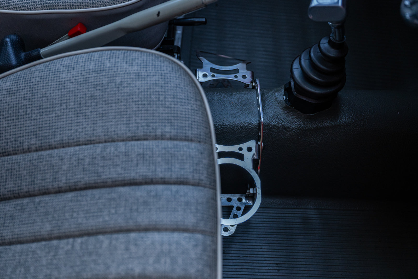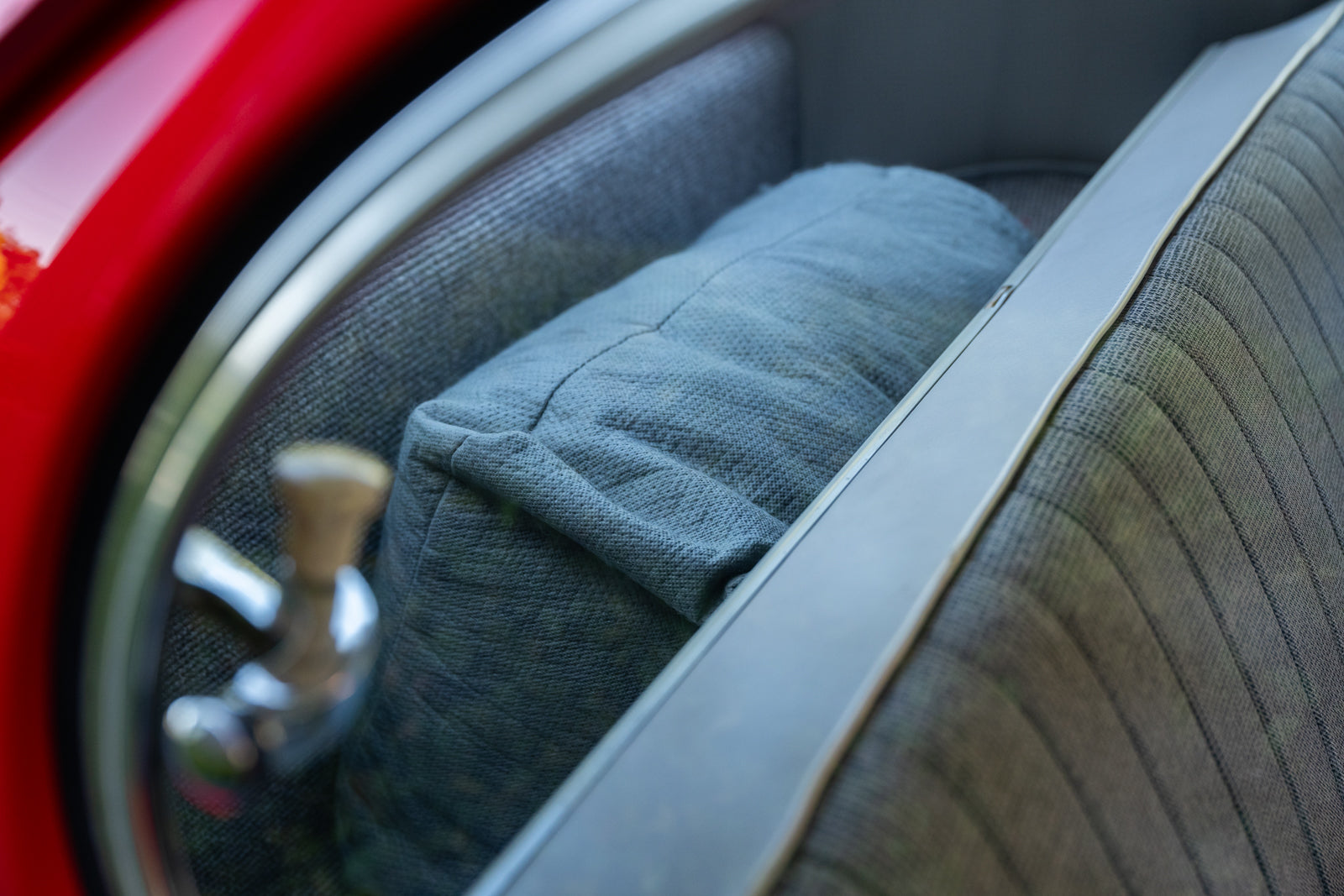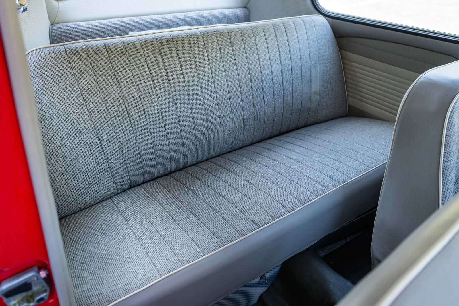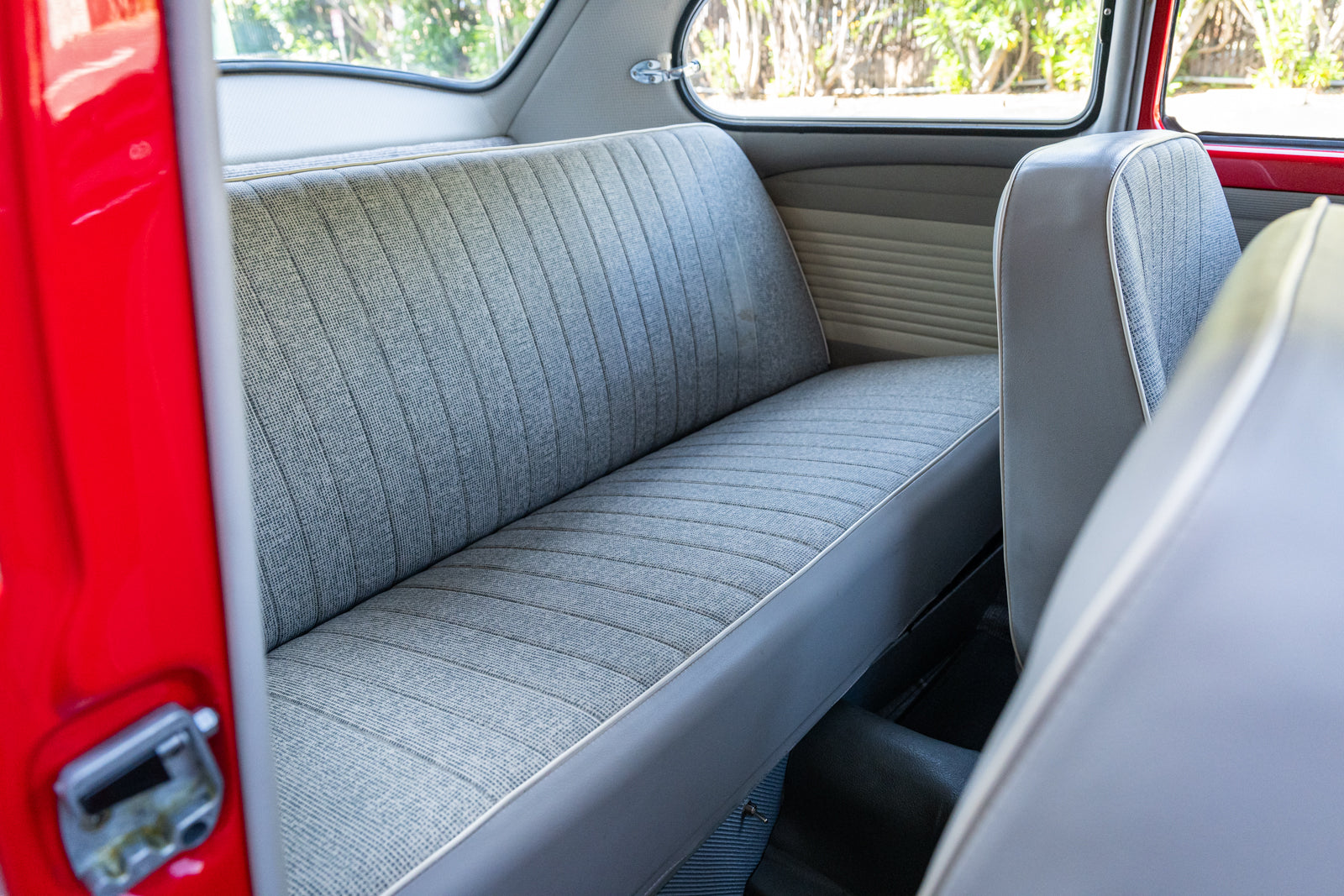 The replacement bucket seats are upholstered in gray and feature Crow lap belts. The carpeting was replaced and the headliner was reupholstered during the refurbishment. Equipment includes a body-color dashboard, door panel pockets, a Gene Berg shifter, rear vent windows, cupholders, and a RetroSound radio.