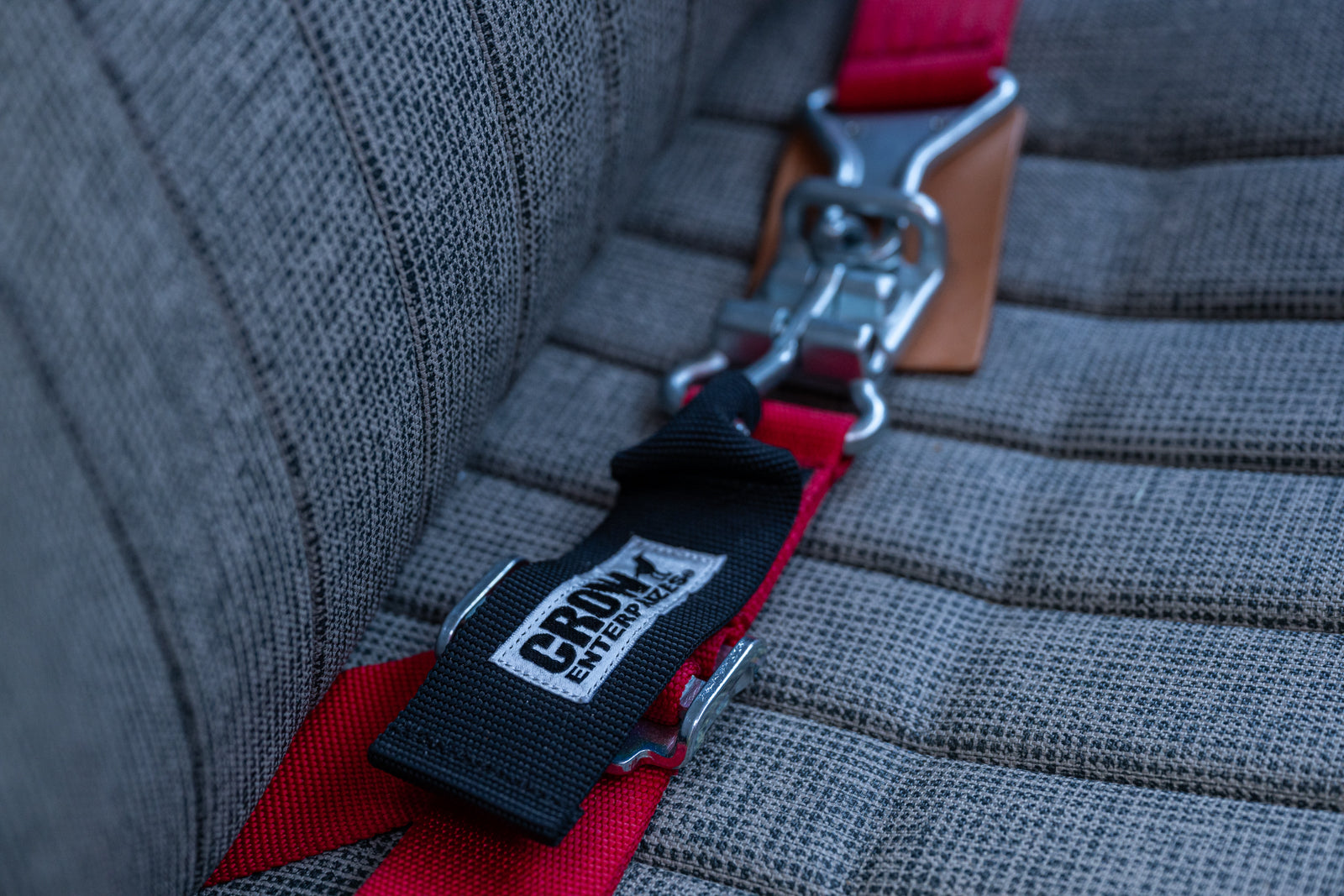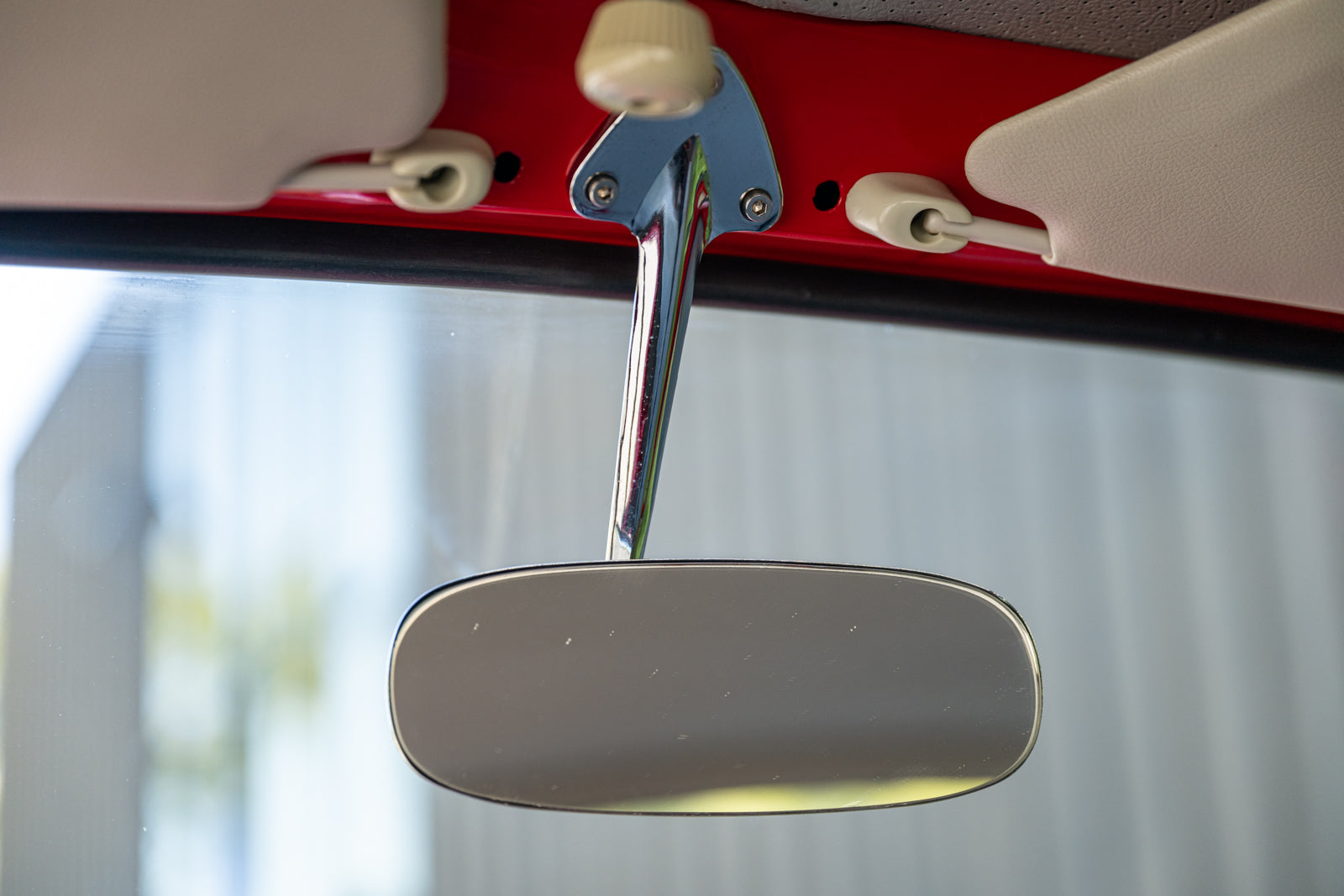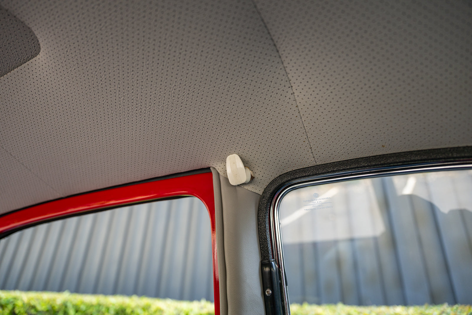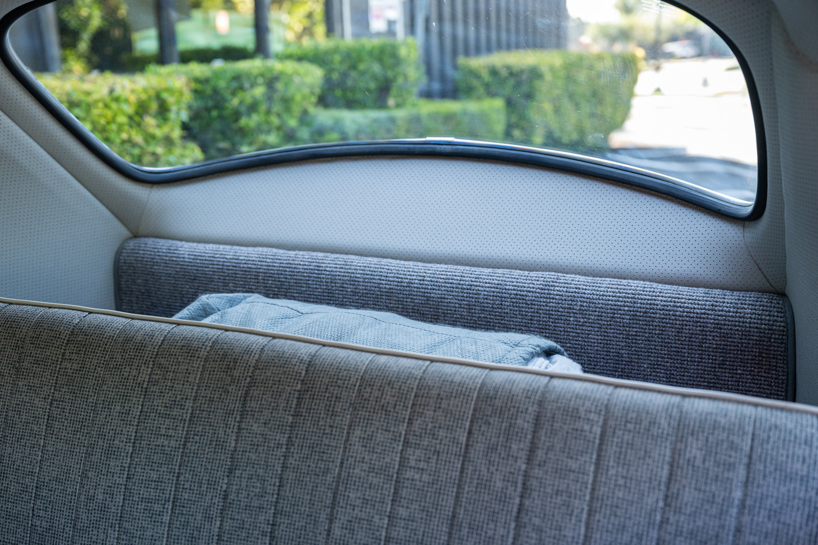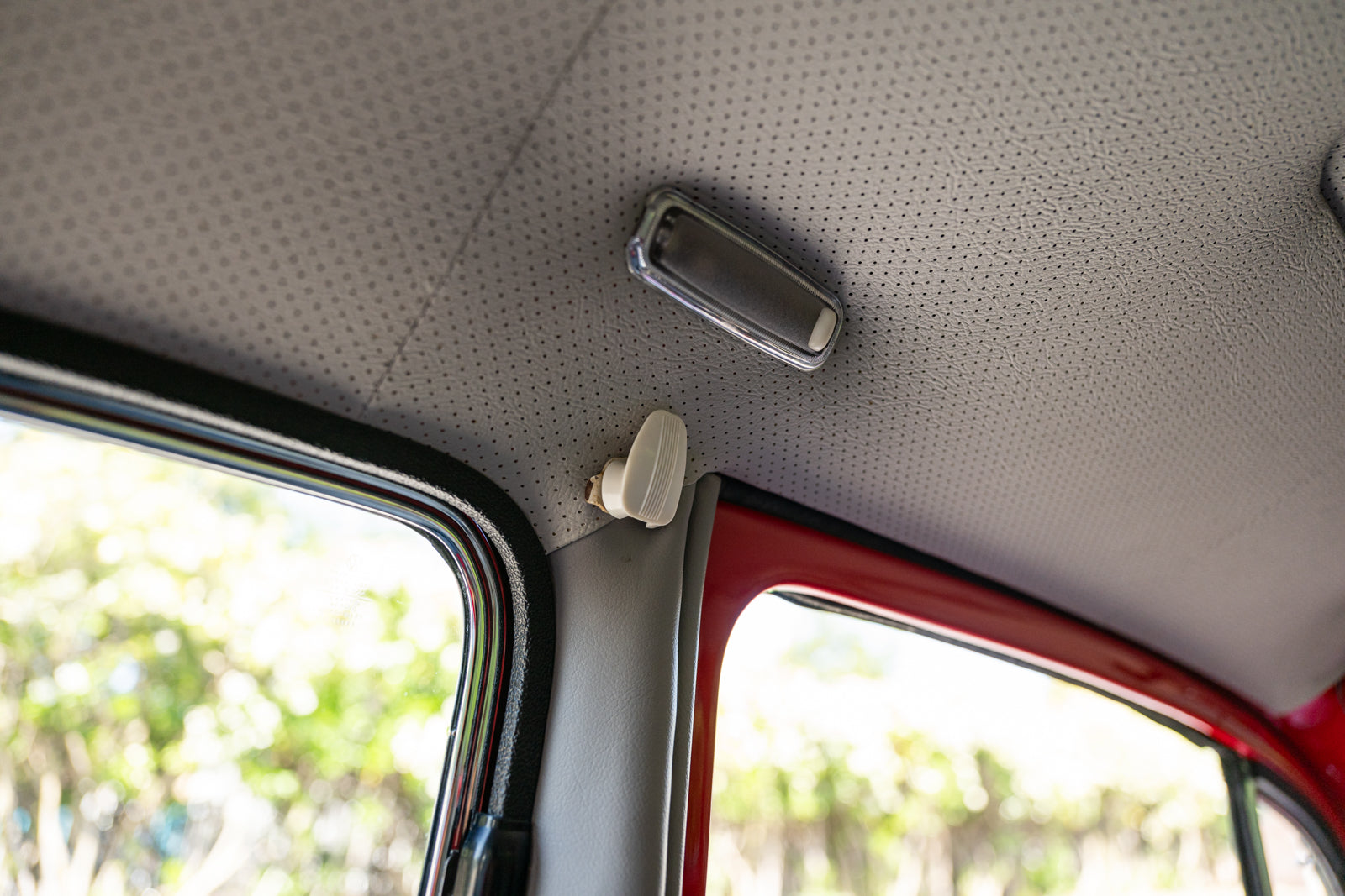 The replacement bucket seats are upholstered in gray and feature Crow lap belts. The carpeting was replaced and the headliner was reupholstered during the refurbishment. Equipment includes a body-color dashboard, door panel pockets, a Gene Berg shifter, rear vent windows, cupholders, and a RetroSound radio.