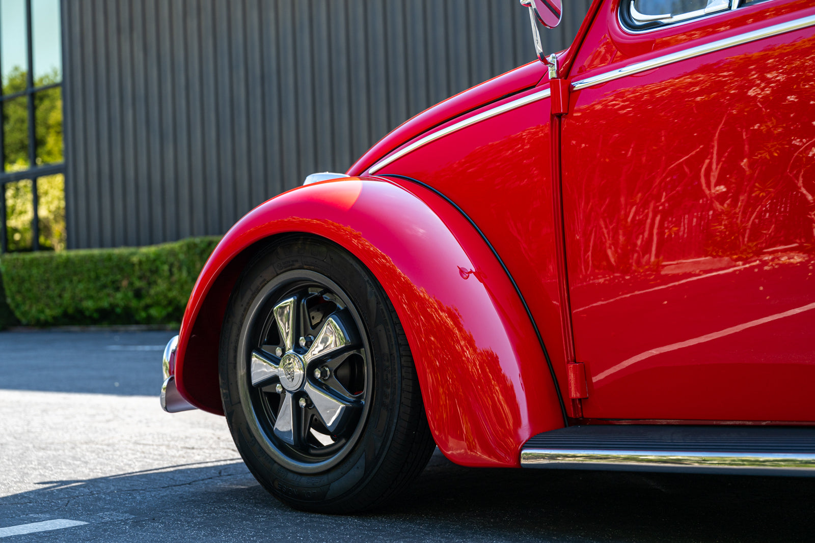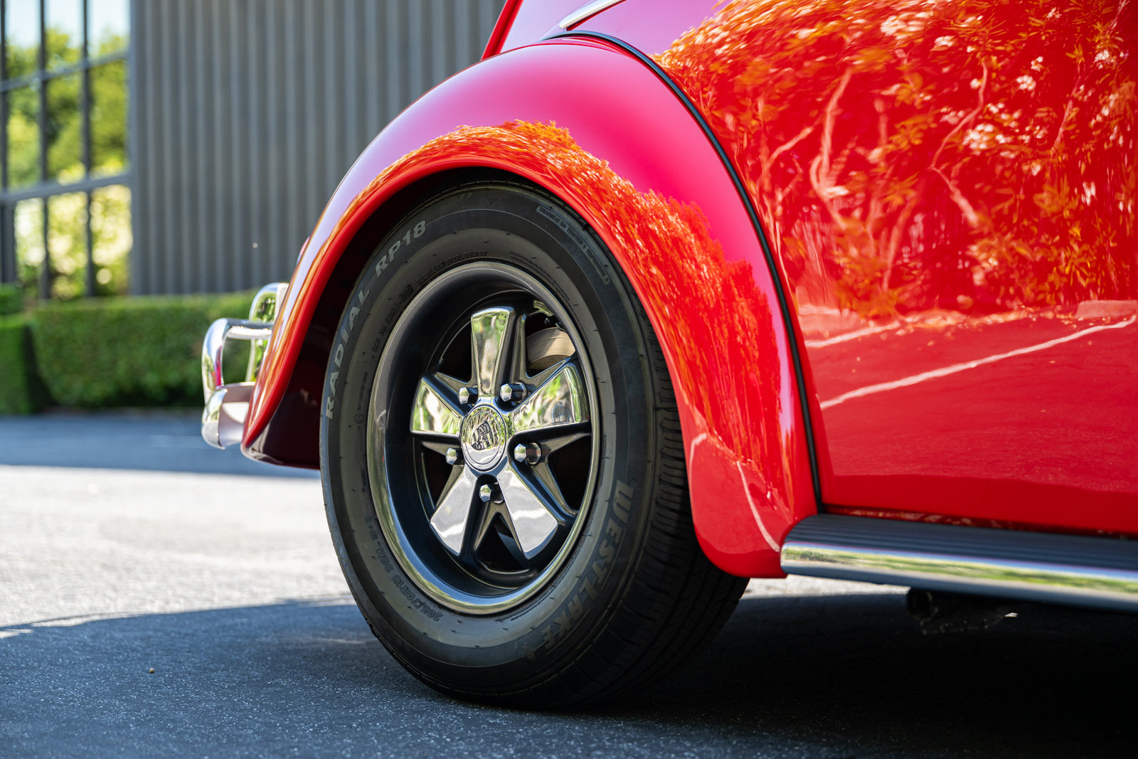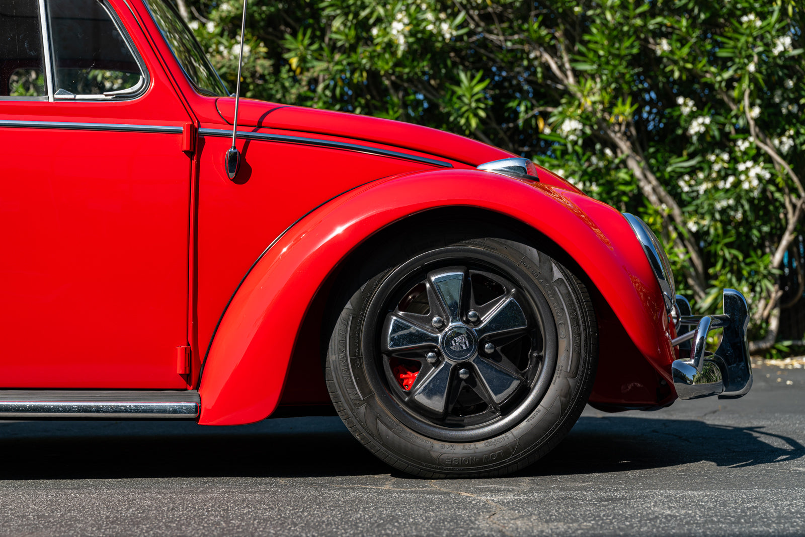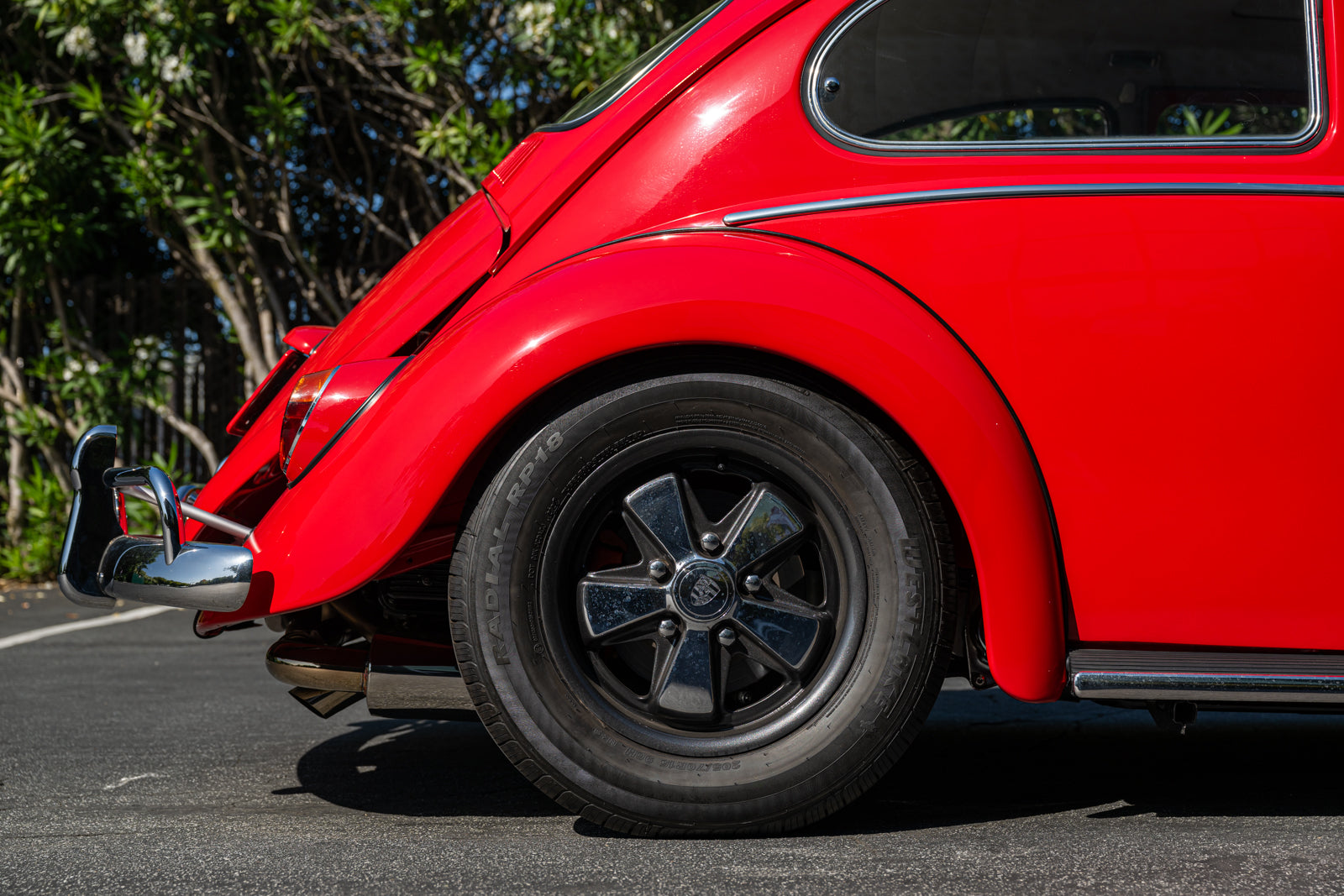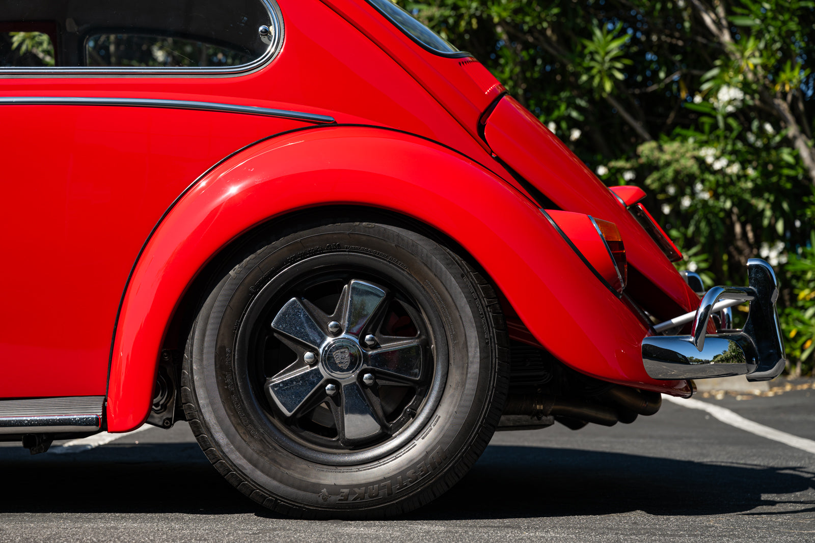 Fuchs-style 15″ wheels wear Porsche-crest center caps and 145-series Nankang CX668 tires up front and 205/70 Westlake Radial RP-18 tires out back. Stopping power is provided by four-wheel disc brakes with red-finished calipers and front drilled and slotted rotors.