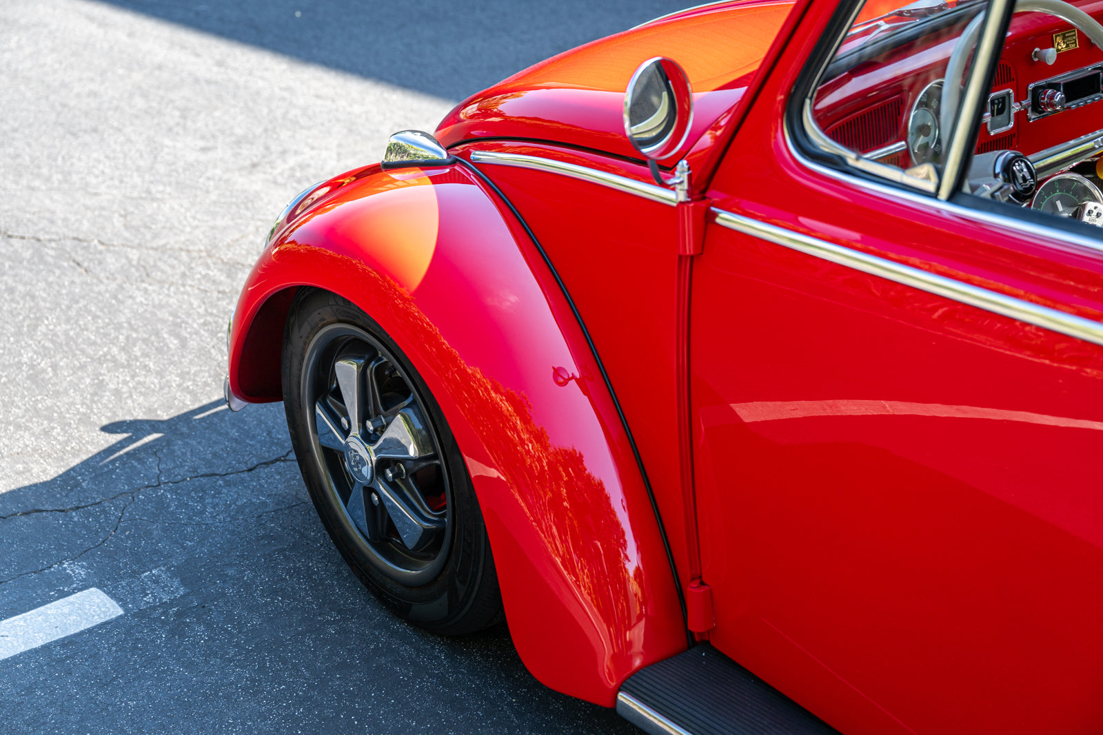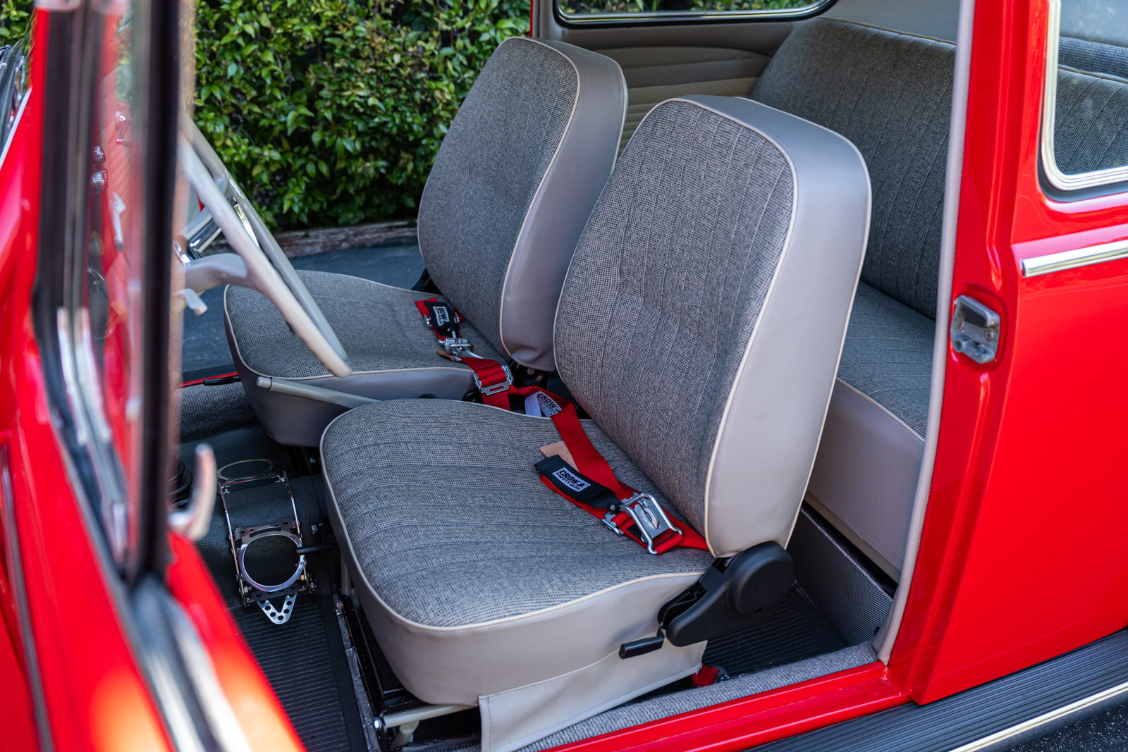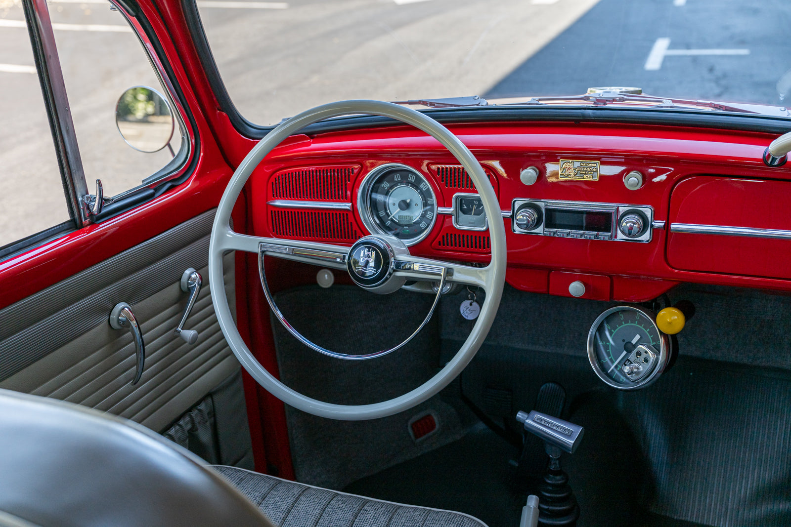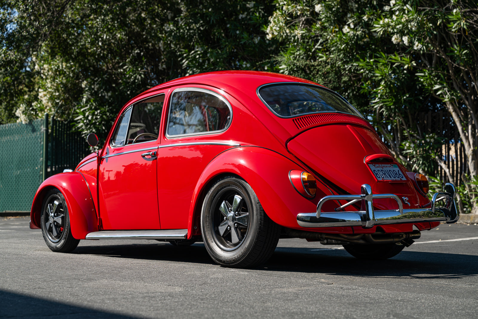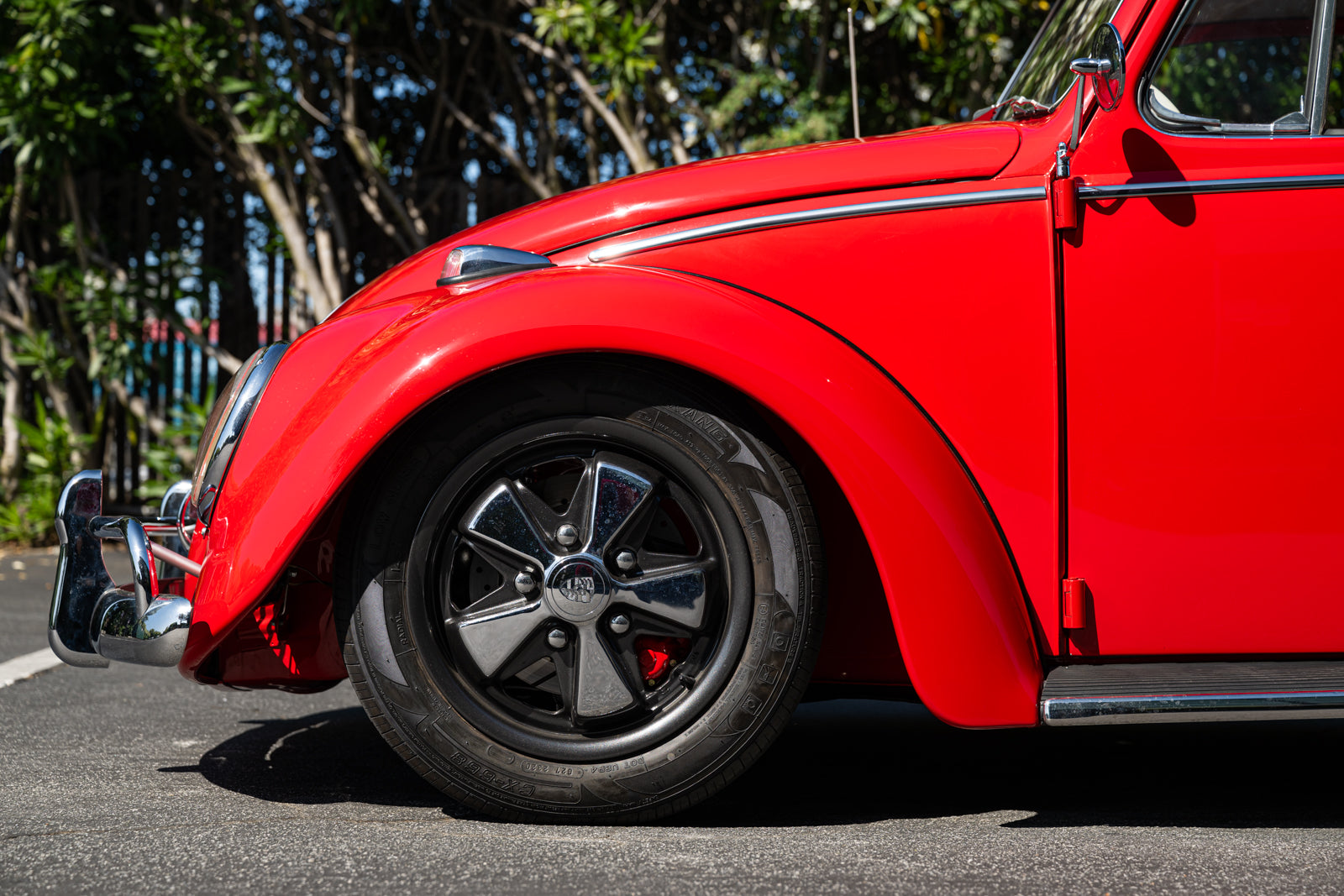 Fuchs-style 15″ wheels wear Porsche-crest center caps and 145-series Nankang CX668 tires up front and 205/70 Westlake Radial RP-18 tires out back. Stopping power is provided by four-wheel disc brakes with red-finished calipers and front drilled and slotted rotors.