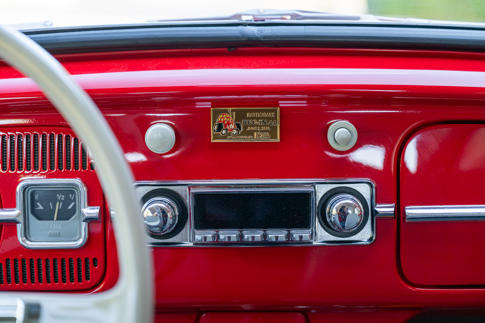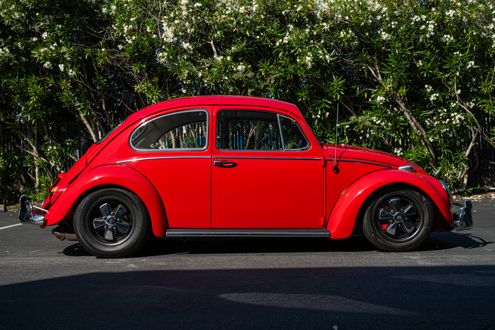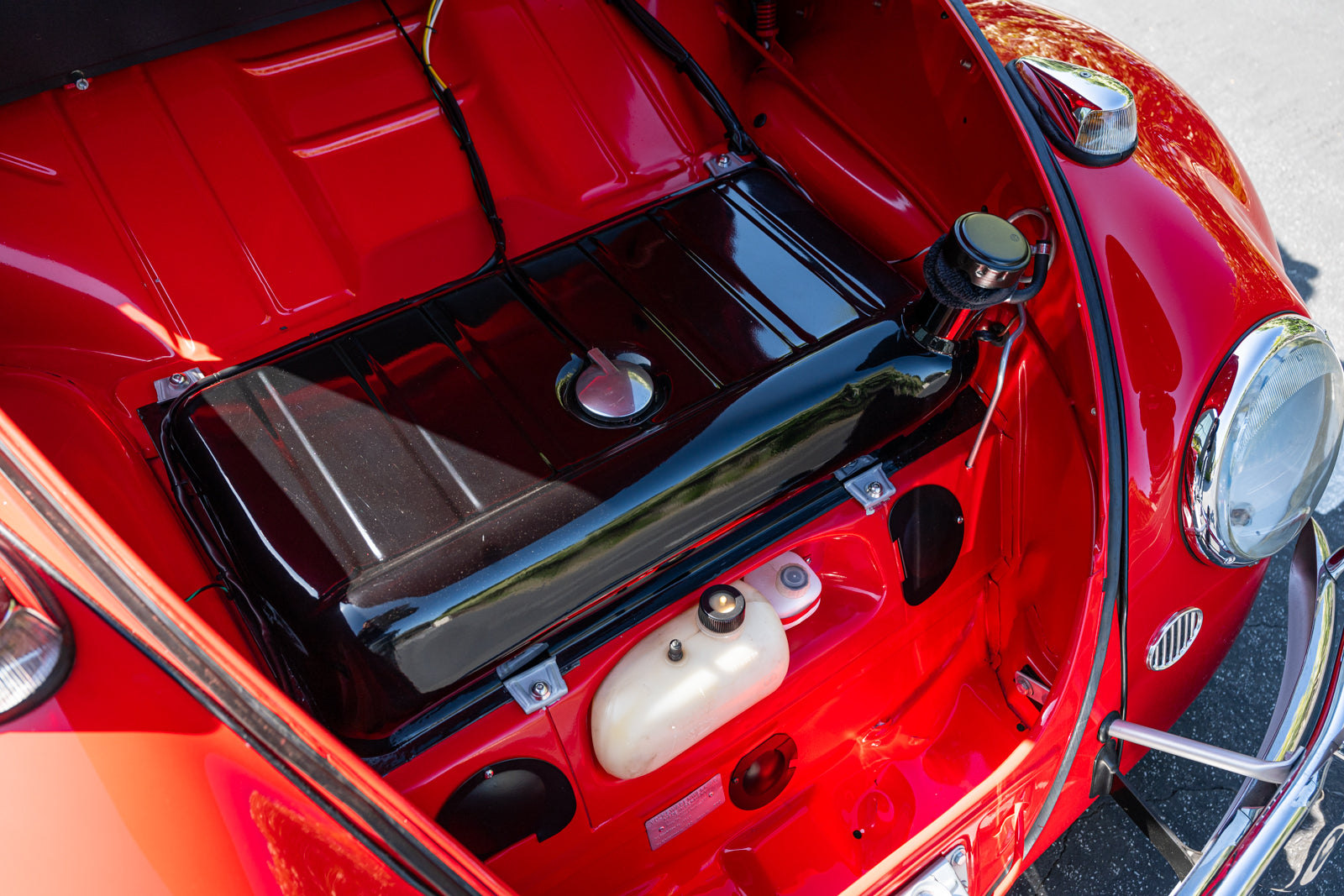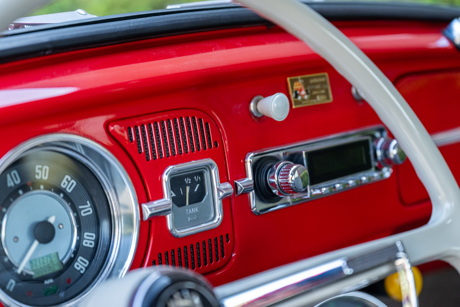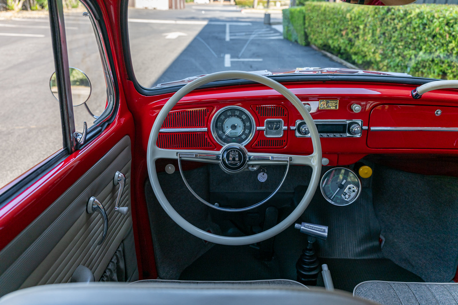 Fuchs-style 15″ wheels wear Porsche-crest center caps and 145-series Nankang CX668 tires up front and 205/70 Westlake Radial RP-18 tires out back. Stopping power is provided by four-wheel disc brakes with red-finished calipers and front drilled and slotted rotors.