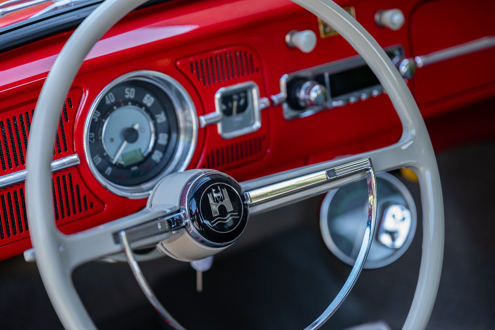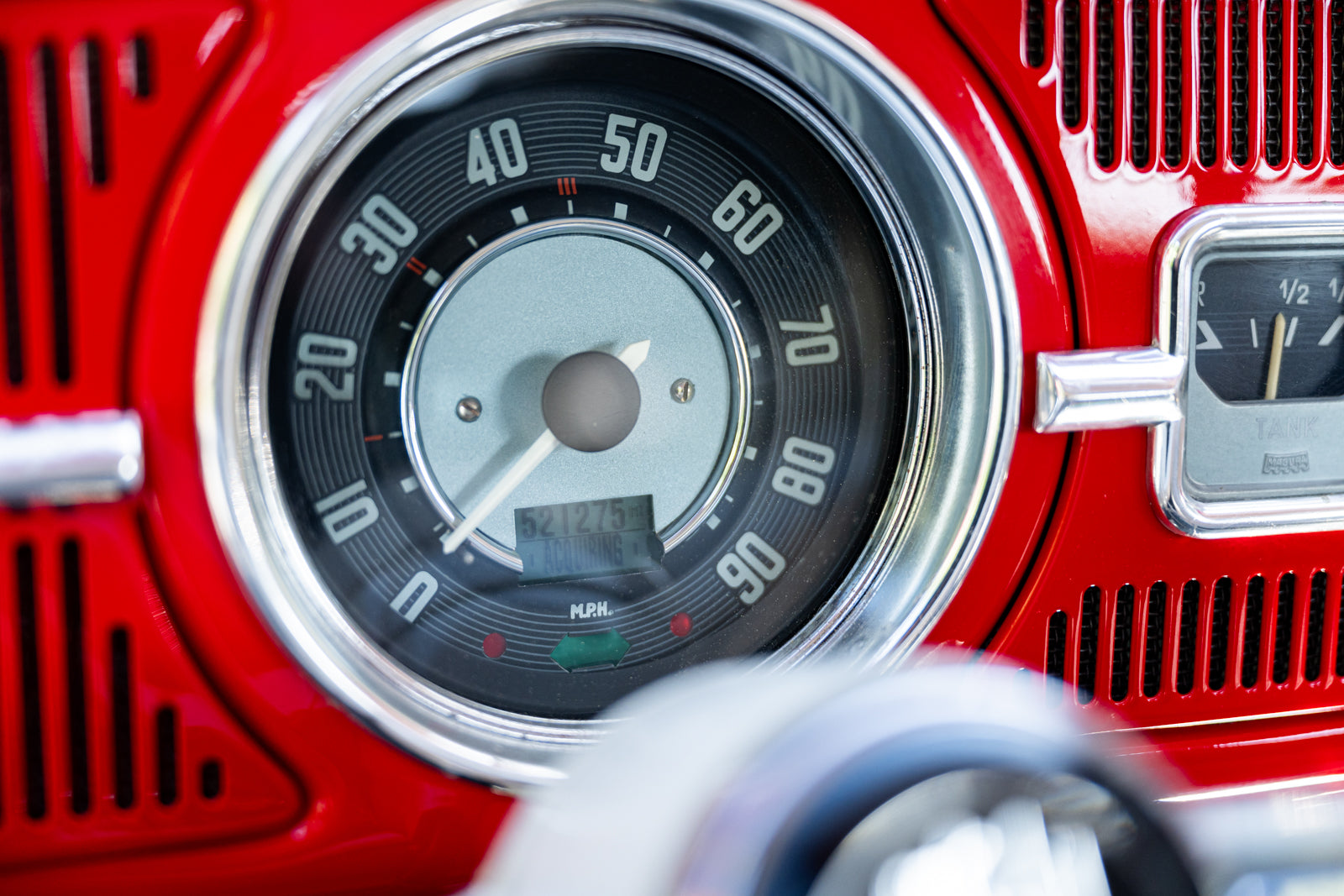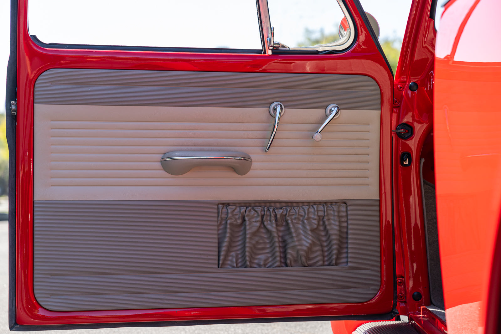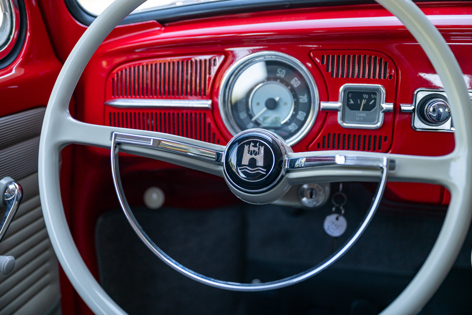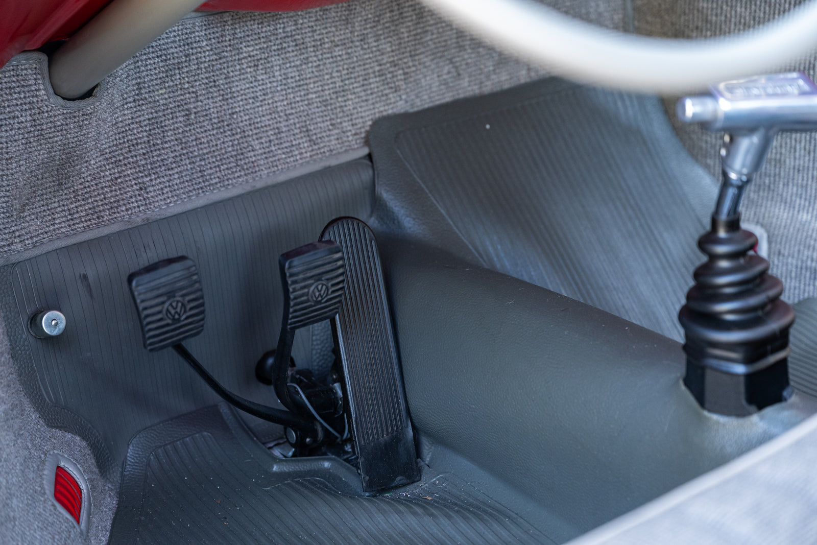 Fuchs-style 15″ wheels wear Porsche-crest center caps and 145-series Nankang CX668 tires up front and 205/70 Westlake Radial RP-18 tires out back. Stopping power is provided by four-wheel disc brakes with red-finished calipers and front drilled and slotted rotors.