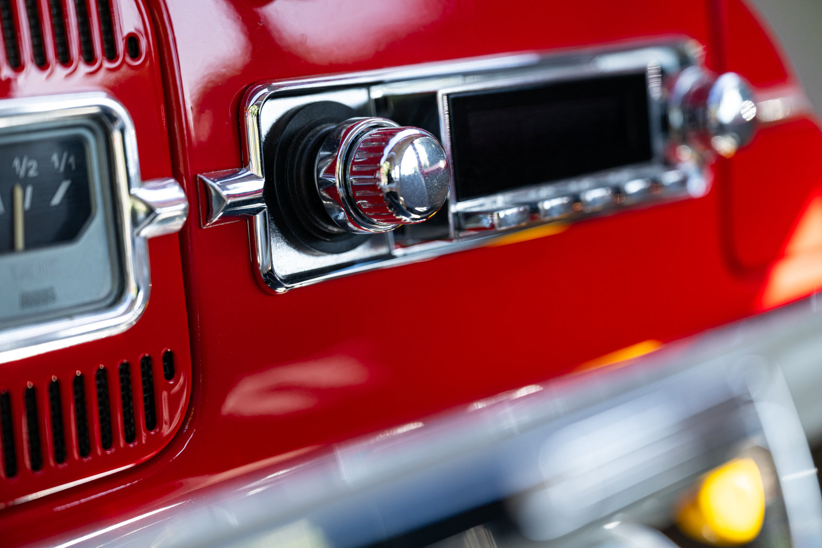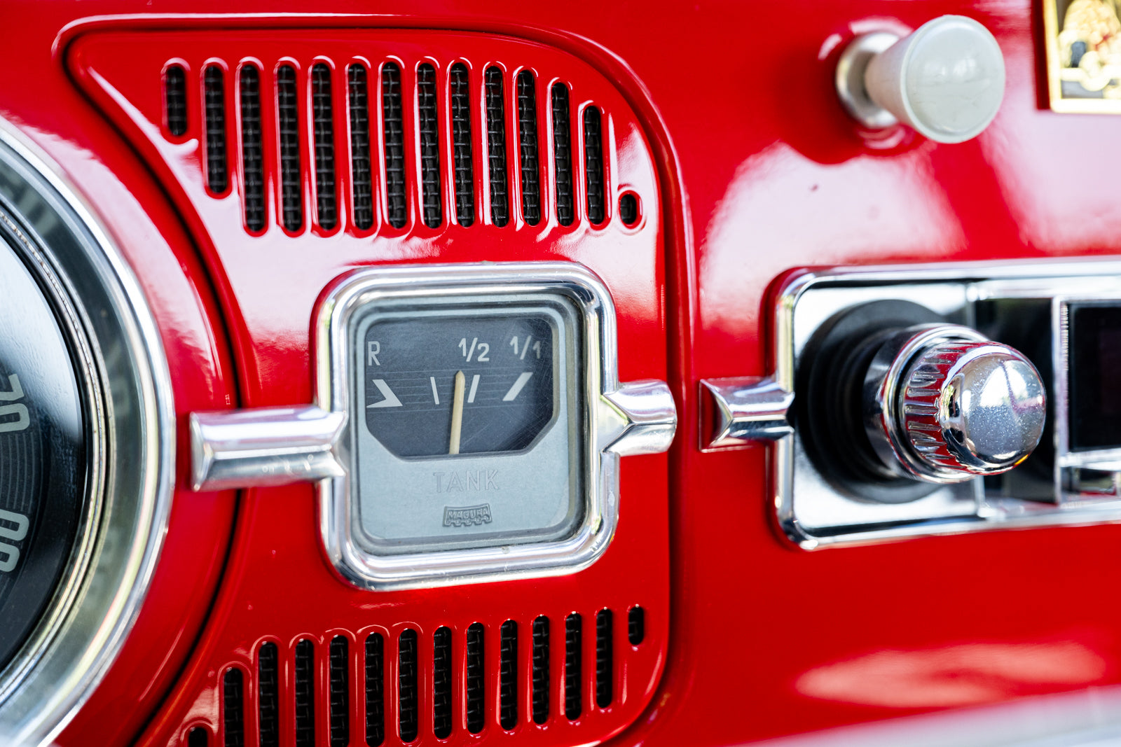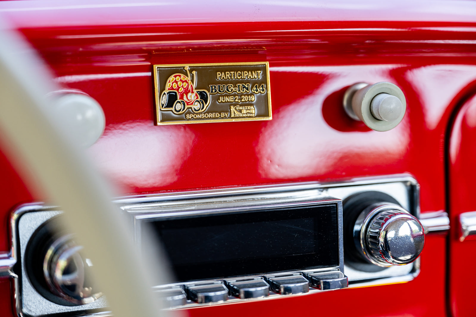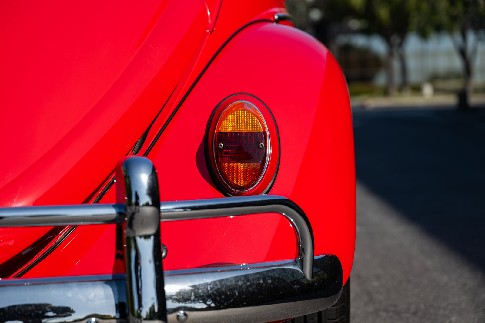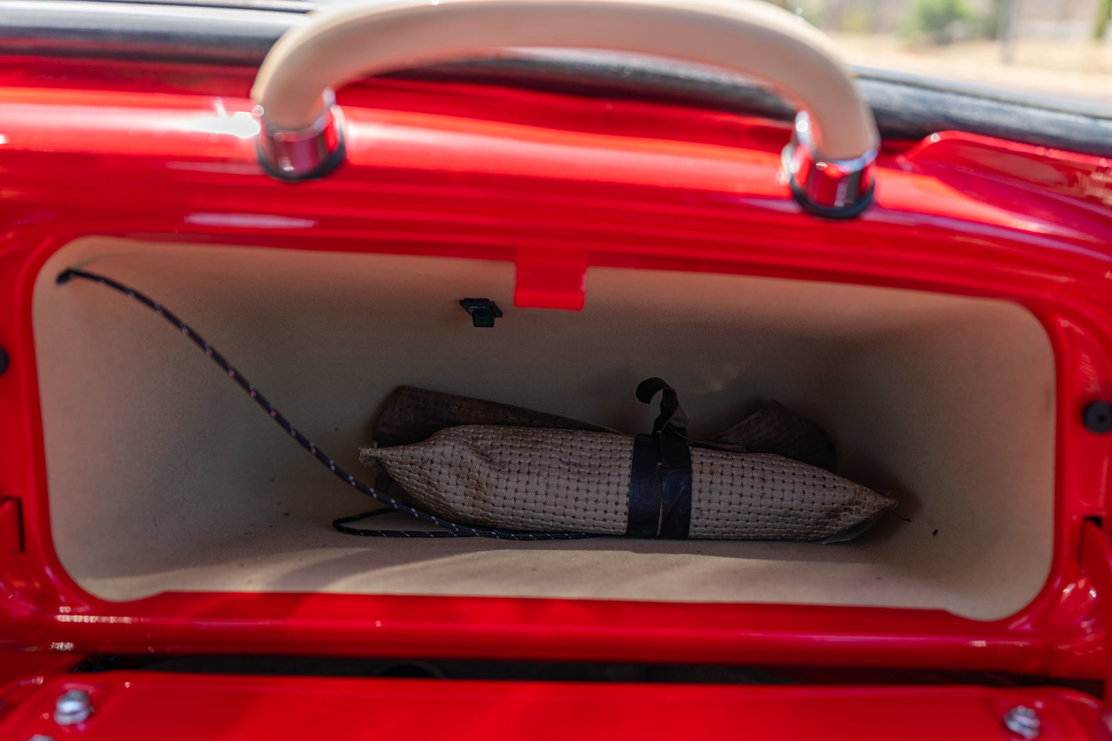 Fuchs-style 15″ wheels wear Porsche-crest center caps and 145-series Nankang CX668 tires up front and 205/70 Westlake Radial RP-18 tires out back. Stopping power is provided by four-wheel disc brakes with red-finished calipers and front drilled and slotted rotors.