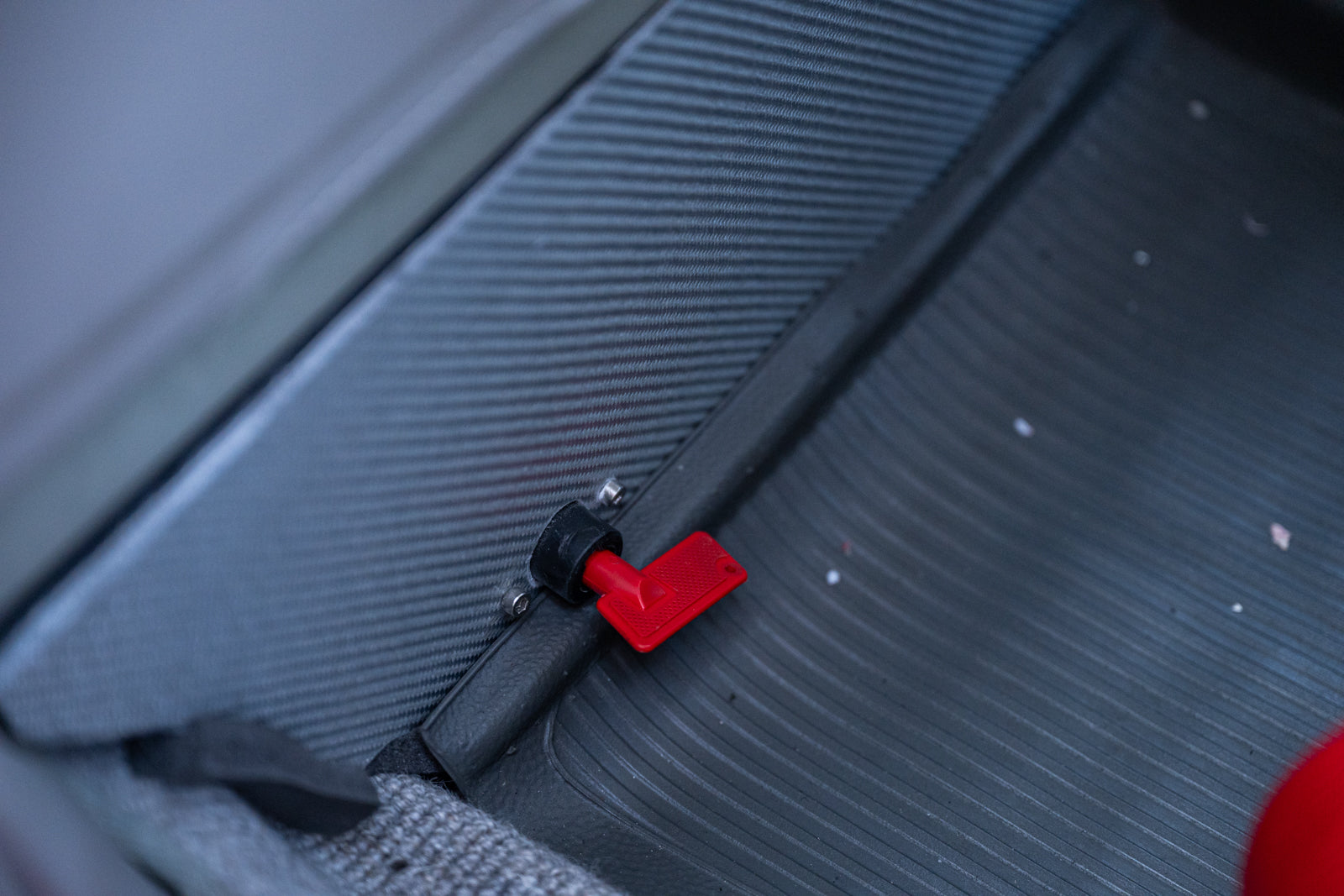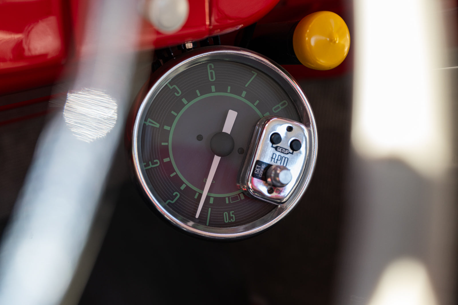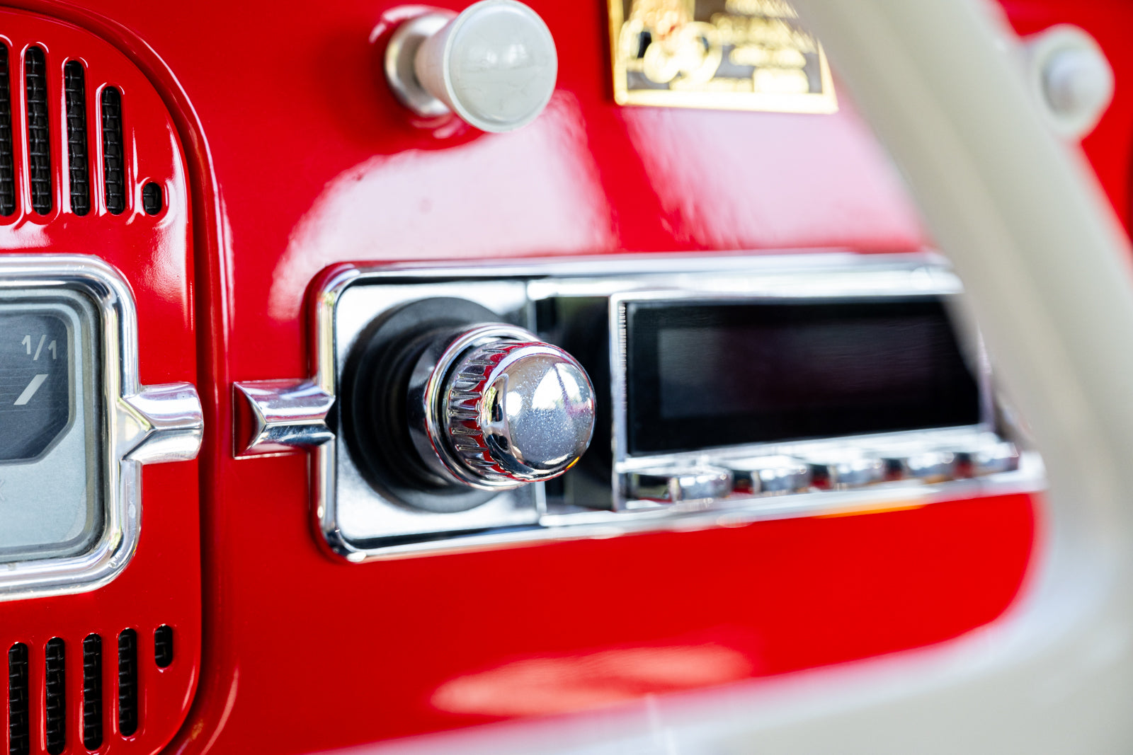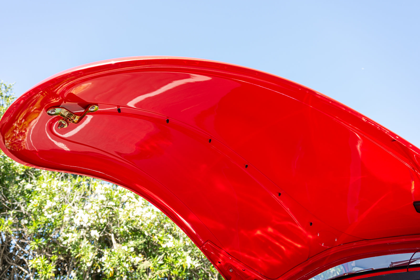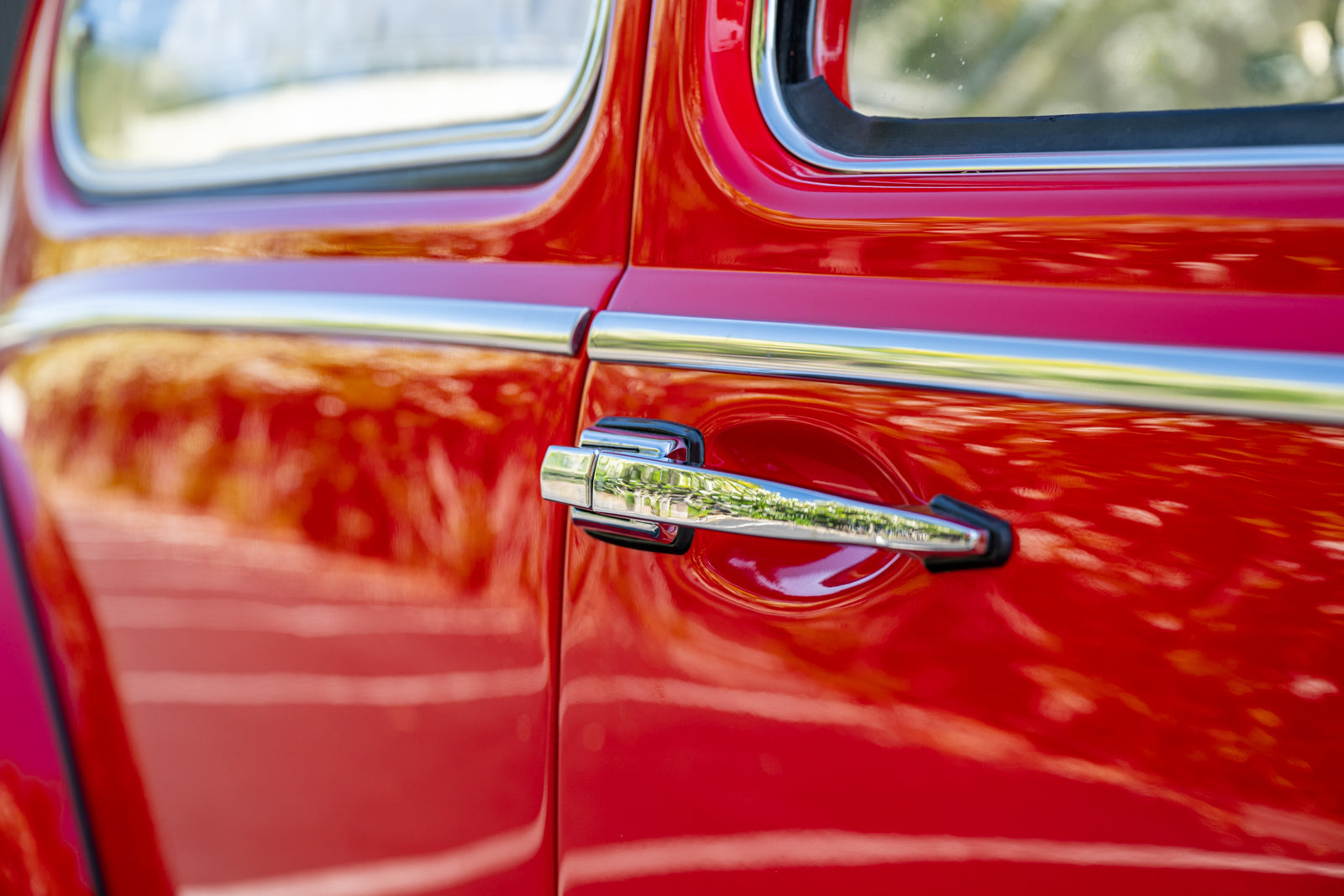 Fuchs-style 15″ wheels wear Porsche-crest center caps and 145-series Nankang CX668 tires up front and 205/70 Westlake Radial RP-18 tires out back. Stopping power is provided by four-wheel disc brakes with red-finished calipers and front drilled and slotted rotors.