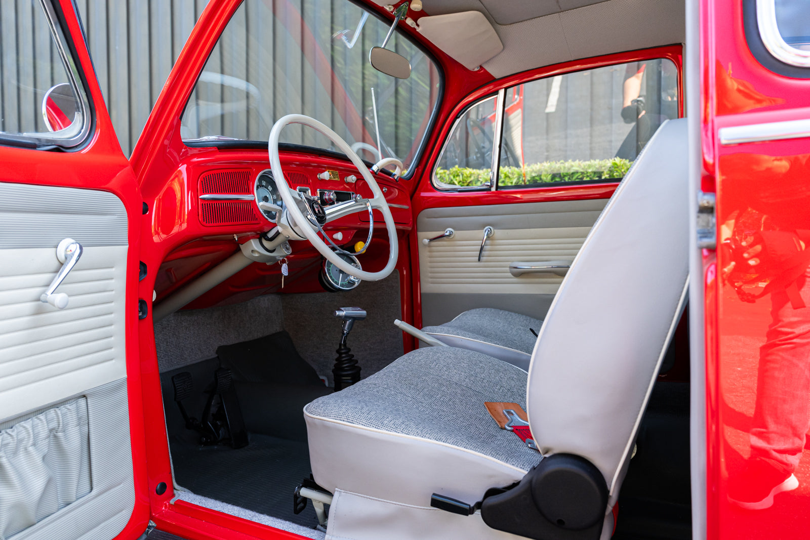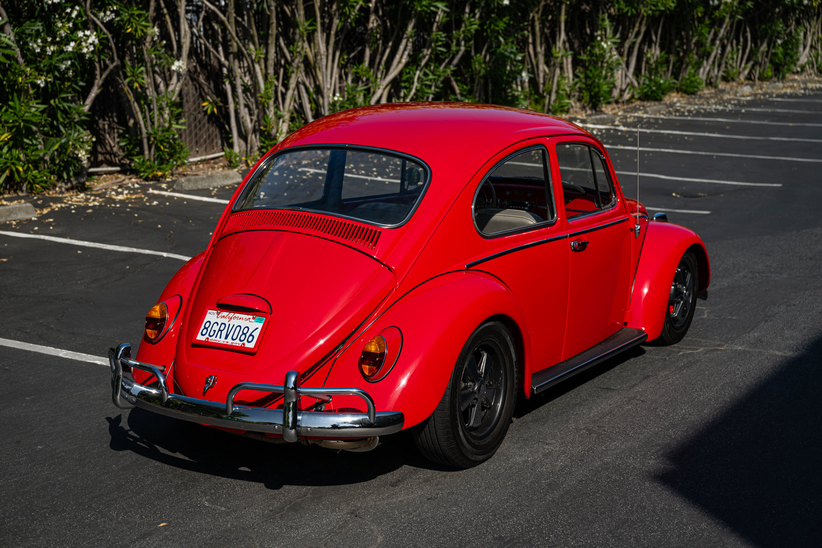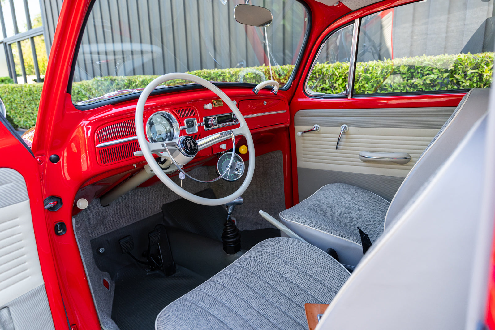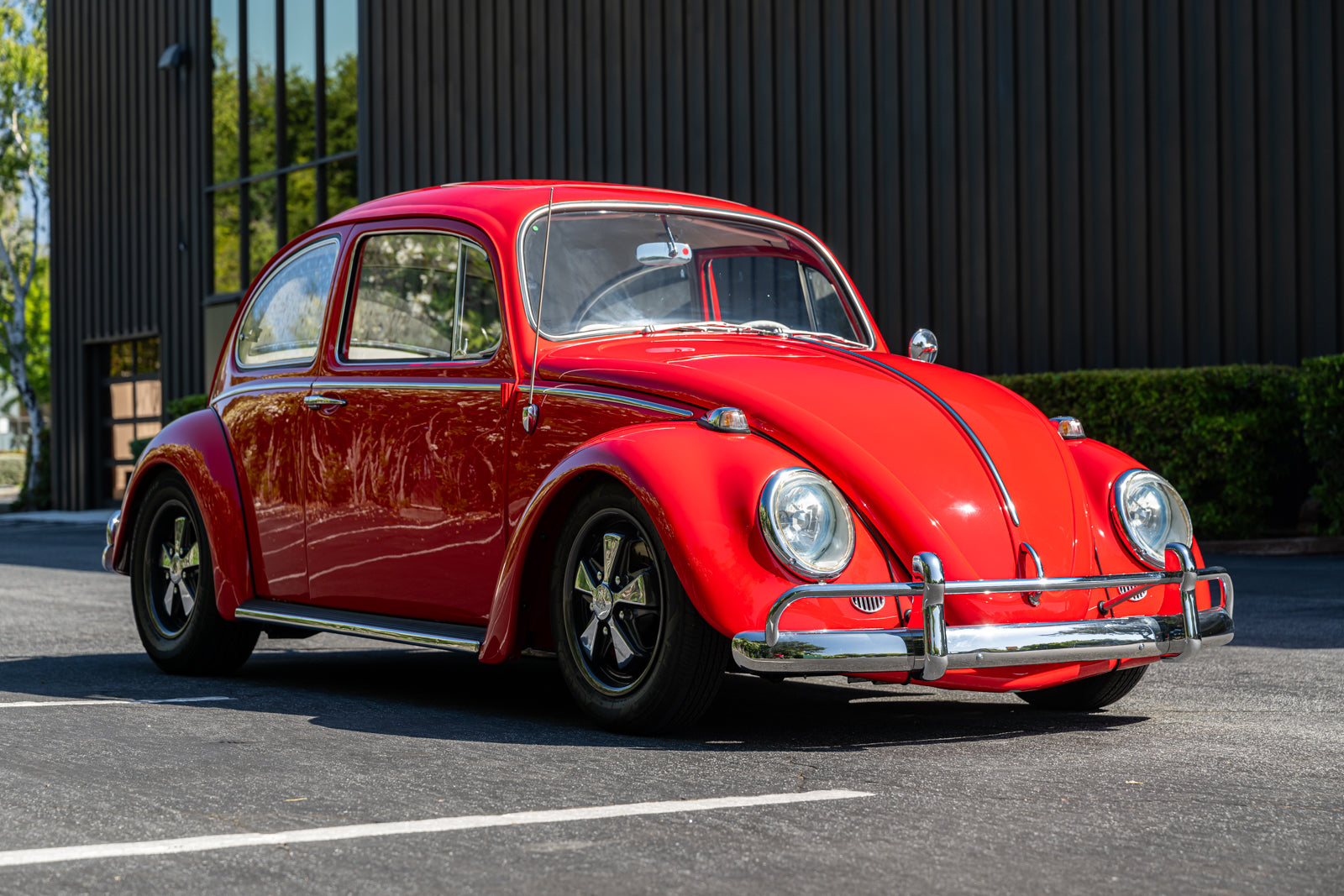 This 1965 Volkswagen Beetle was acquired by the seller in 2015, reportedly from the first owner who had imported the car to the US from Germany in 1965. The car underwent a mechanical and cosmetic refurbishment during current ownership that included removing the body from the frame, repainting the body in red, reupholstering the interior in gray, fitting a modified 2,275cc flat-four, and replacing the four-speed manual transaxle. Equipment includes Weber carburetors, an A-1 Sidewinder exhaust system, 15″ Fuchs-style wheels, four-wheel disc brakes, a sunroof, chrome bumpers and trim, a Gene Berg shifter, and a RetroSound radio. This Beetle is now offered with a refurbishment photo book, service records, build receipts, import documents, manufacturer’s literature, and a clean California title in the seller’s name.