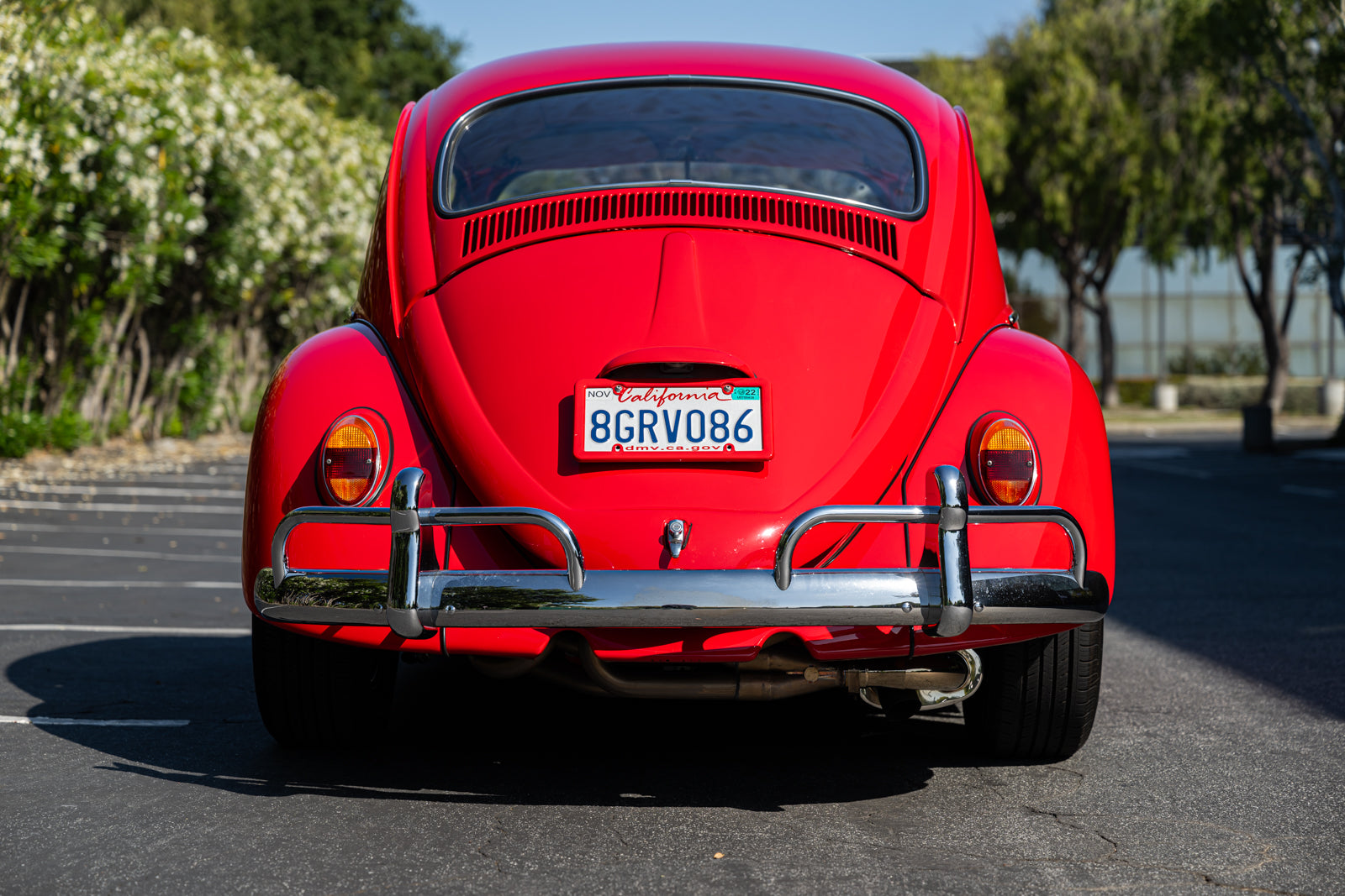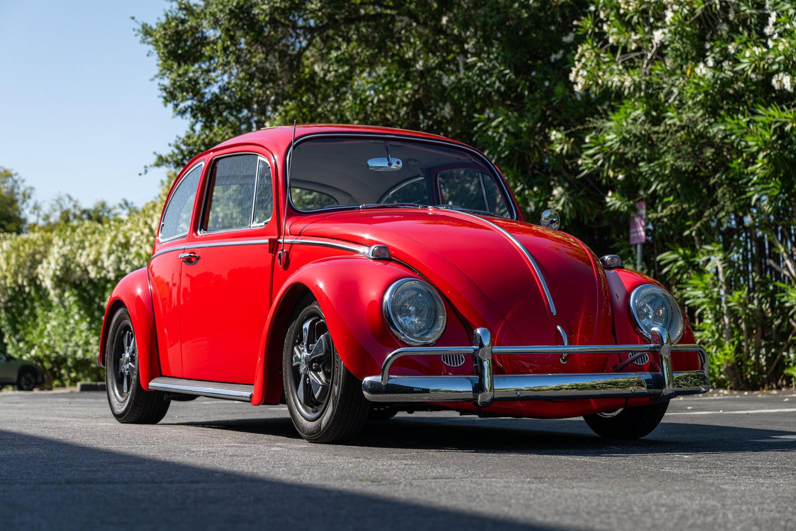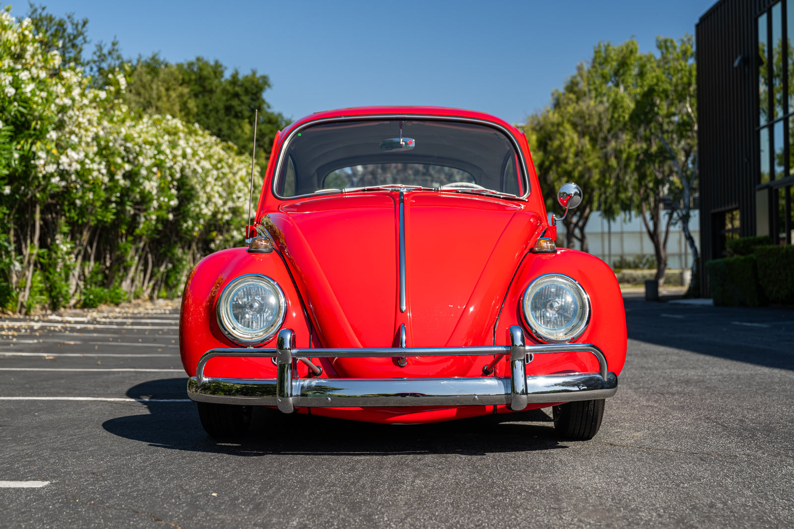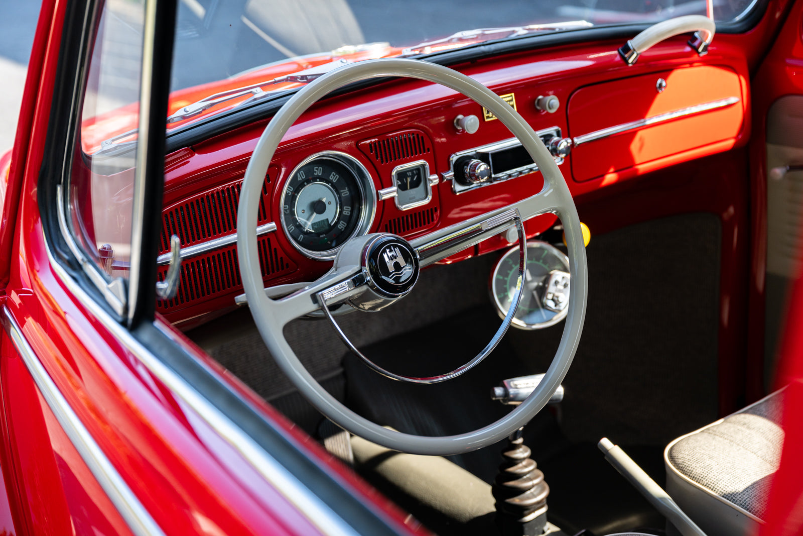 This 1965 Volkswagen Beetle was acquired by the seller in 2015, reportedly from the first owner who had imported the car to the US from Germany in 1965. The car underwent a mechanical and cosmetic refurbishment during current ownership that included removing the body from the frame, repainting the body in red, reupholstering the interior in gray, fitting a modified 2,275cc flat-four, and replacing the four-speed manual transaxle. Equipment includes Weber carburetors, an A-1 Sidewinder exhaust system, 15″ Fuchs-style wheels, four-wheel disc brakes, a sunroof, chrome bumpers and trim, a Gene Berg shifter, and a RetroSound radio. This Beetle is now offered with a refurbishment photo book, service records, build receipts, import documents, manufacturer’s literature, and a clean California title in the seller’s name.