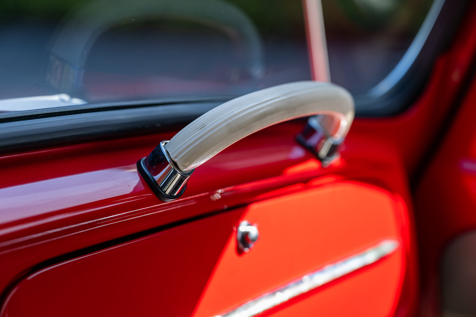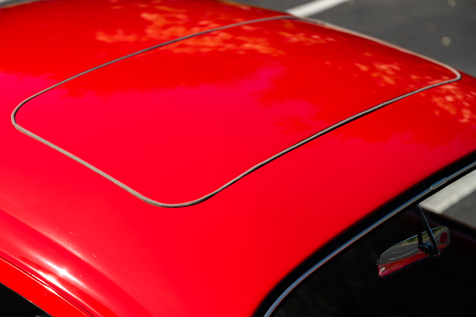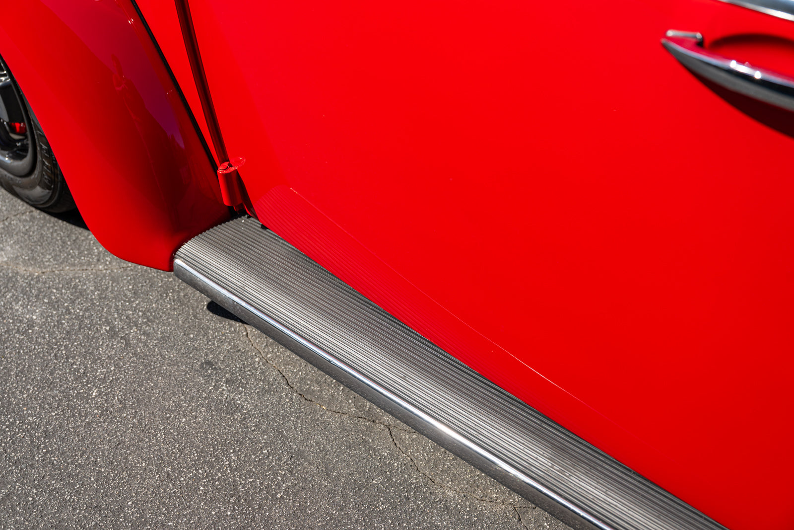 The body was removed from the frame in 2018 and body repairs were performed before it was repainted in its current shade of red. Exterior details include a left side mirror, a sunroof, running boards, and chrome bumpers with overriders. The seller notes the front and rear aprons have been replaced.