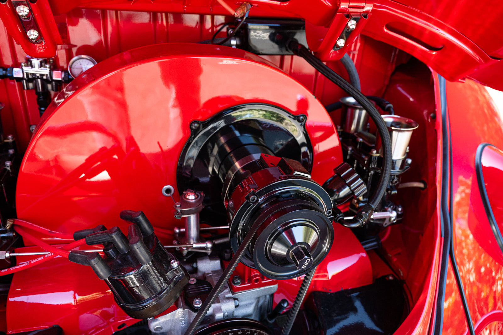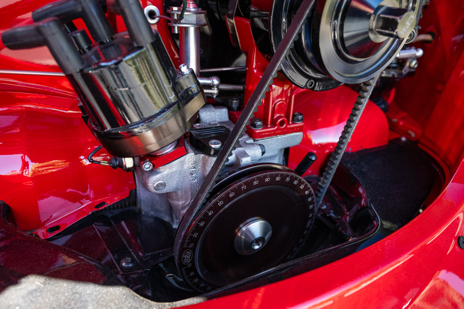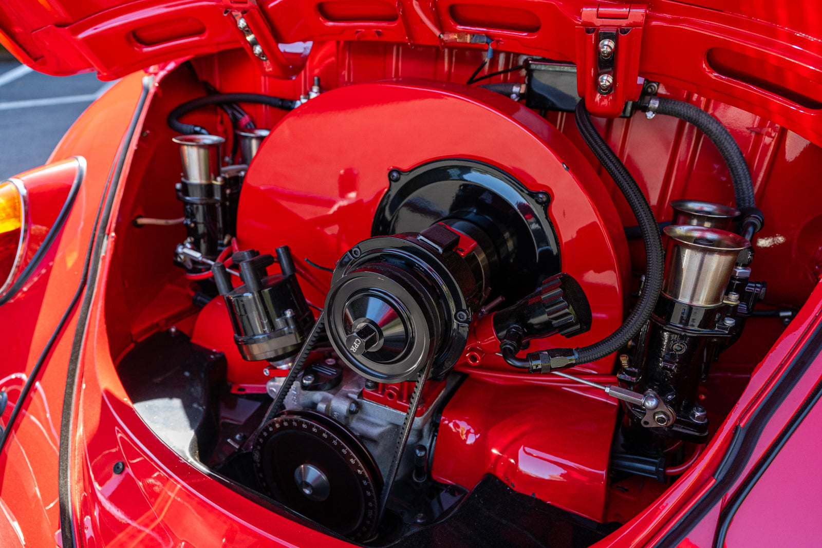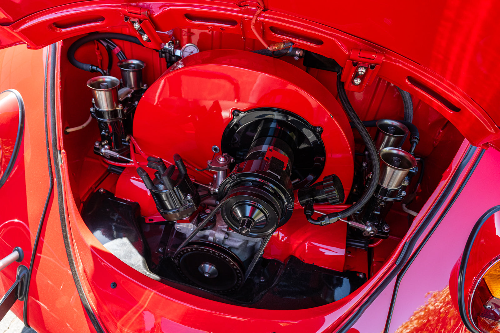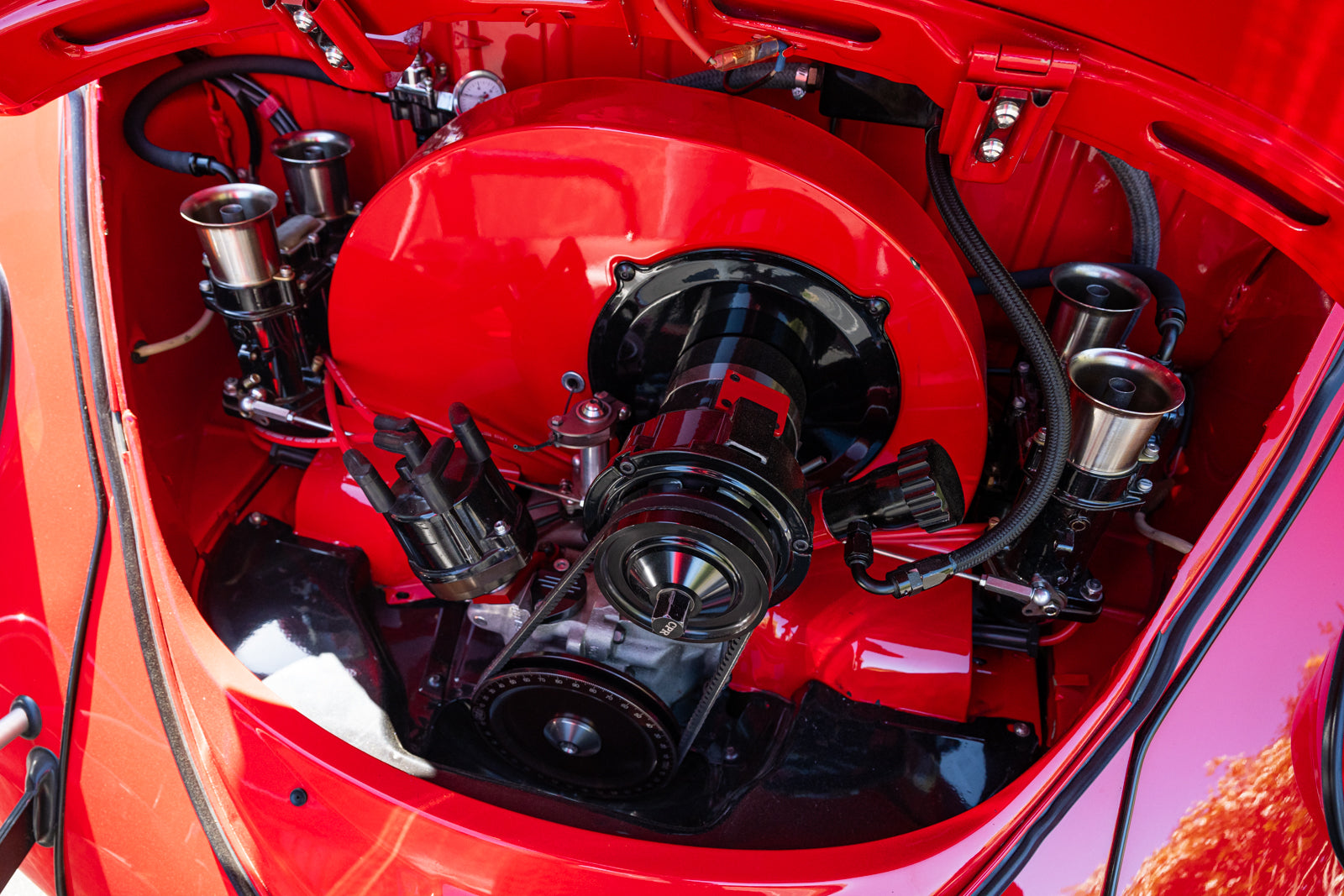 The 2,275cc flat-four was sourced from Chico Performance Racing in California and was installed during current ownership. Features include Weber IDA 48mm carburetors, a Stealthanator 75-amp alternator, and a CB Performance crankshaft pulley.