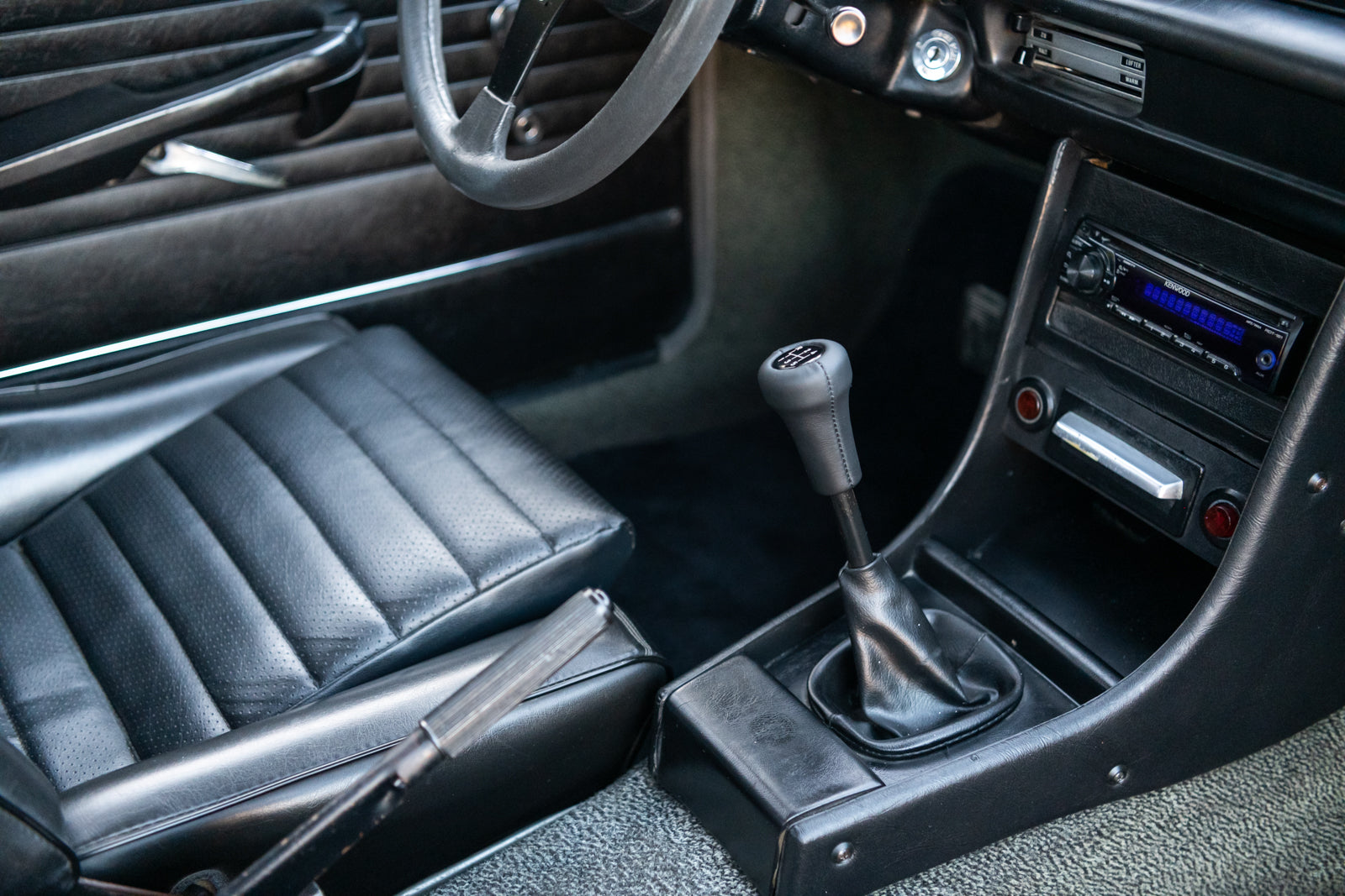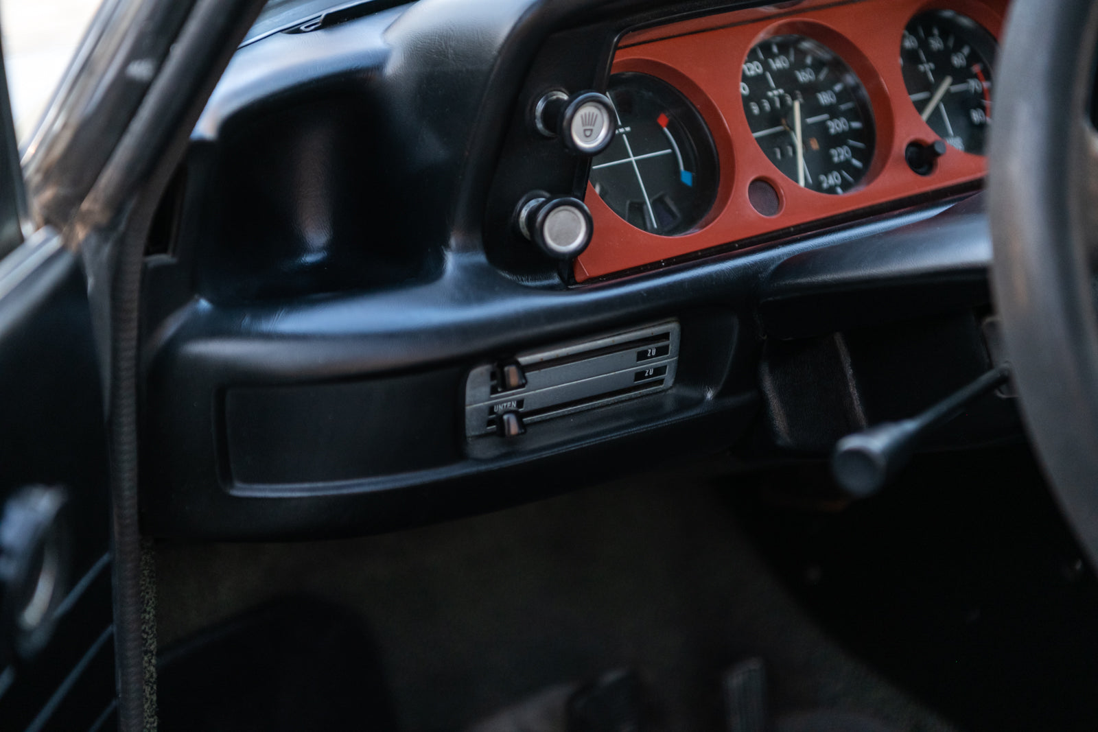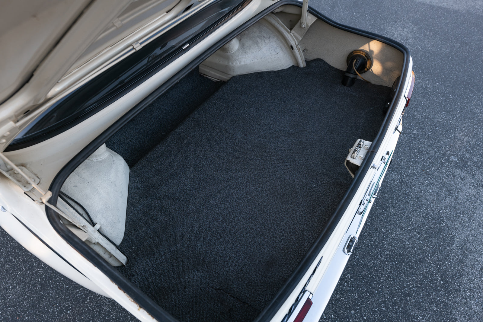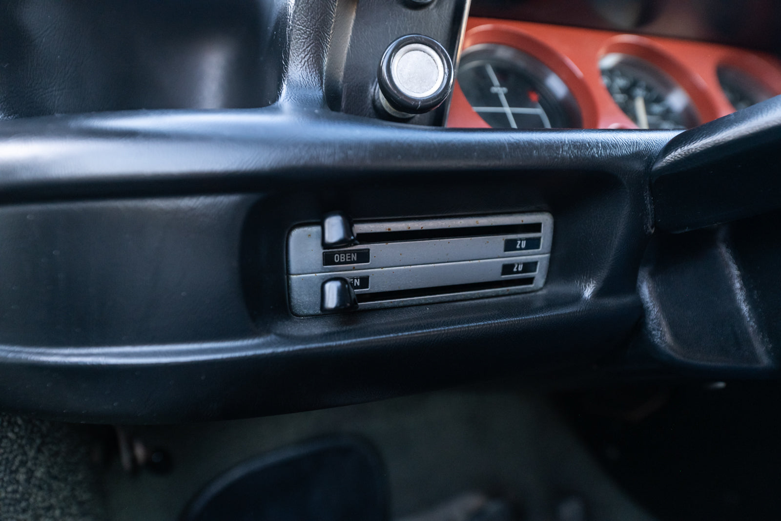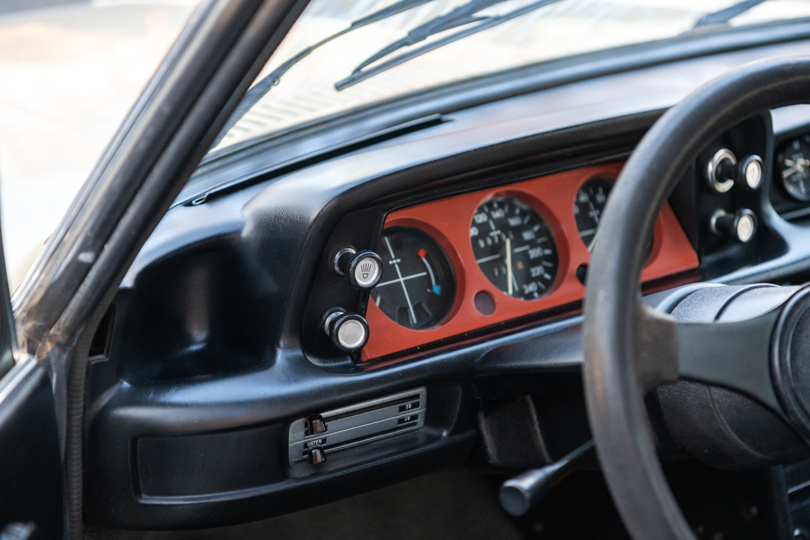 Largely original and correct, the body is straight and solid with no rust or evidence if prior rust repairs. The car has been repainted and shows the good luster typical of the best period enamels. Overall the exterior is in very good condition with correct side and front stripes. The factory riveted on wheel flares are in excellent condition all around. Near new tires are mounted on rare Mahle alloy rims and a full size spare on a matching wheel is in the boot. A discreet spoiler tops the clamshell trunk lid.