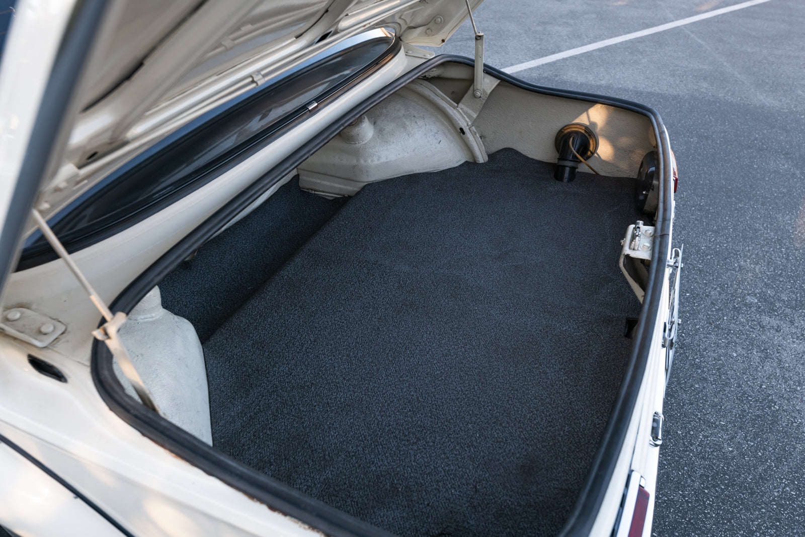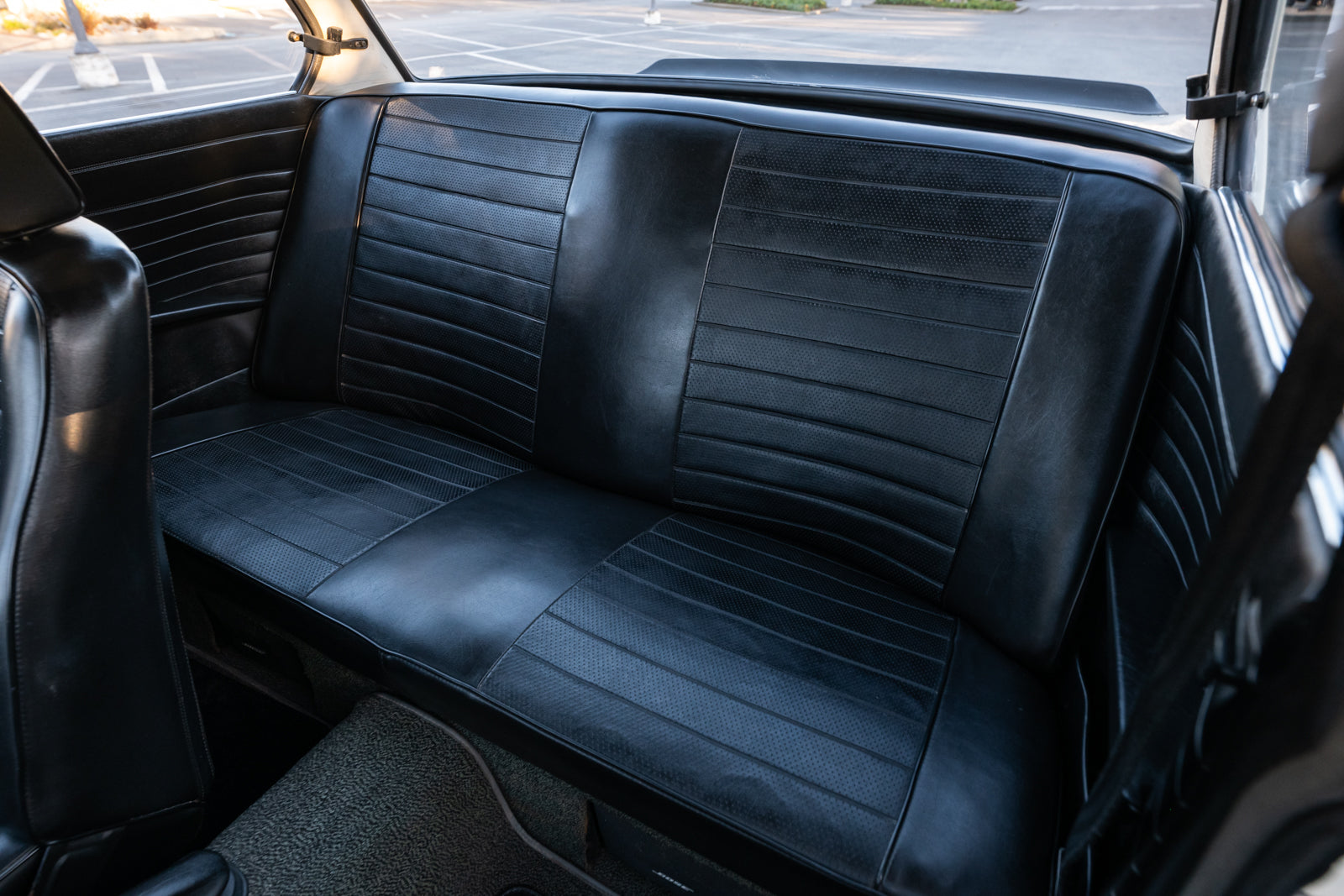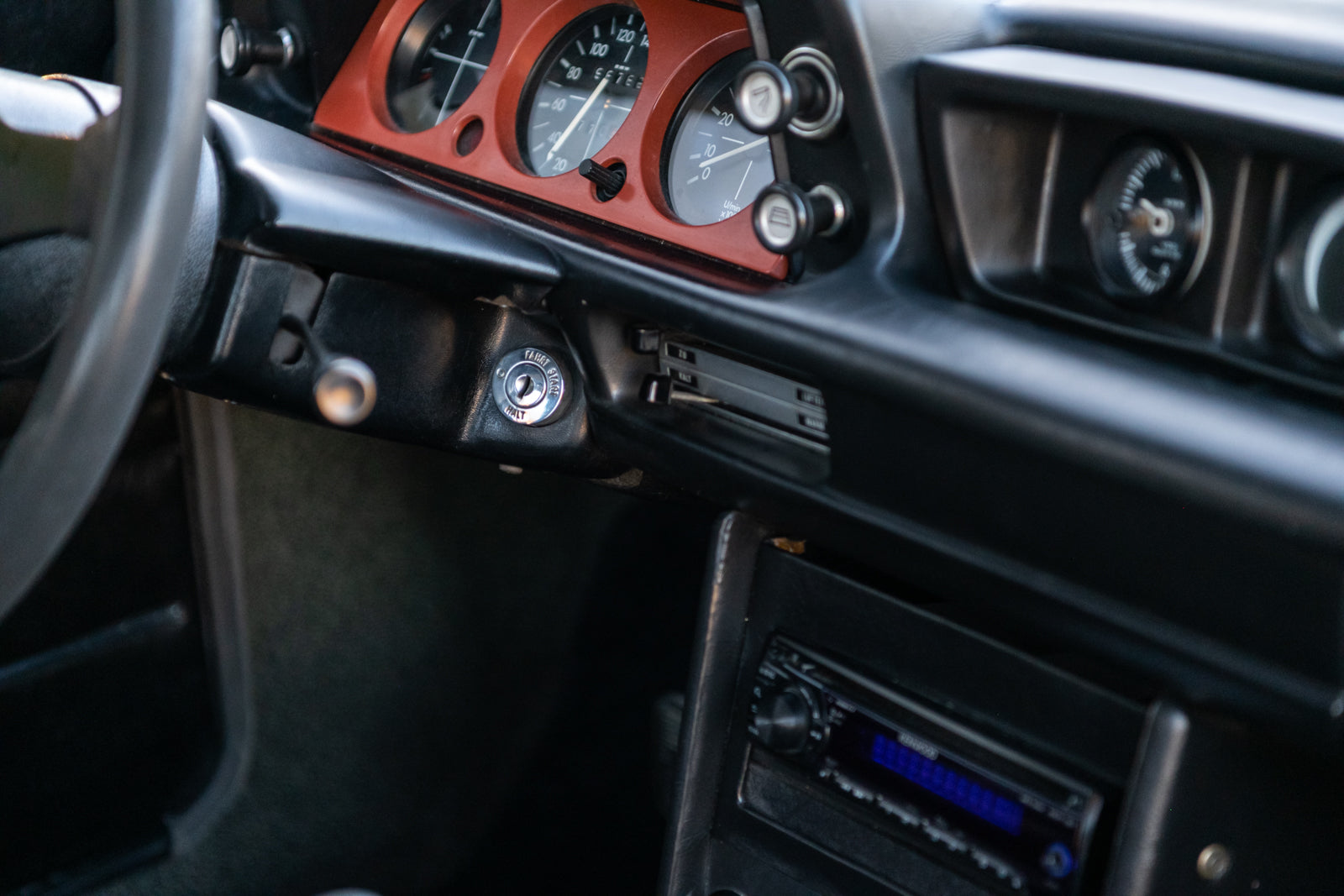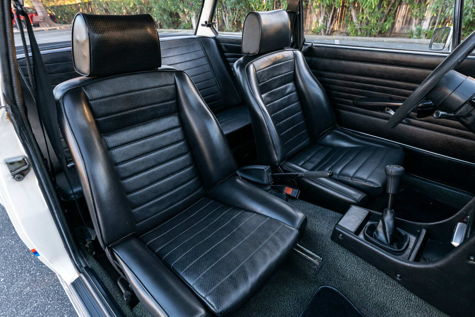 Largely original and correct, the body is straight and solid with no rust or evidence if prior rust repairs. The car has been repainted and shows the good luster typical of the best period enamels. Overall the exterior is in very good condition with correct side and front stripes. The factory riveted on wheel flares are in excellent condition all around. Near new tires are mounted on rare Mahle alloy rims and a full size spare on a matching wheel is in the boot. A discreet spoiler tops the clamshell trunk lid.