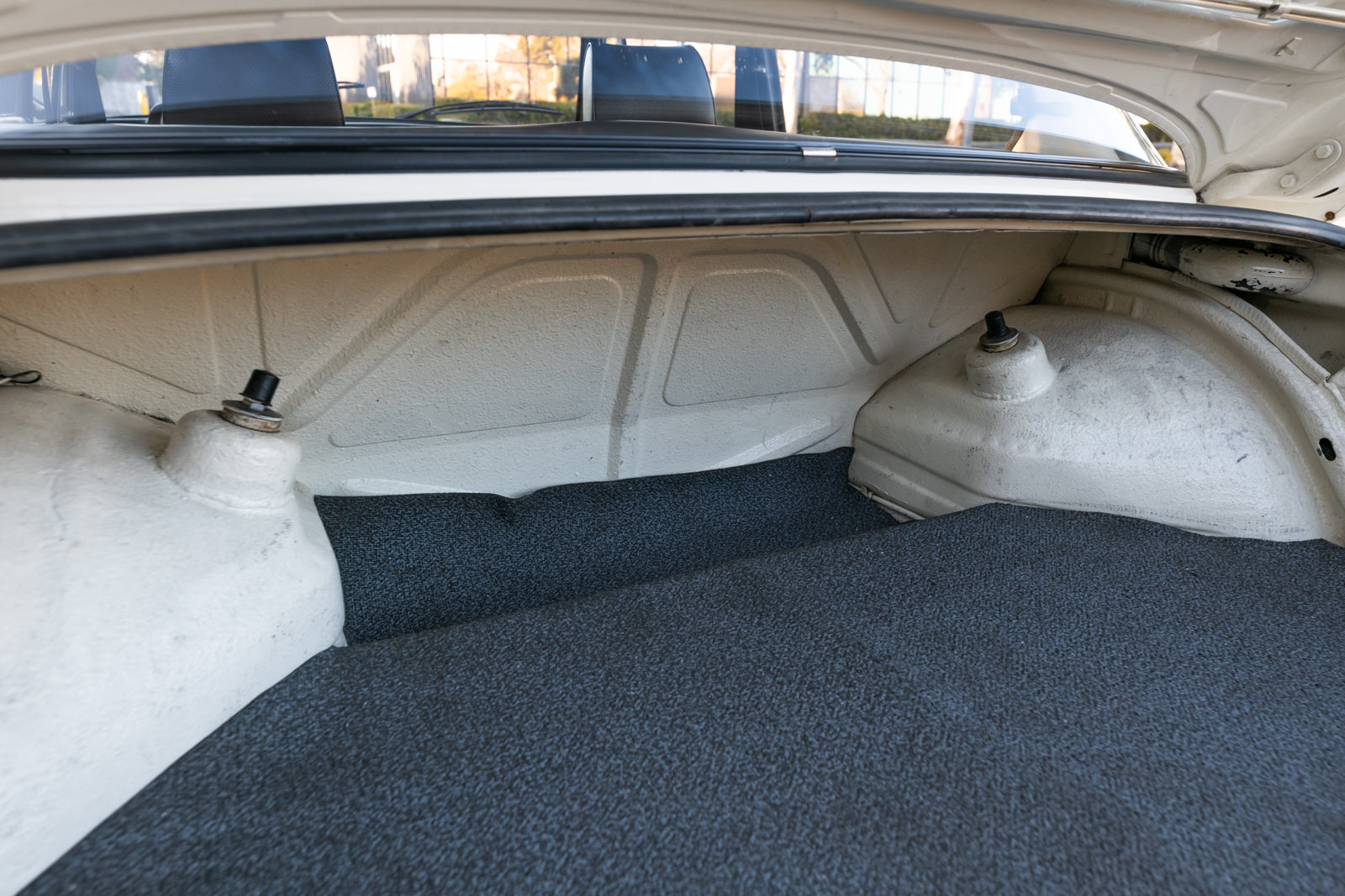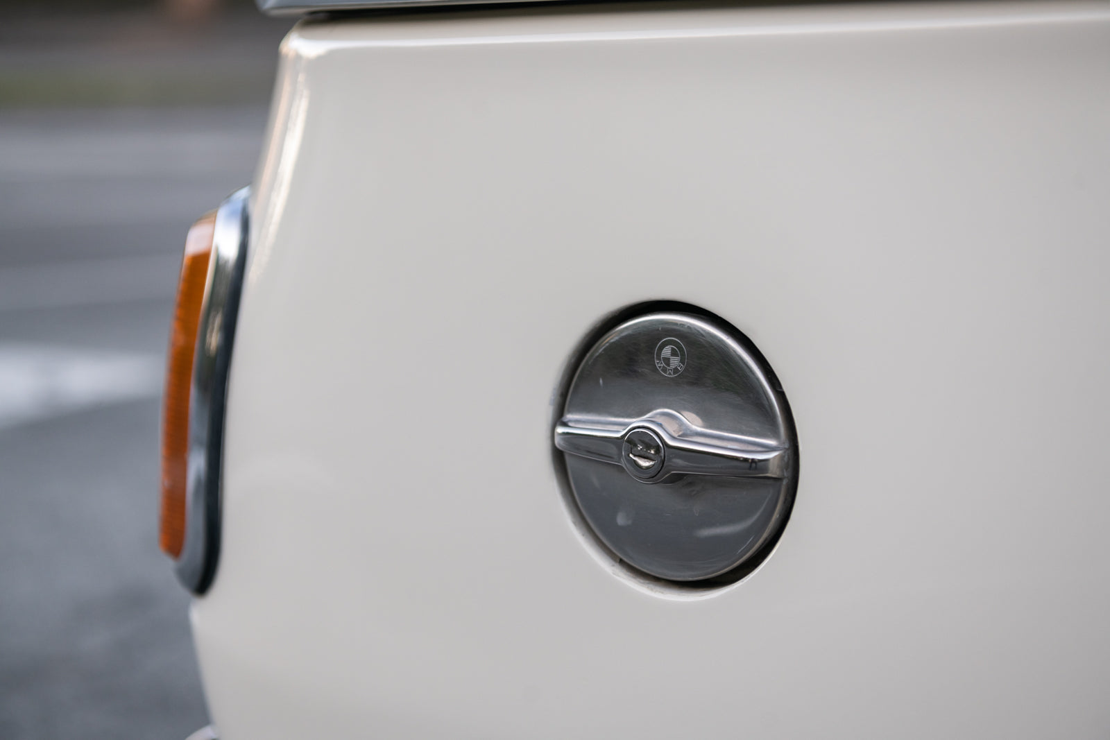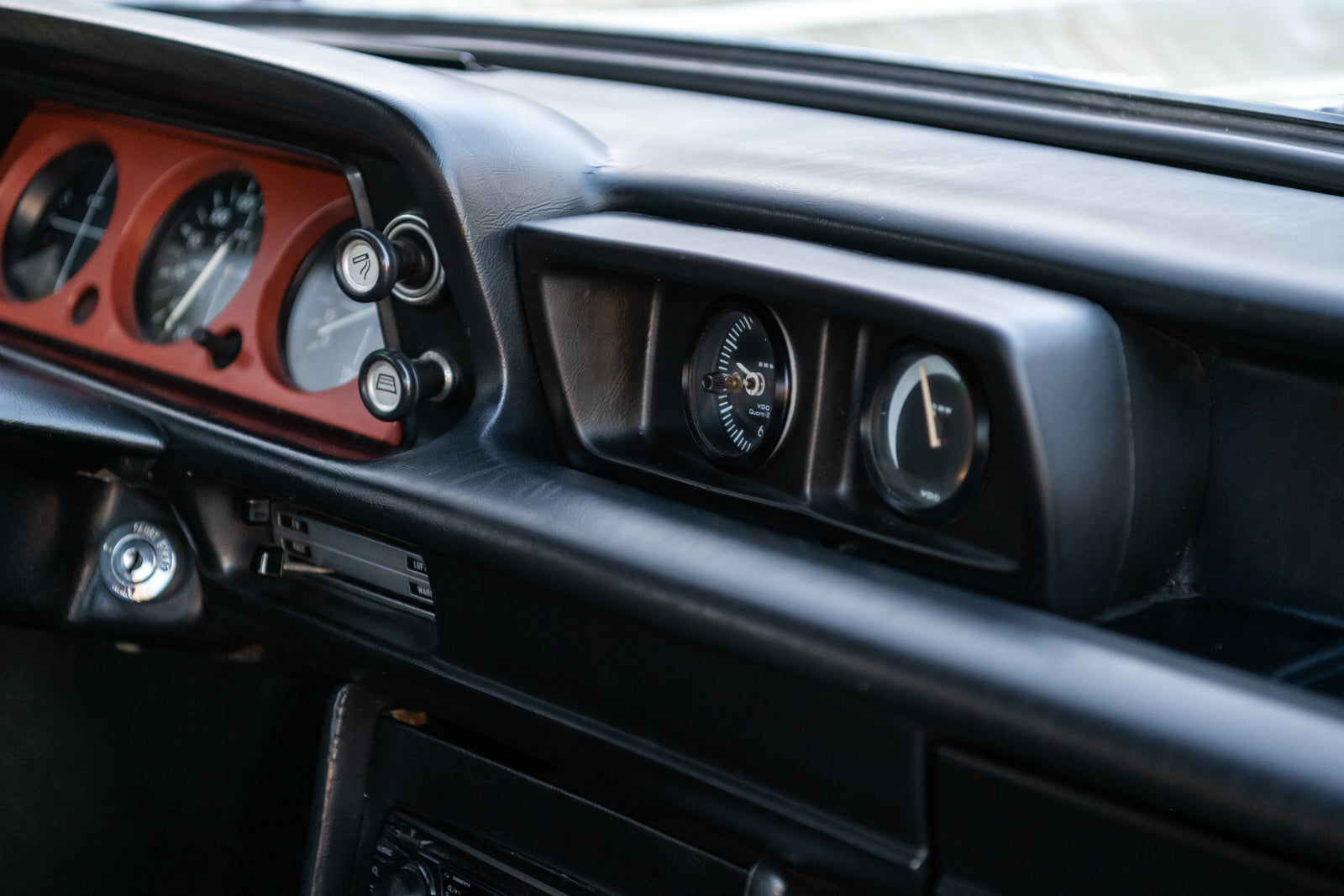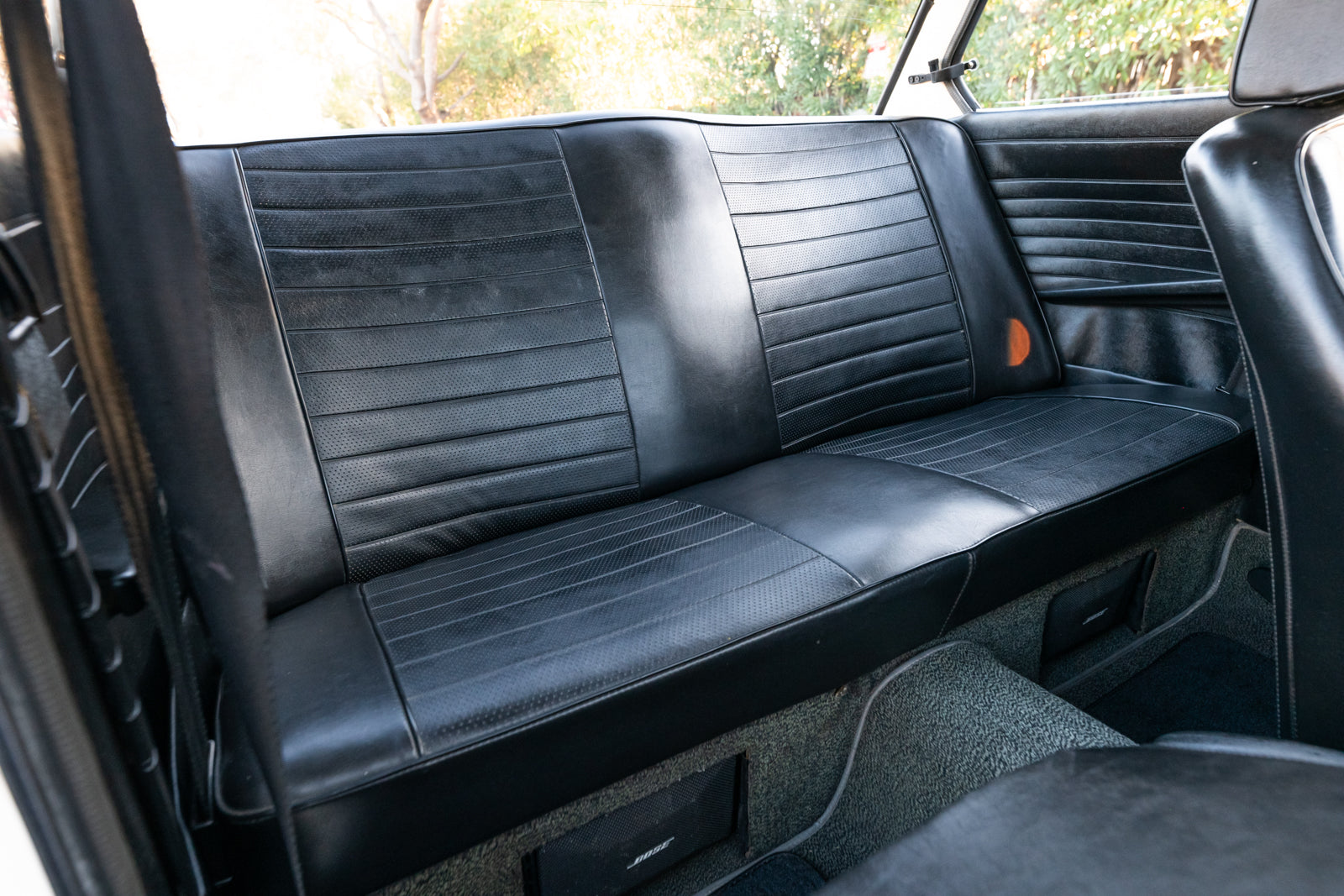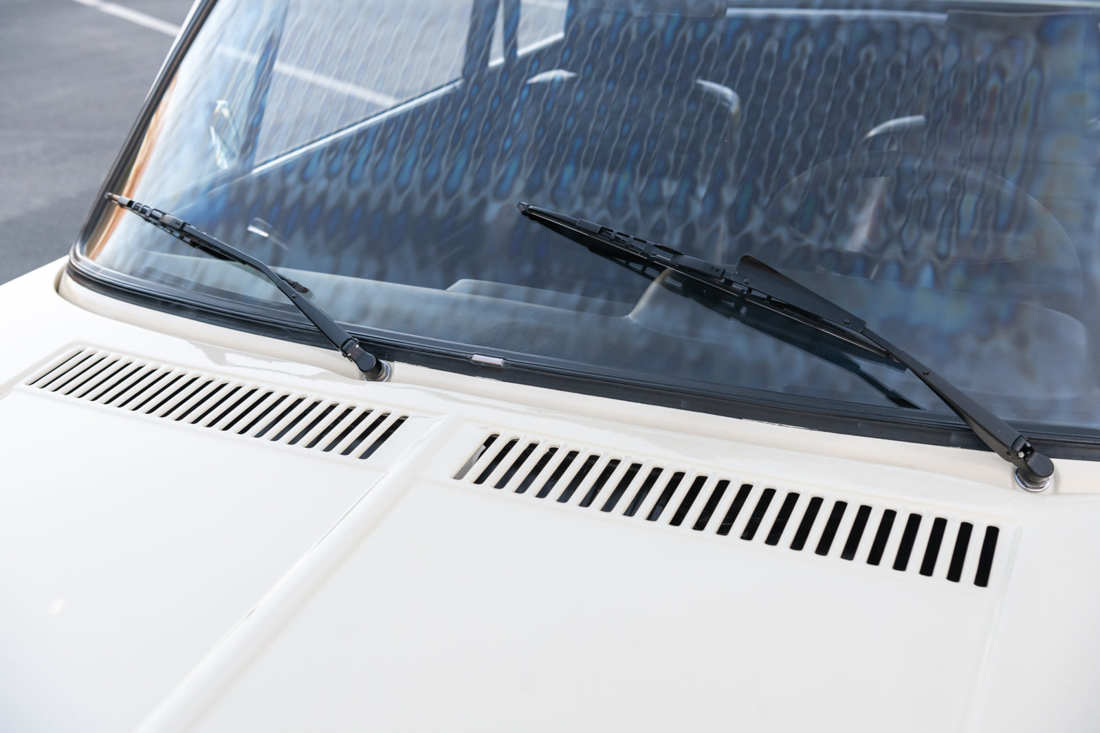 Largely original and correct, the body is straight and solid with no rust or evidence if prior rust repairs. The car has been repainted and shows the good luster typical of the best period enamels. Overall the exterior is in very good condition with correct side and front stripes. The factory riveted on wheel flares are in excellent condition all around. Near new tires are mounted on rare Mahle alloy rims and a full size spare on a matching wheel is in the boot. A discreet spoiler tops the clamshell trunk lid.