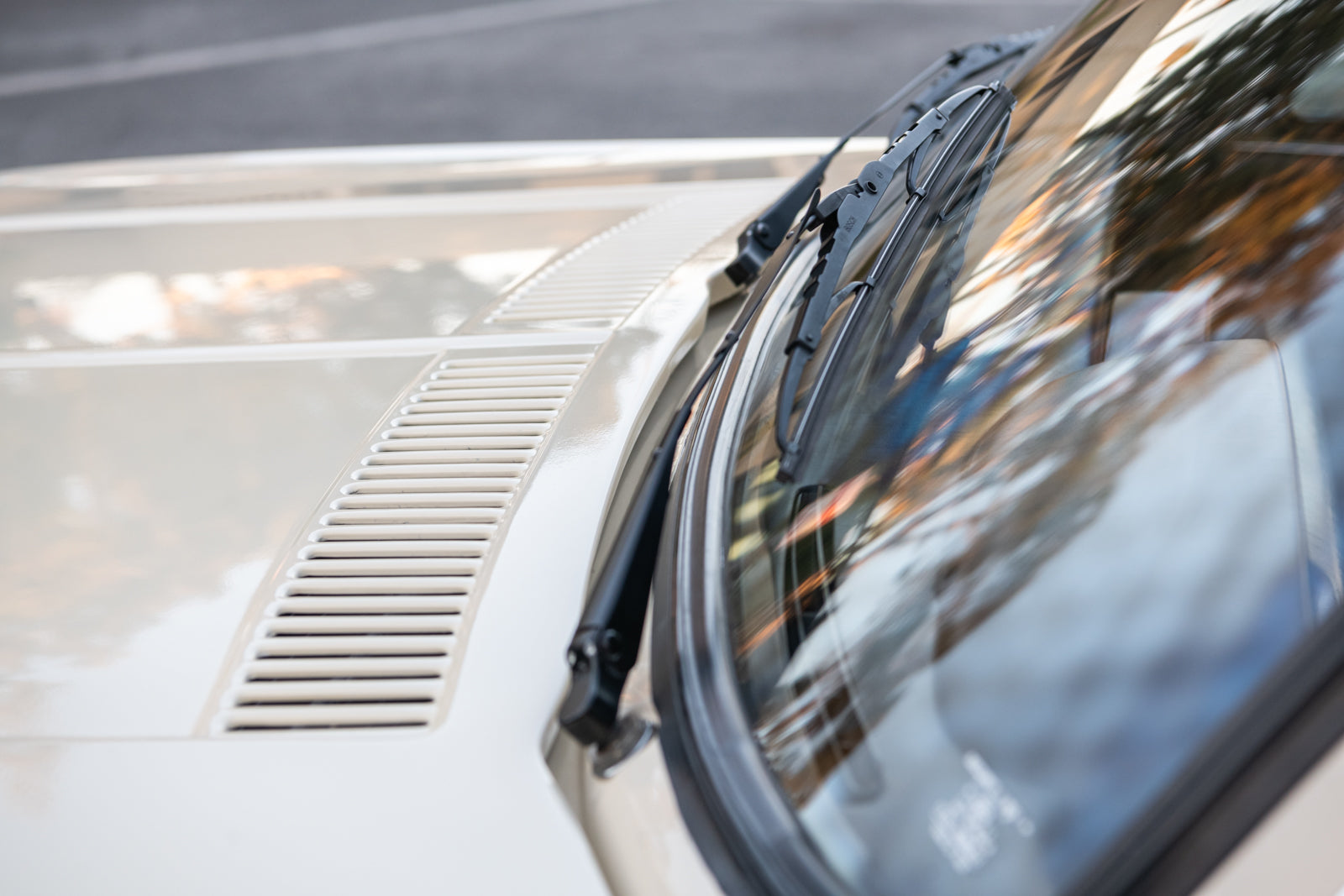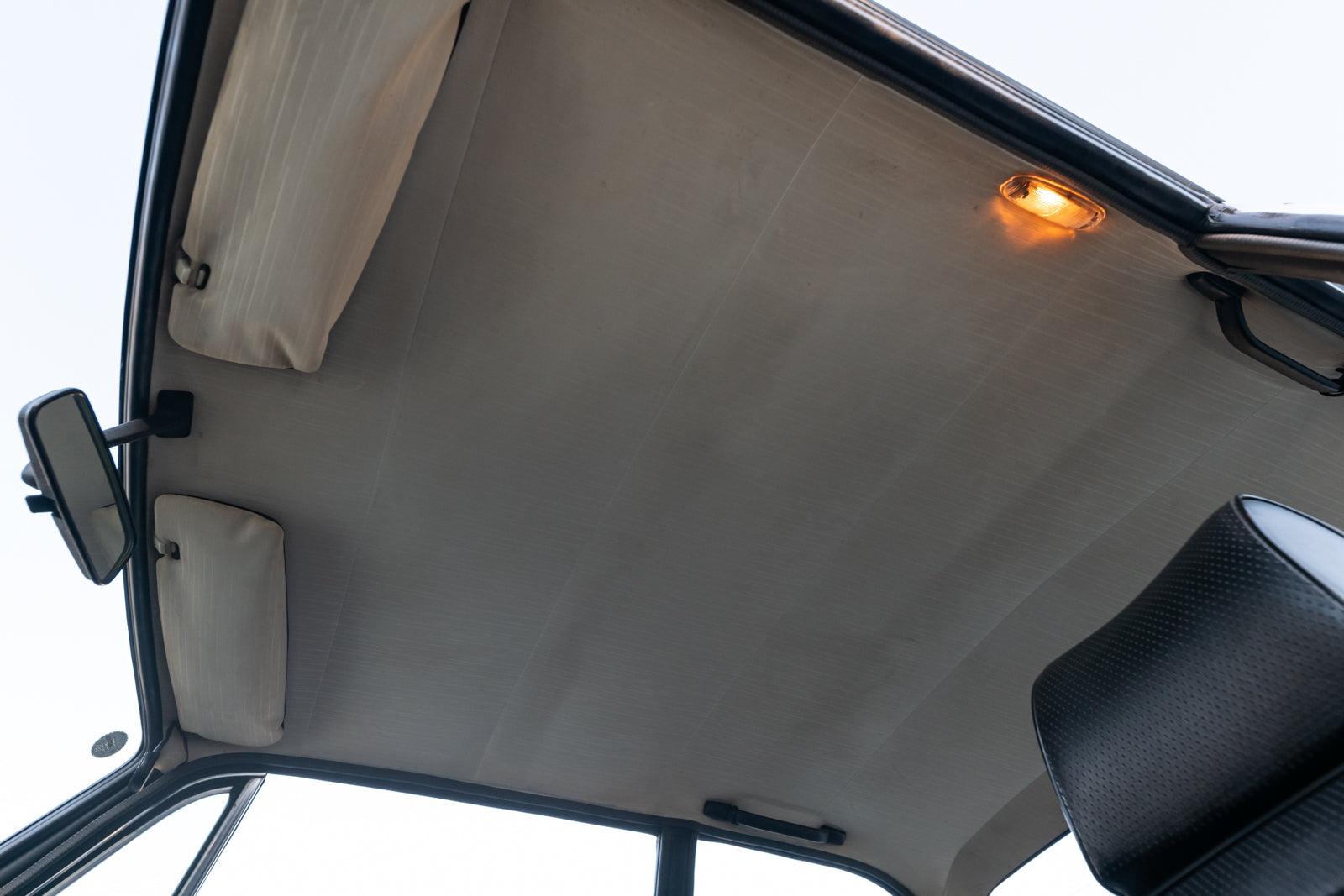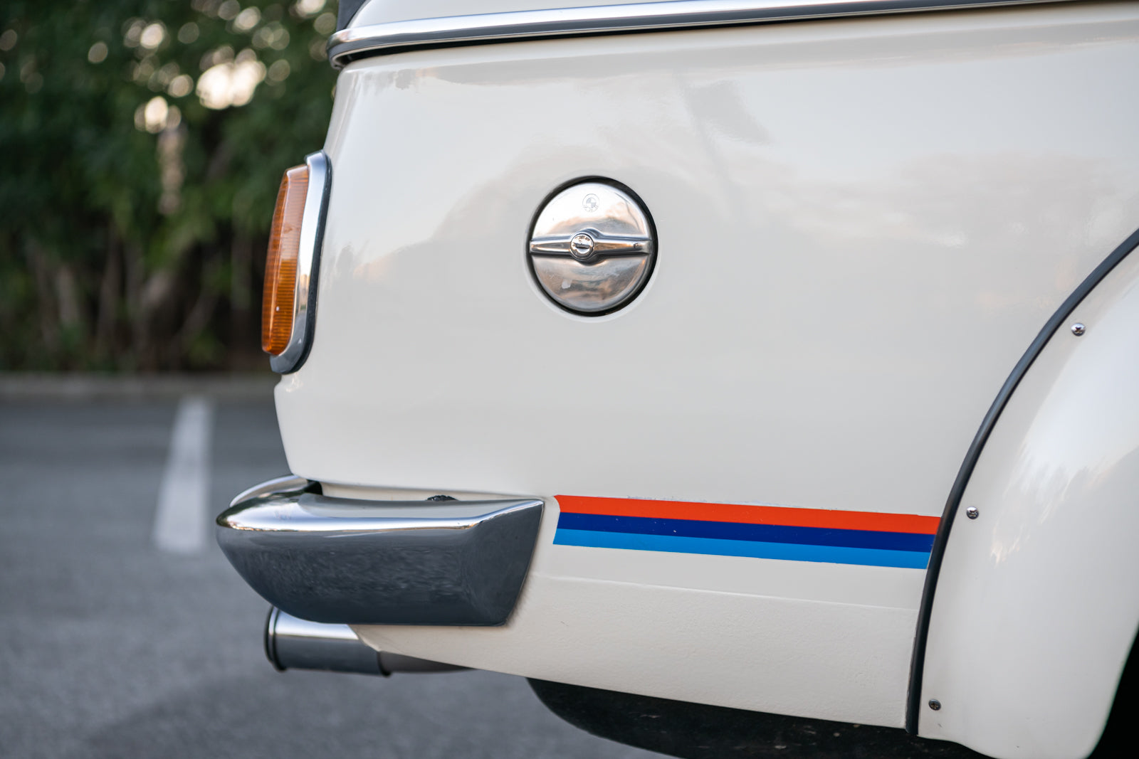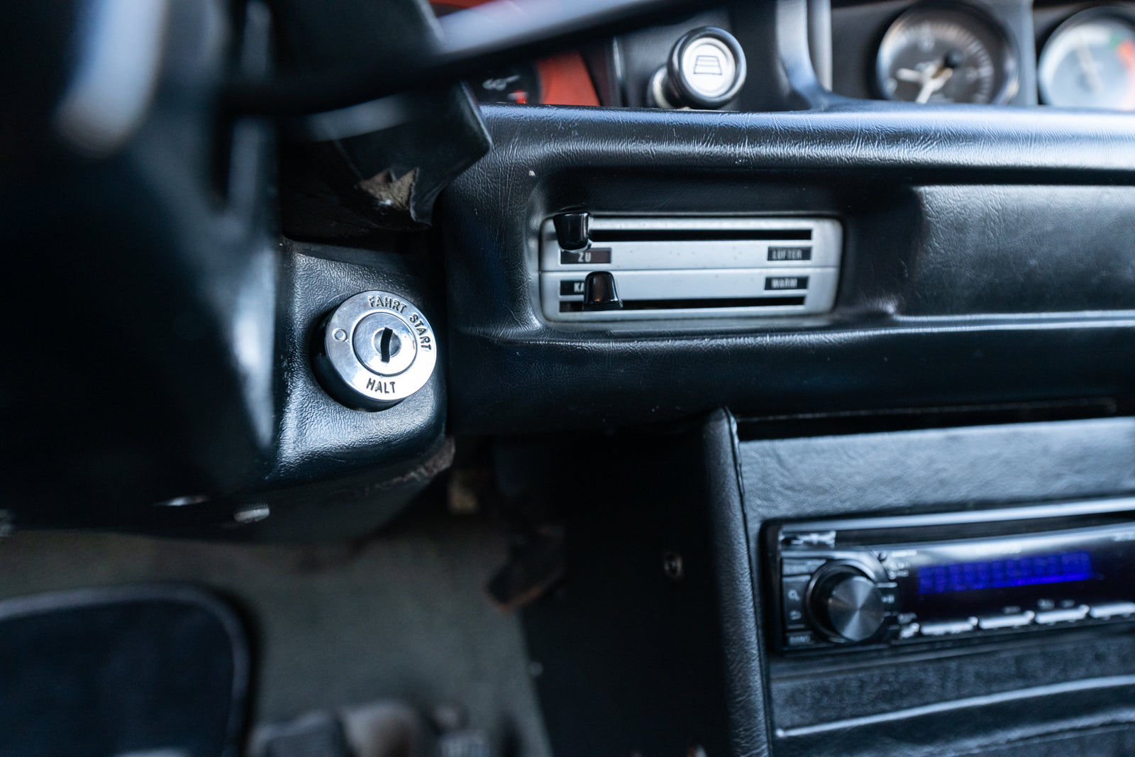 Largely original and correct, the body is straight and solid with no rust or evidence if prior rust repairs. The car has been repainted and shows the good luster typical of the best period enamels. Overall the exterior is in very good condition with correct side and front stripes. The factory riveted on wheel flares are in excellent condition all around. Near new tires are mounted on rare Mahle alloy rims and a full size spare on a matching wheel is in the boot. A discreet spoiler tops the clamshell trunk lid.