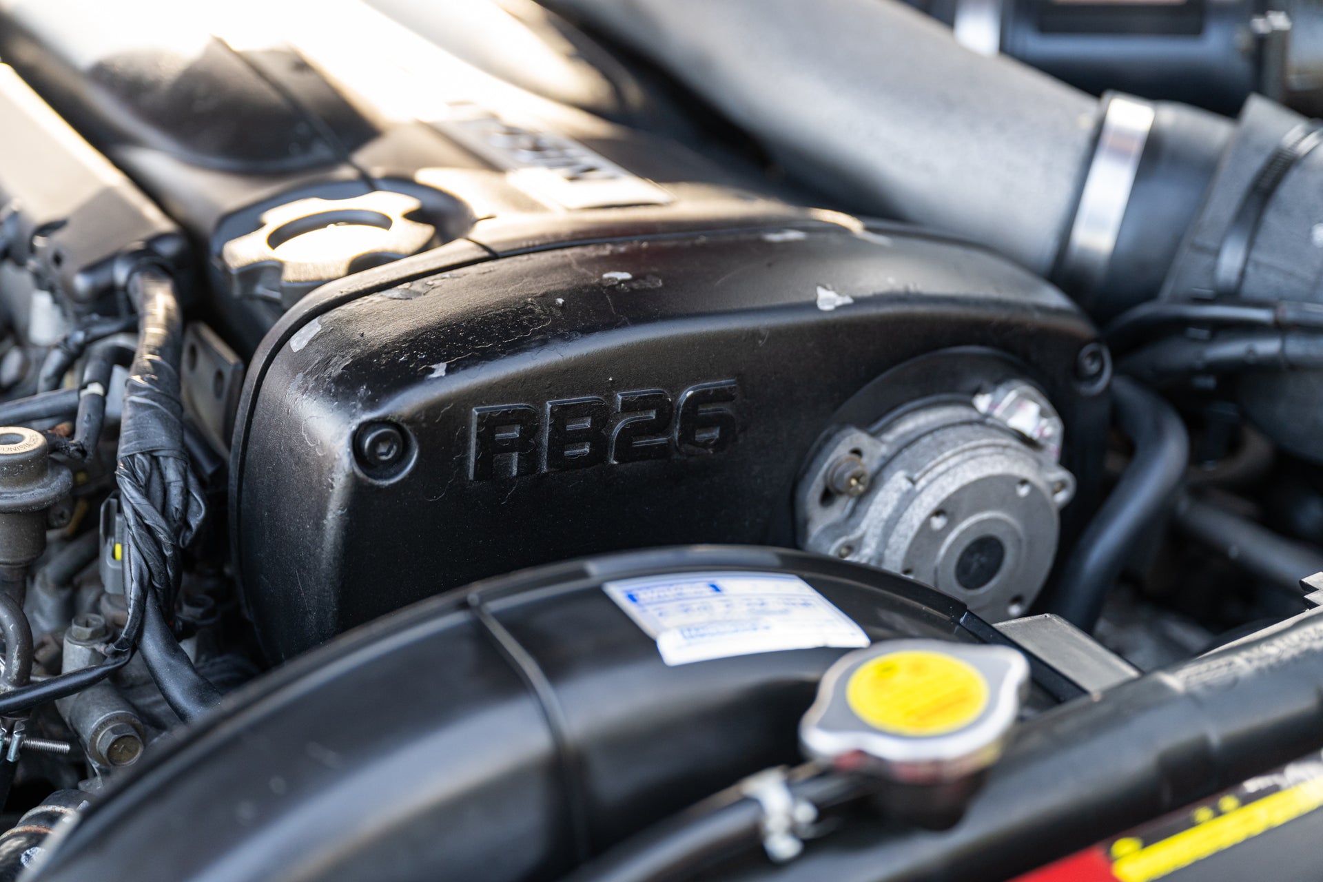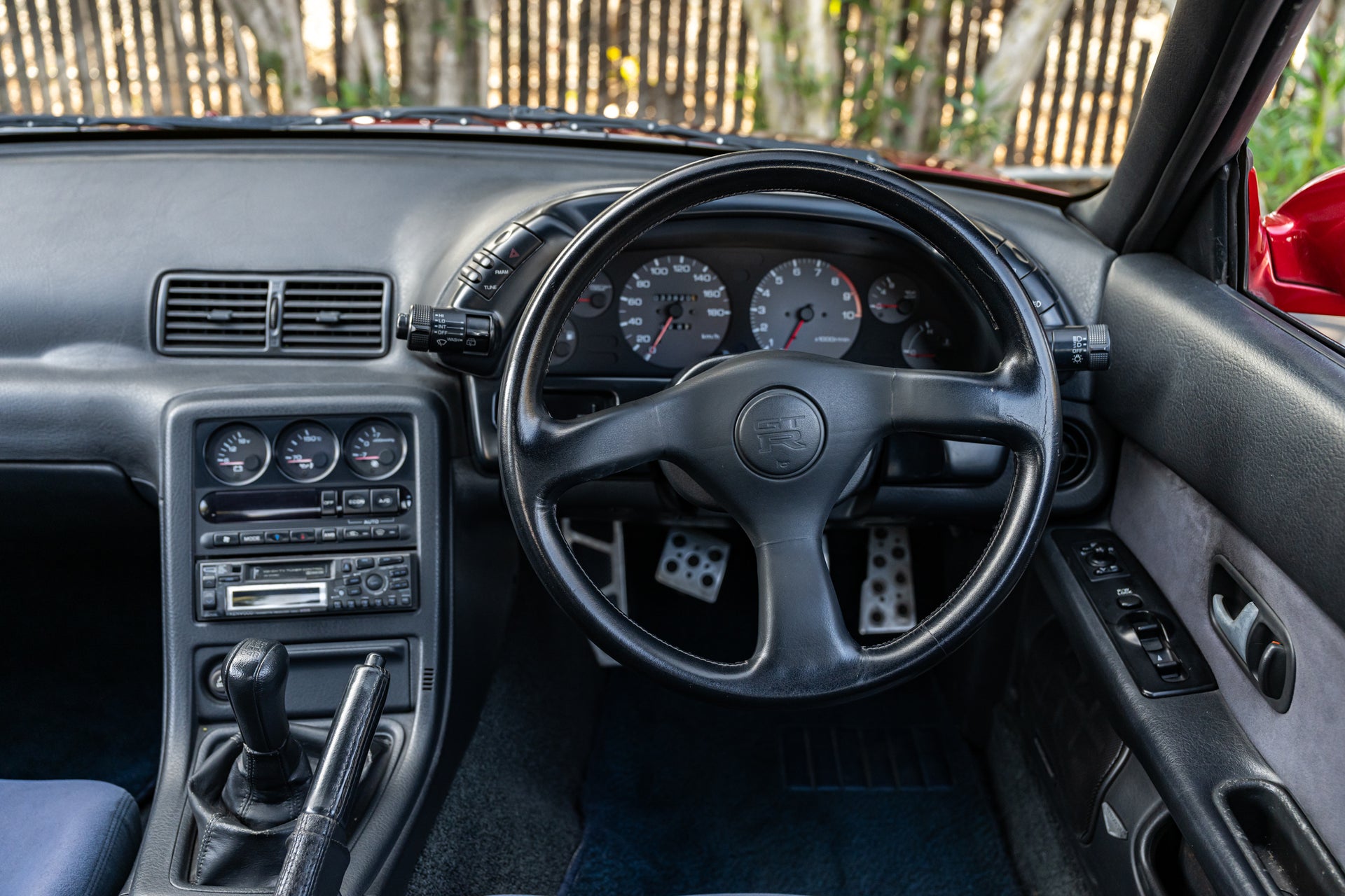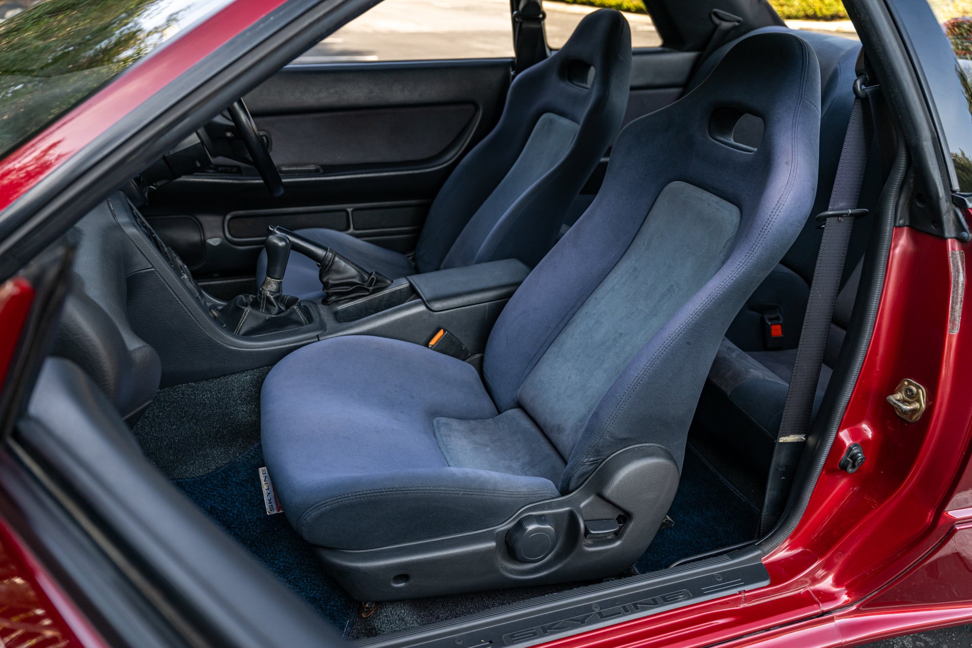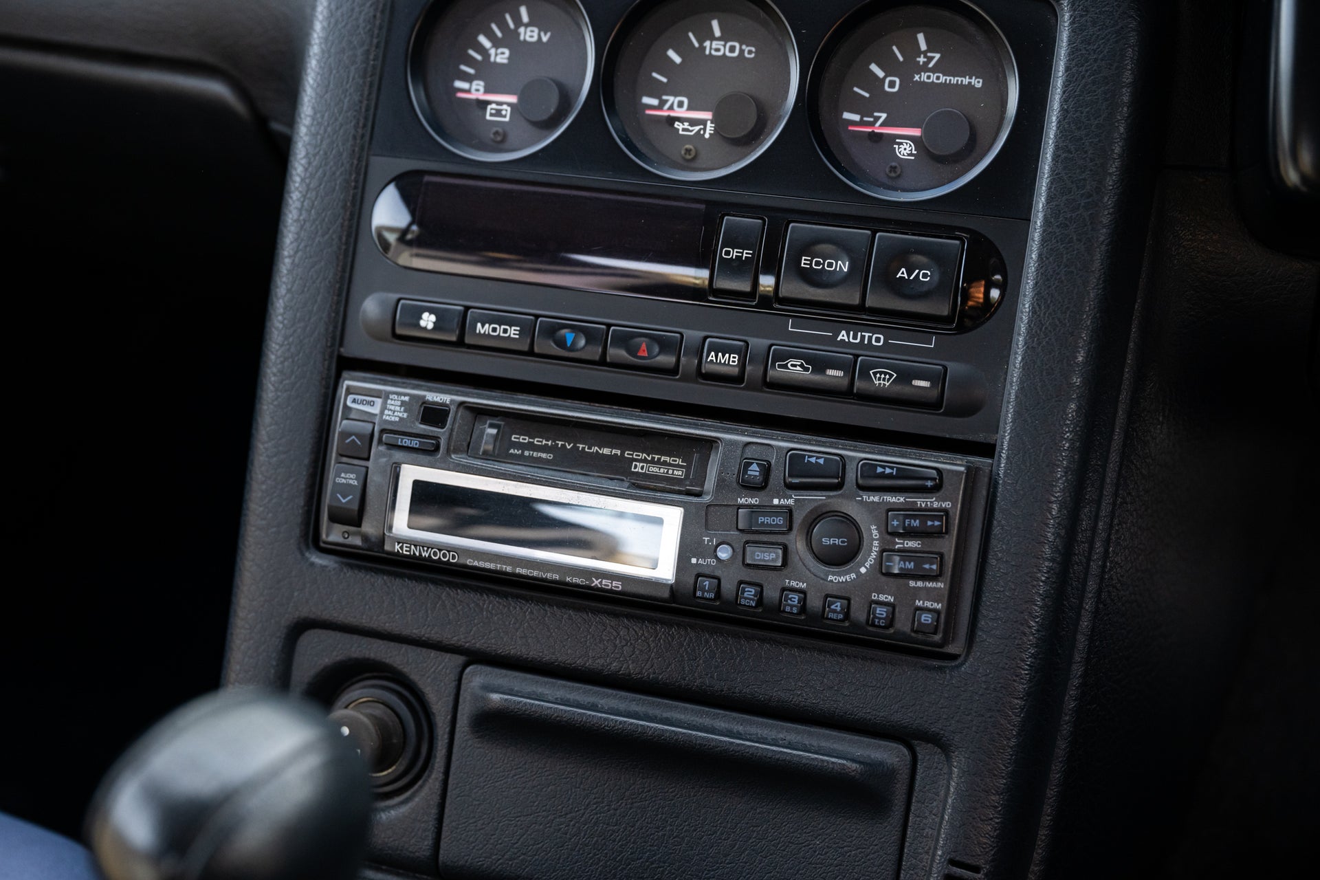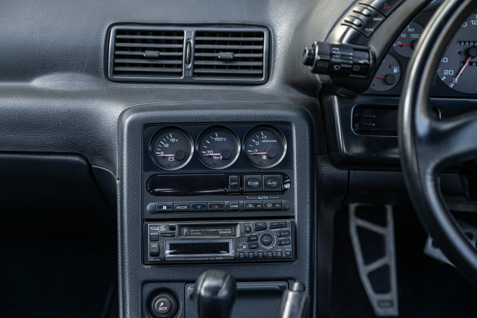 In addition to the awesome twin turbo performance, the Skyline GT-R offered a serious driving environment. The interior features a well instrumented offset cockpit style dash focused on the driver and sporty bolstered twin seats. A period correct Japanese-spec Kenwood cassette stereo is fitted to the console. Upholstery is fabric and faux suede in deep grey tones. The rear seat offers twin bucket positions and there is a practically sized trunk.