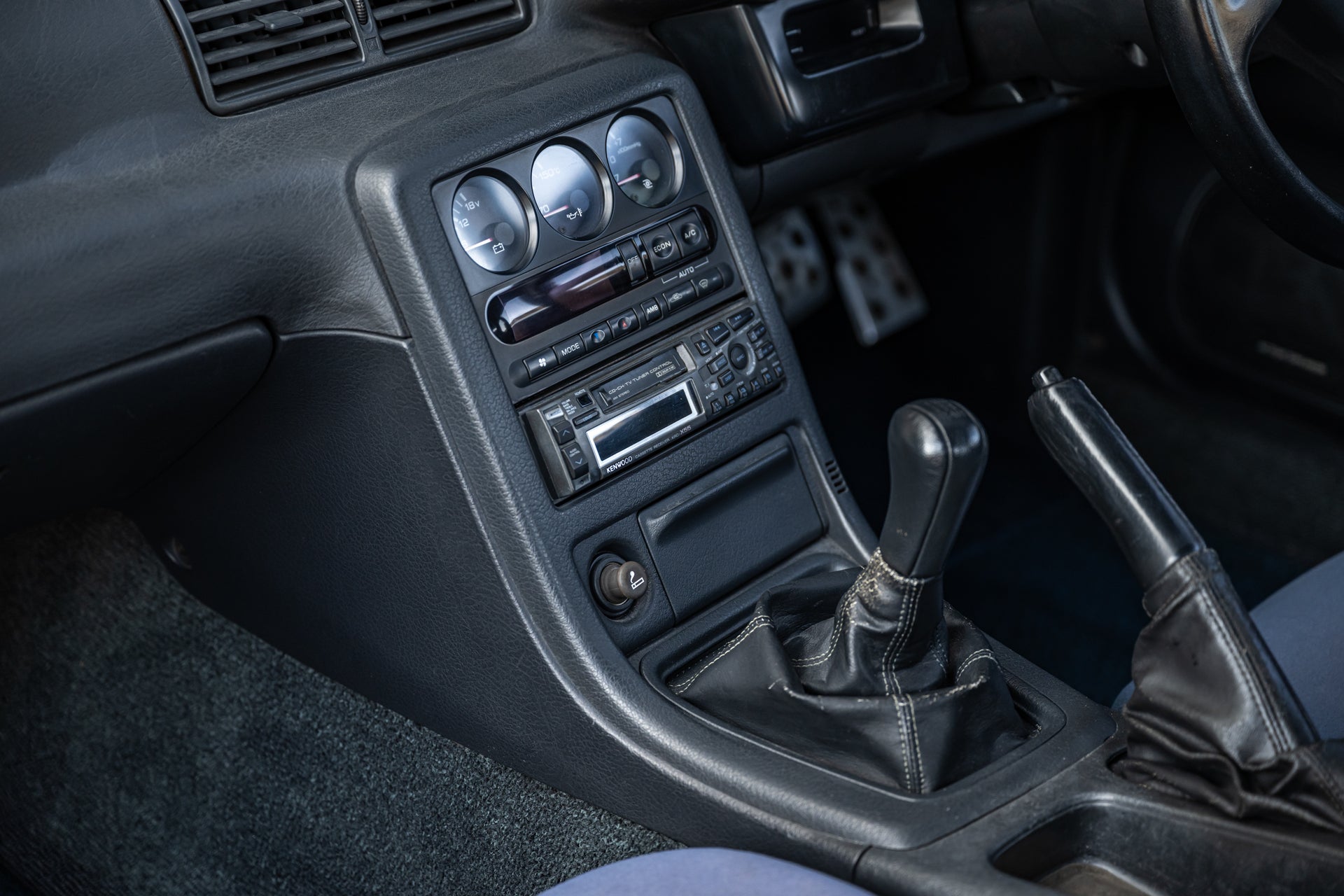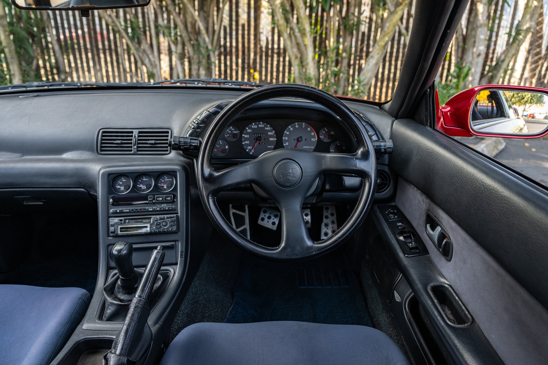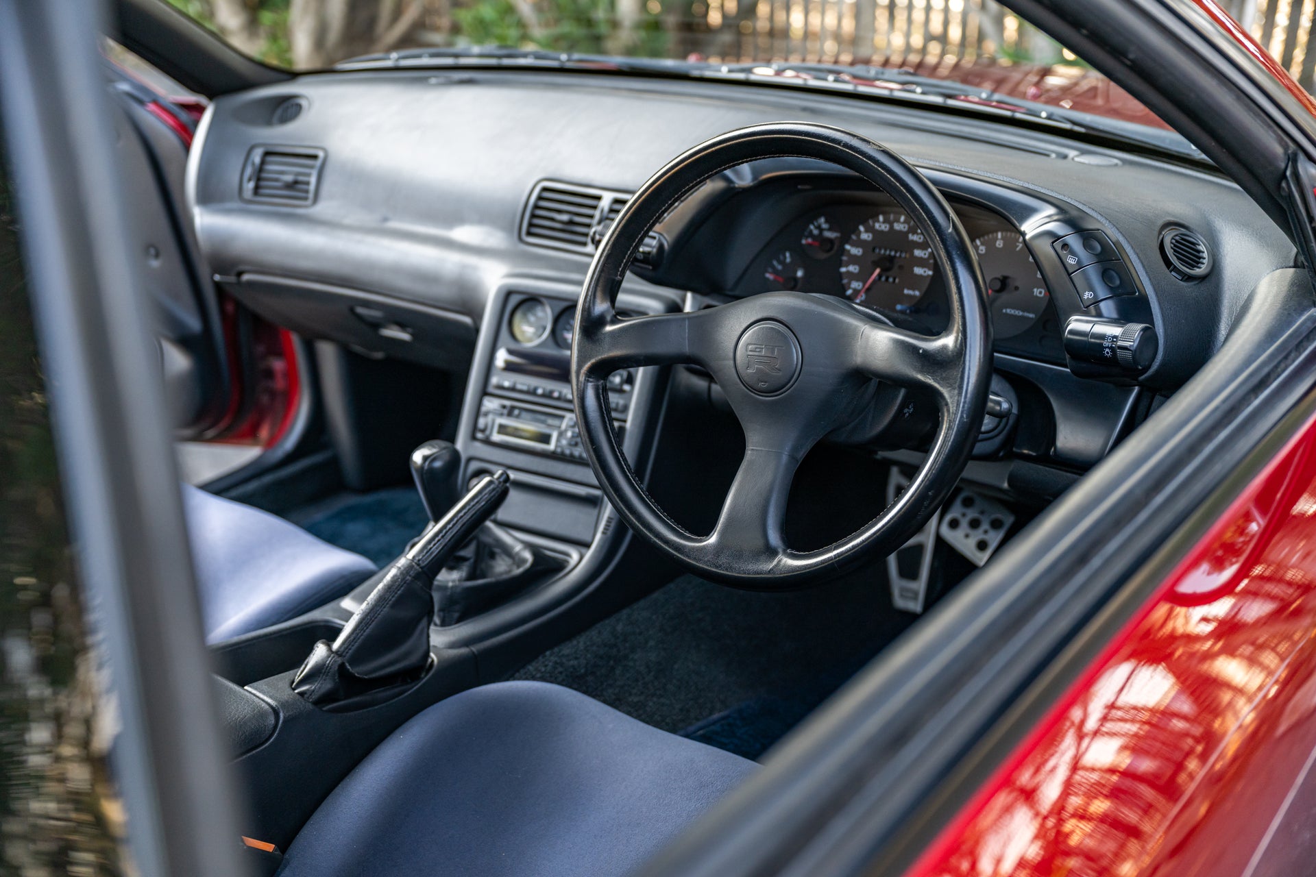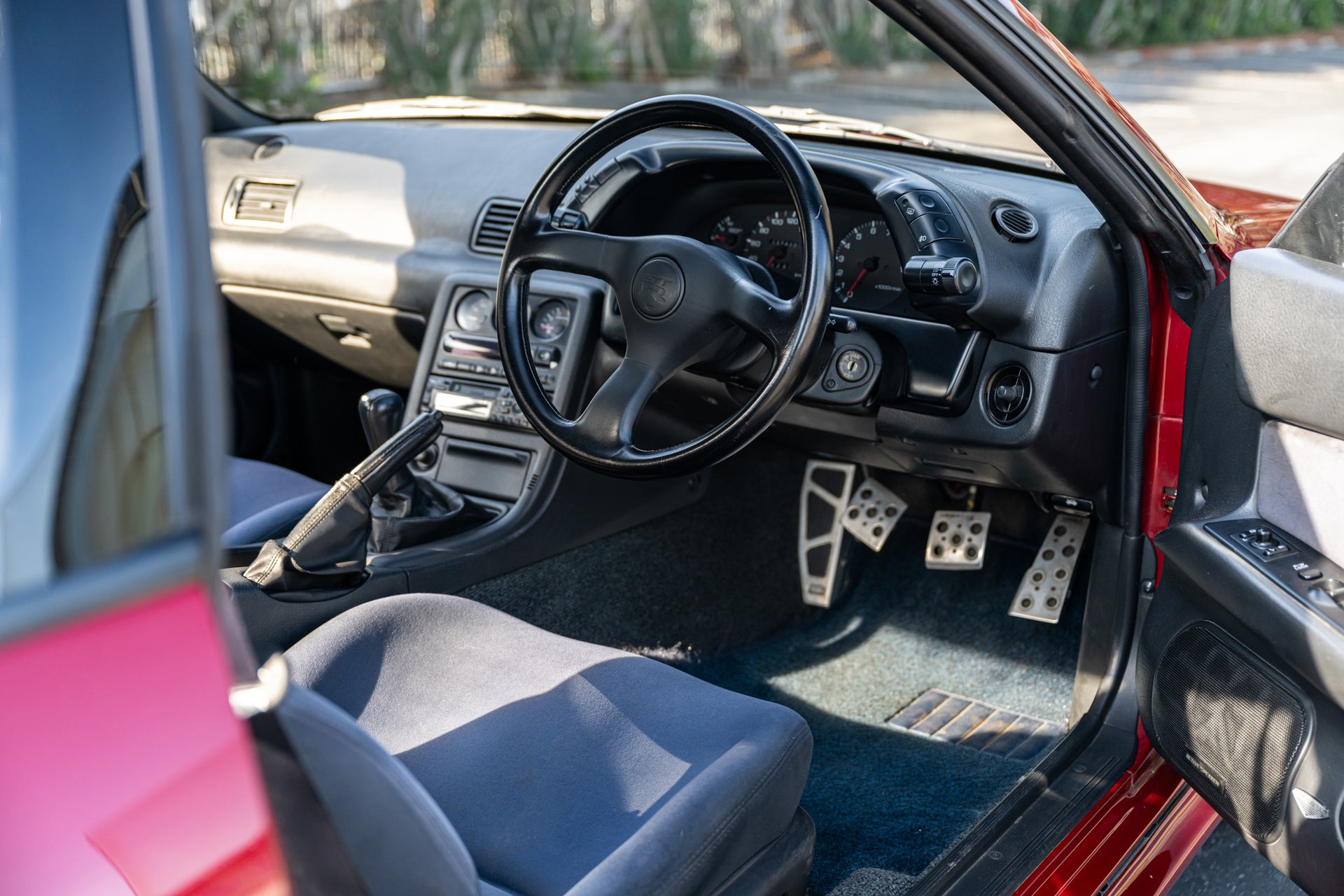 In addition to the awesome twin turbo performance, the Skyline GT-R offered a serious driving environment. The interior features a well instrumented offset cockpit style dash focused on the driver and sporty bolstered twin seats. A period correct Japanese-spec Kenwood cassette stereo is fitted to the console. Upholstery is fabric and faux suede in deep grey tones. The rear seat offers twin bucket positions and there is a practically sized trunk.