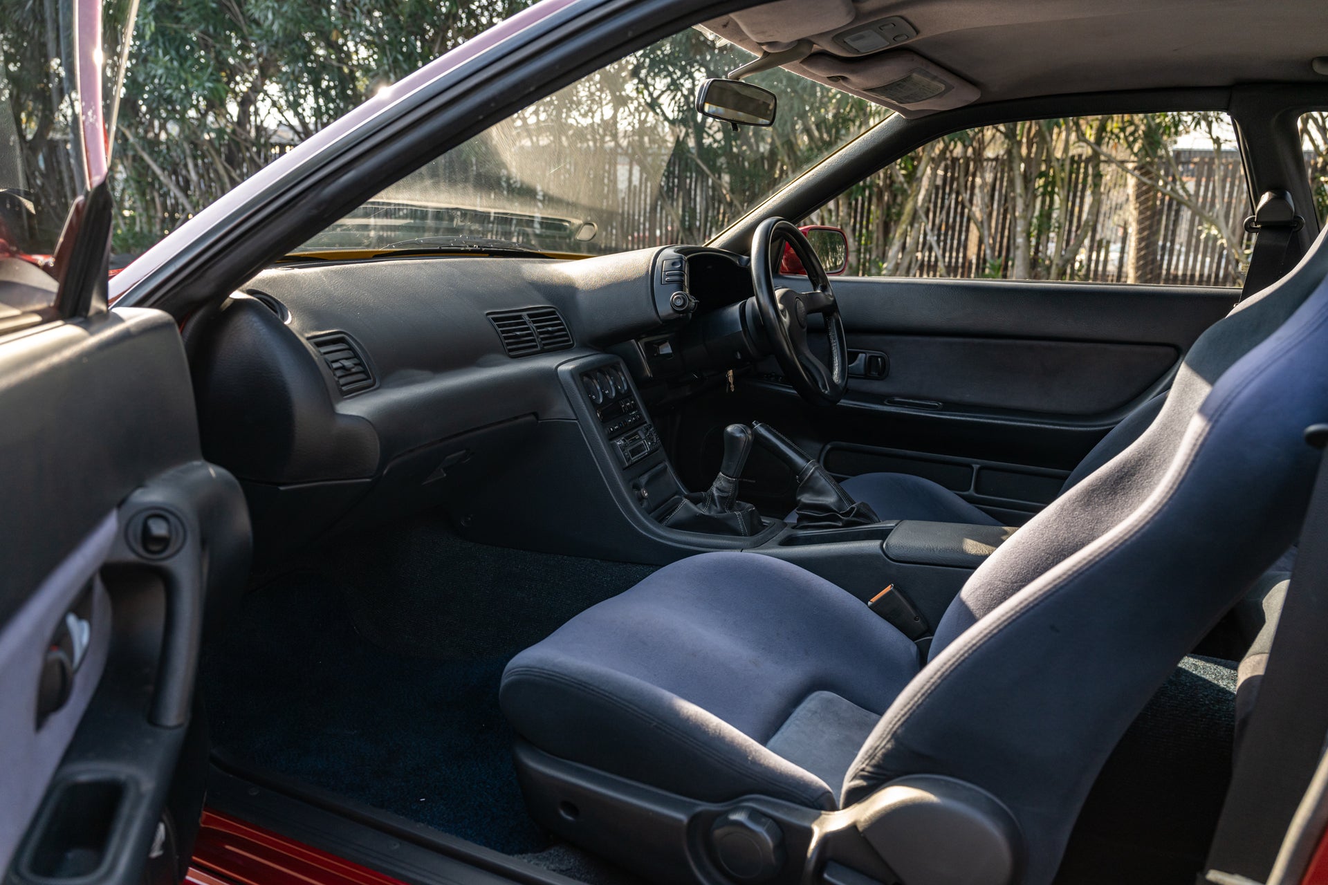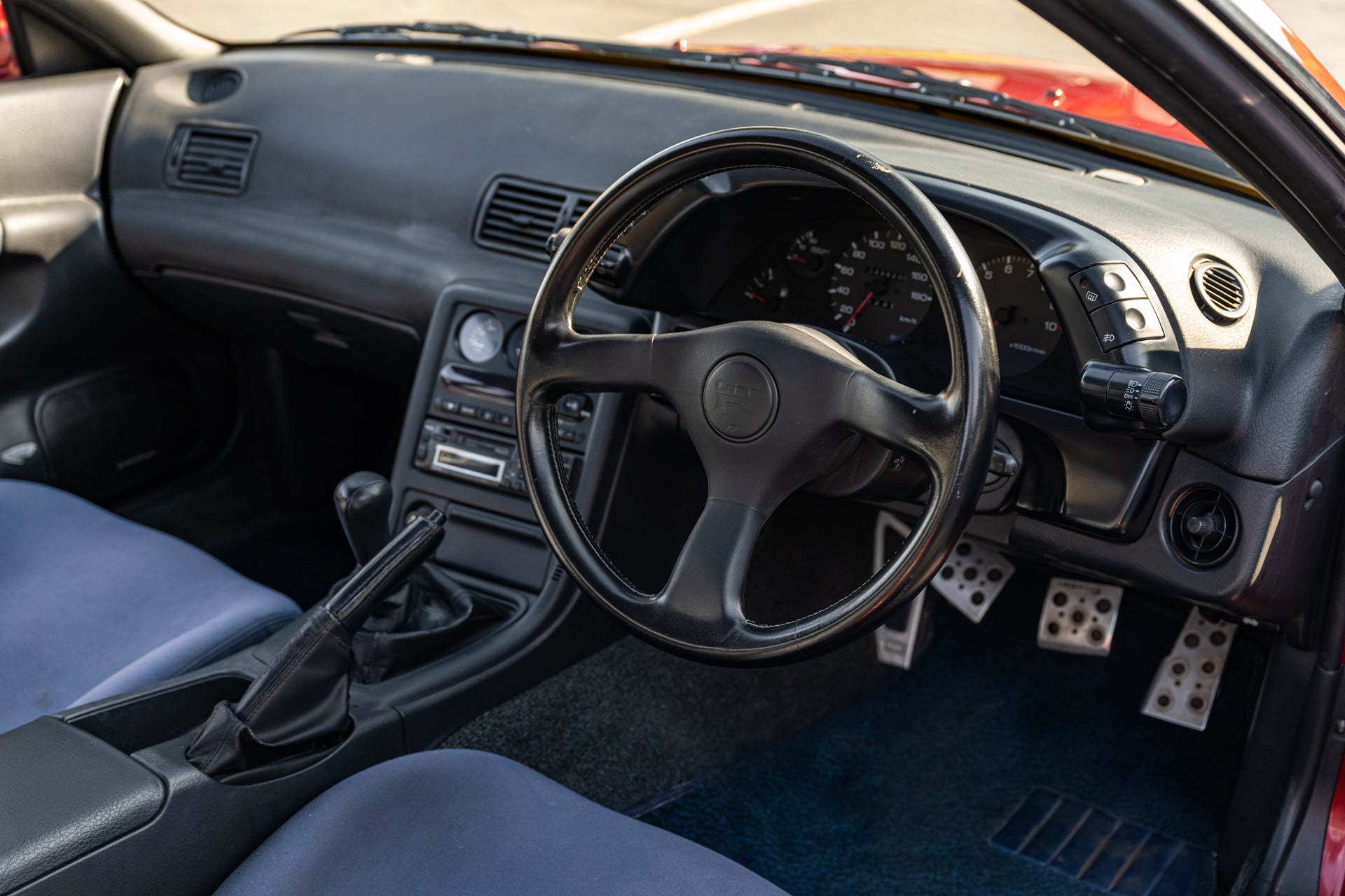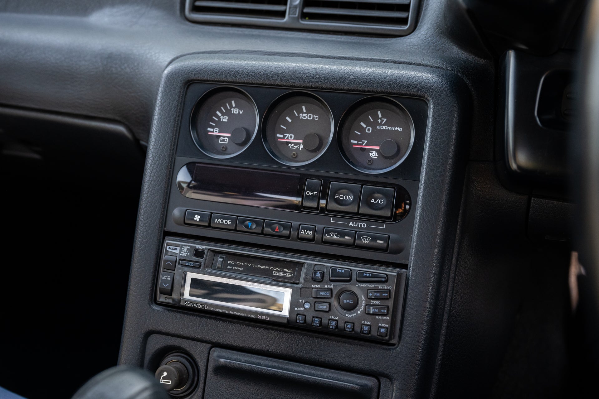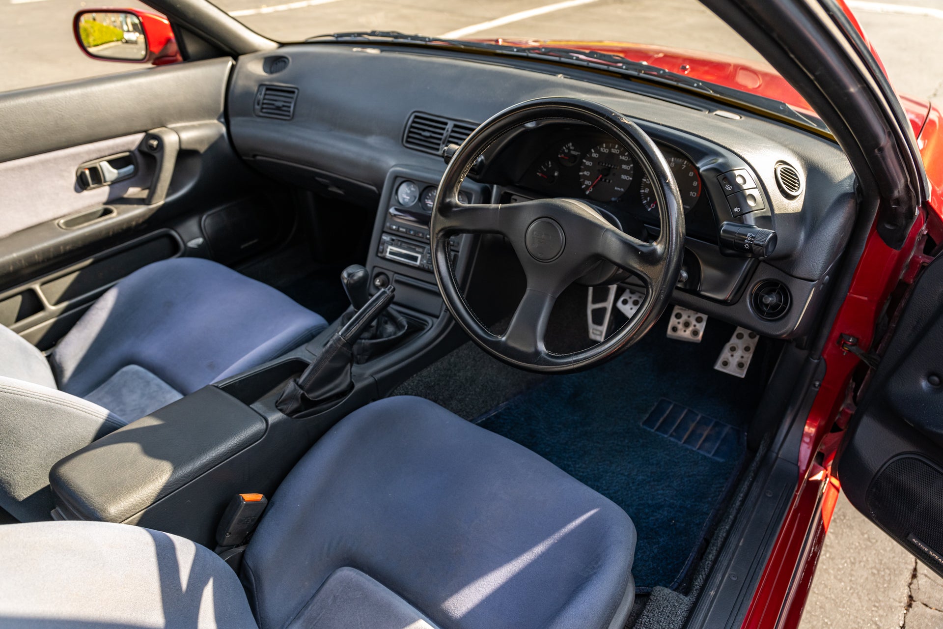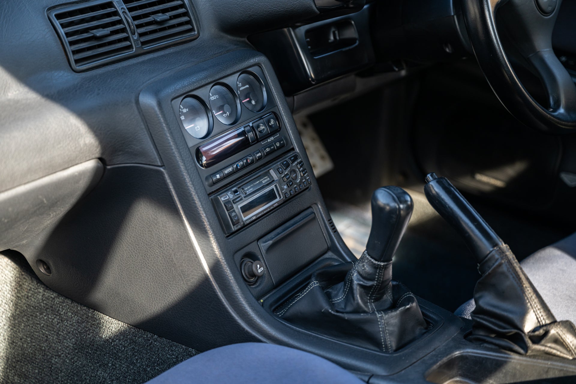 In addition to the awesome twin turbo performance, the Skyline GT-R offered a serious driving environment. The interior features a well instrumented offset cockpit style dash focused on the driver and sporty bolstered twin seats. A period correct Japanese-spec Kenwood cassette stereo is fitted to the console. Upholstery is fabric and faux suede in deep grey tones. The rear seat offers twin bucket positions and there is a practically sized trunk.
