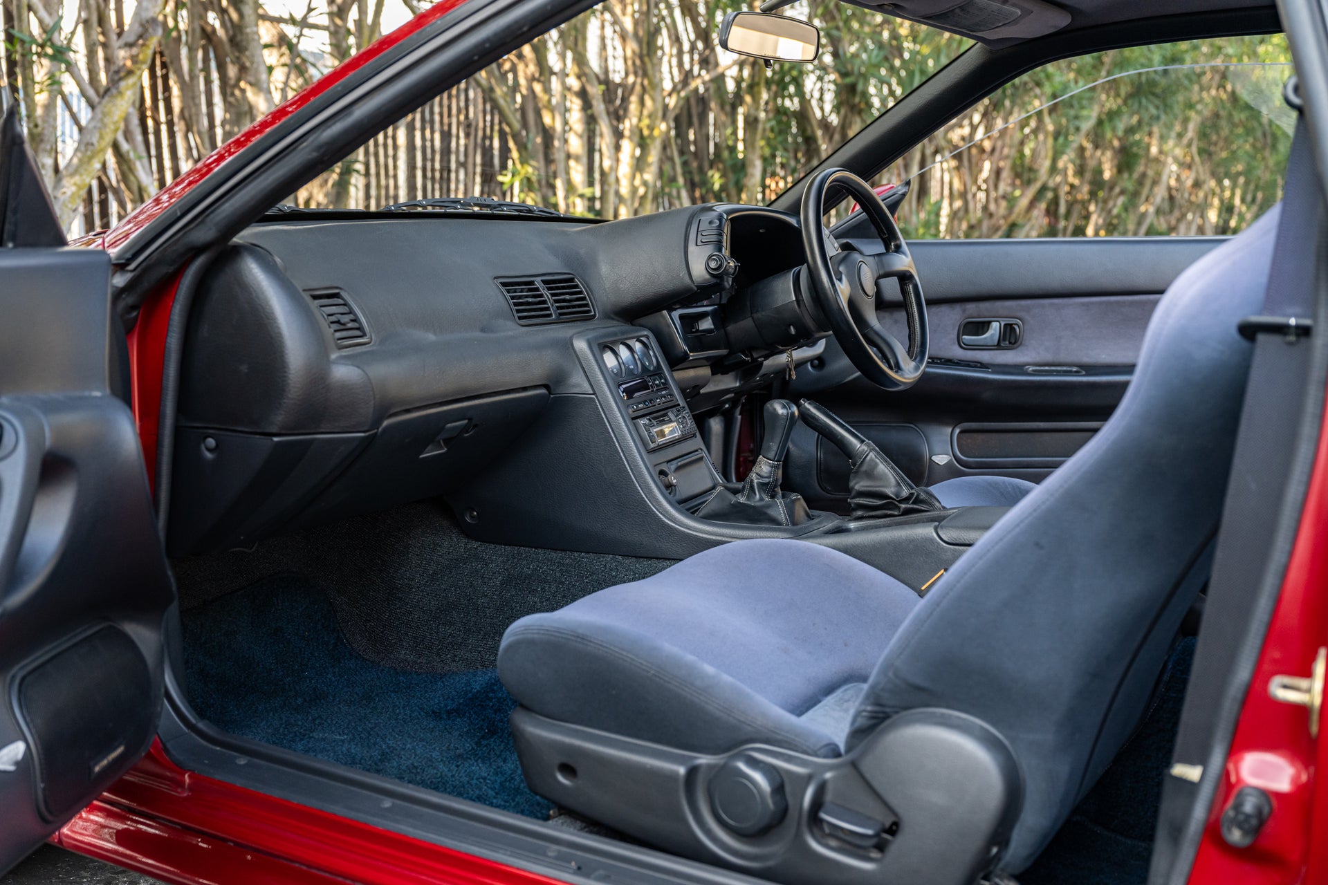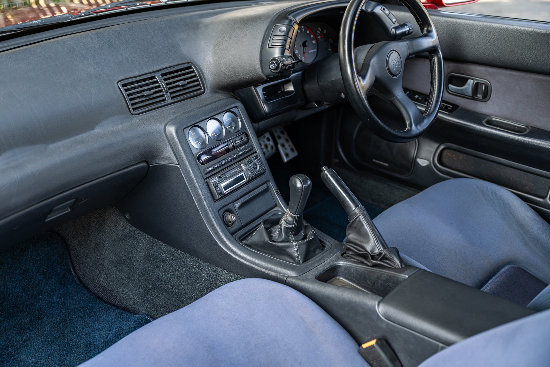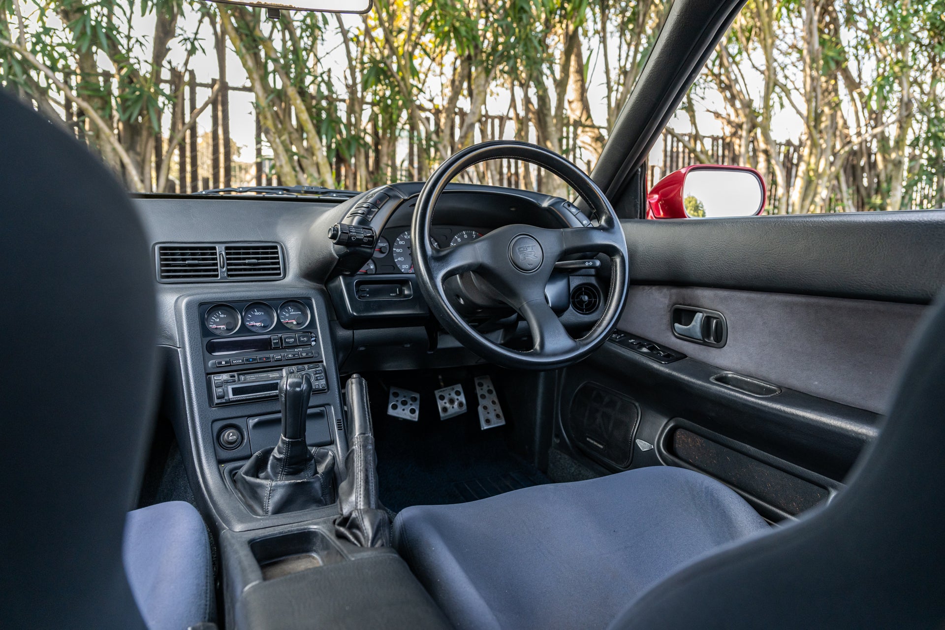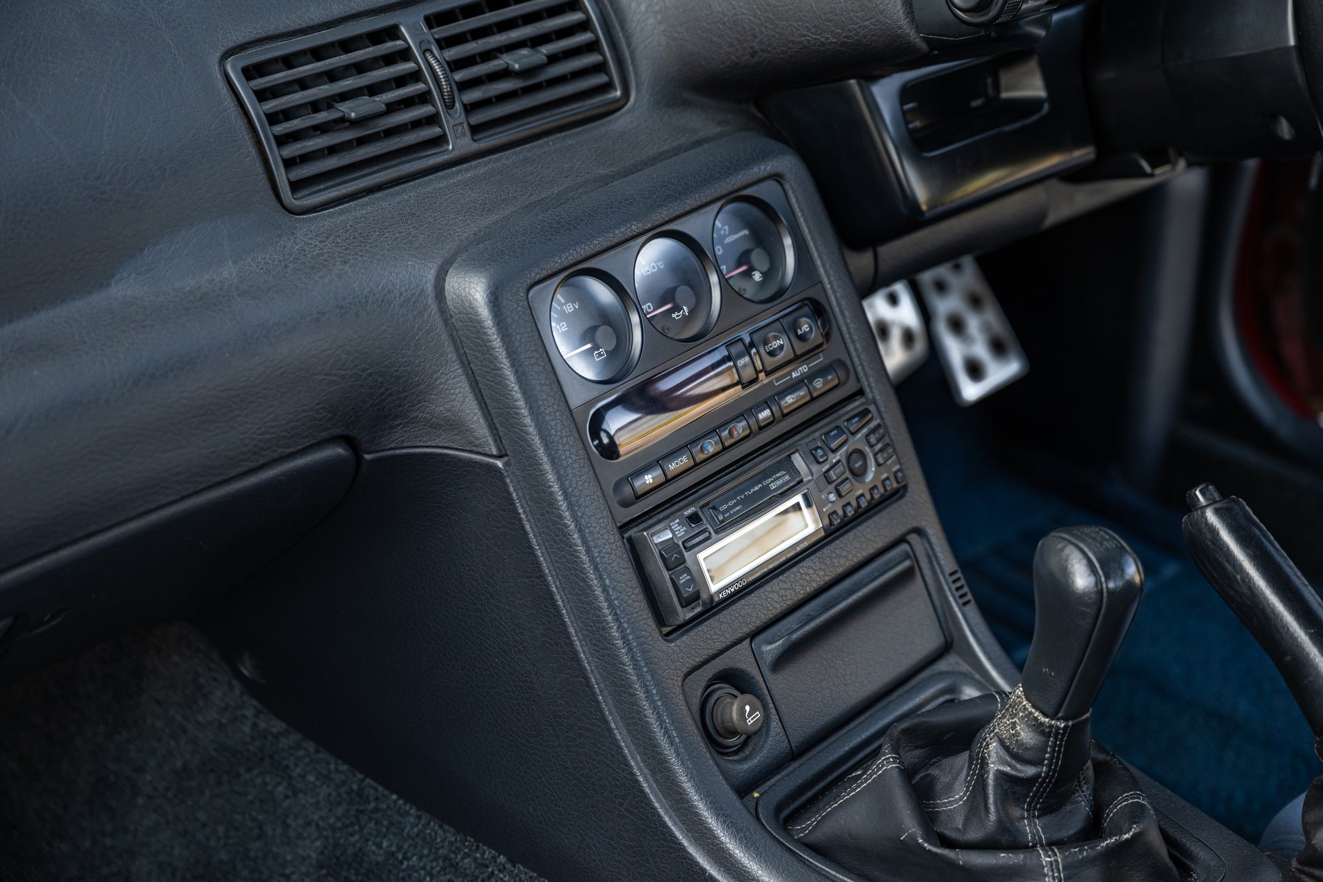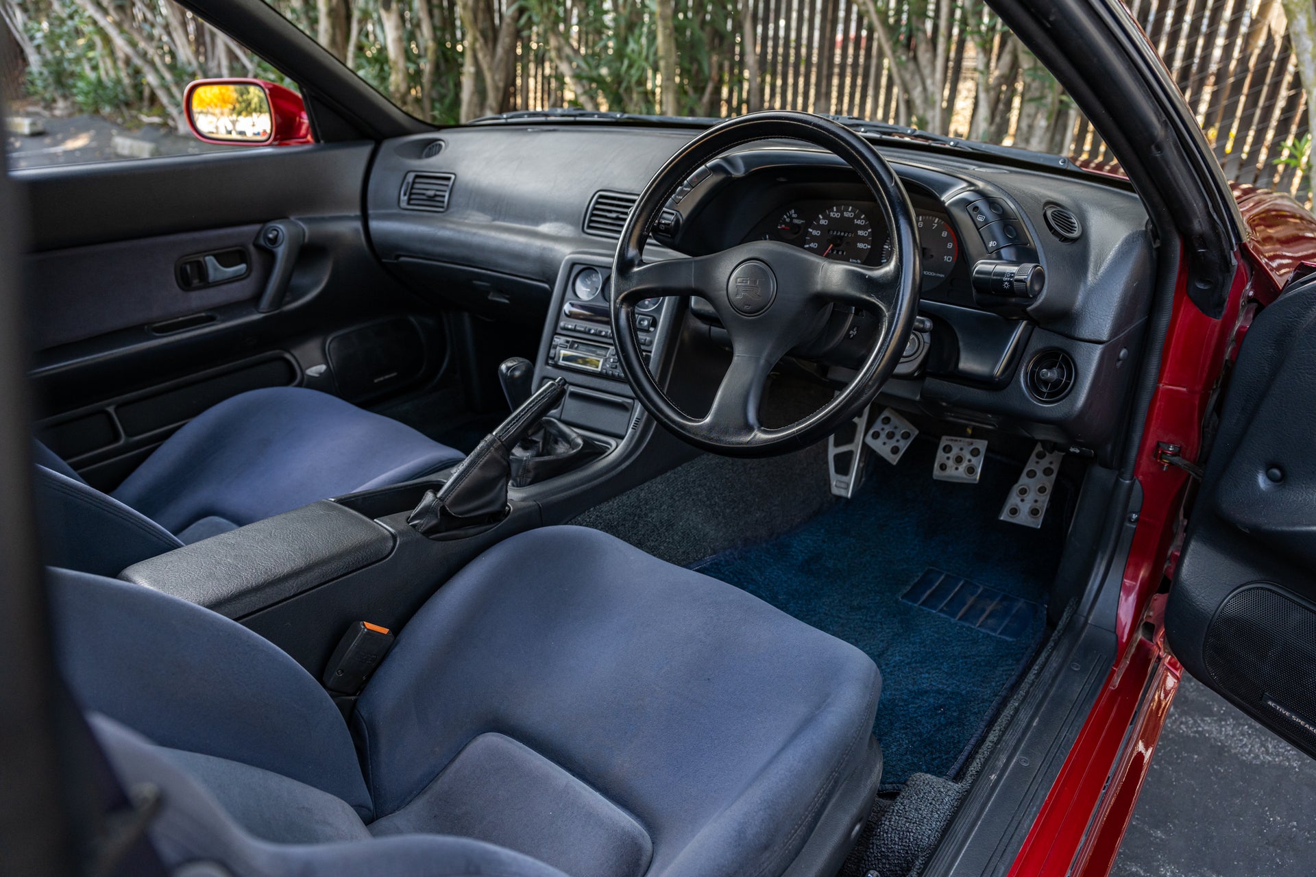 In addition to the awesome twin turbo performance, the Skyline GT-R offered a serious driving environment. The interior features a well instrumented offset cockpit style dash focused on the driver and sporty bolstered twin seats. A period correct Japanese-spec Kenwood cassette stereo is fitted to the console. Upholstery is fabric and faux suede in deep grey tones. The rear seat offers twin bucket positions and there is a practically sized trunk.