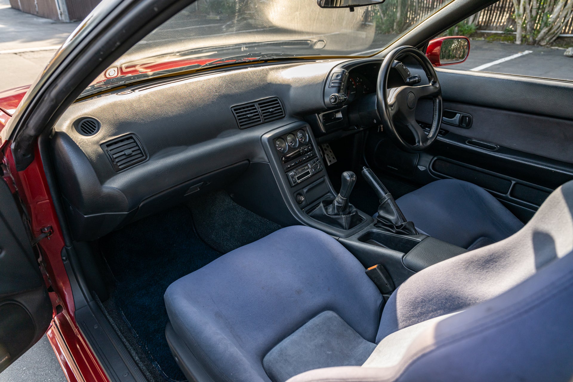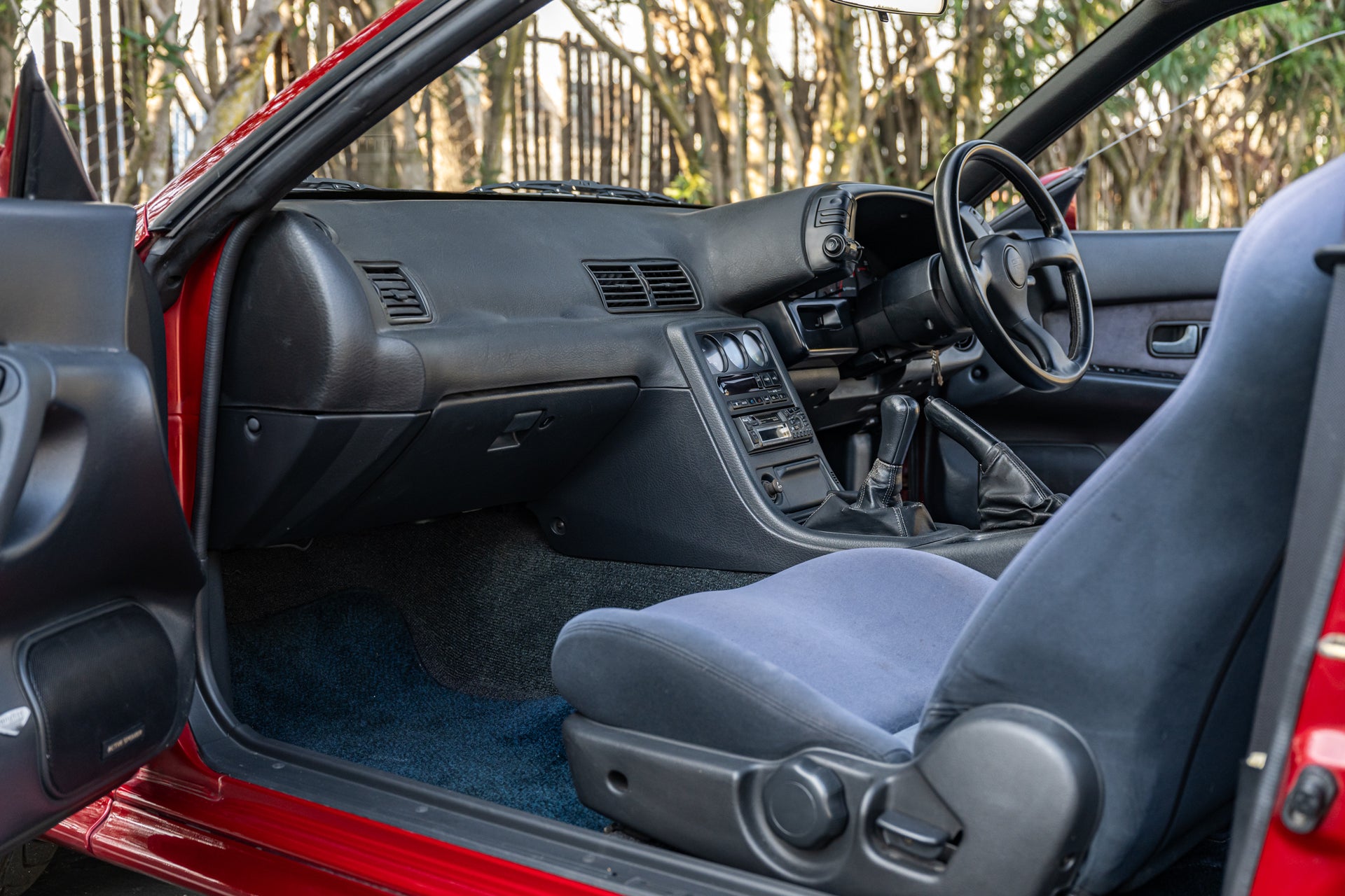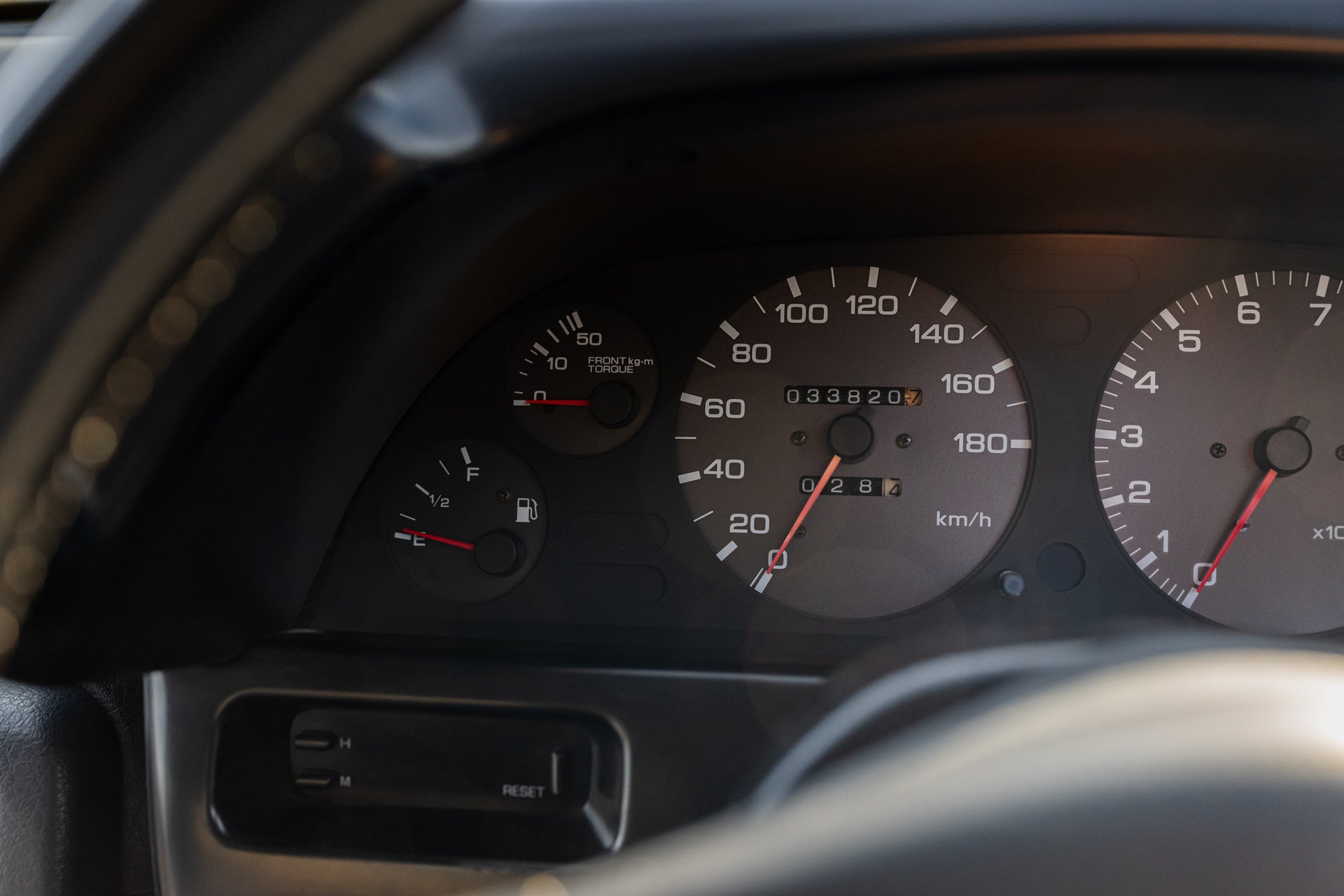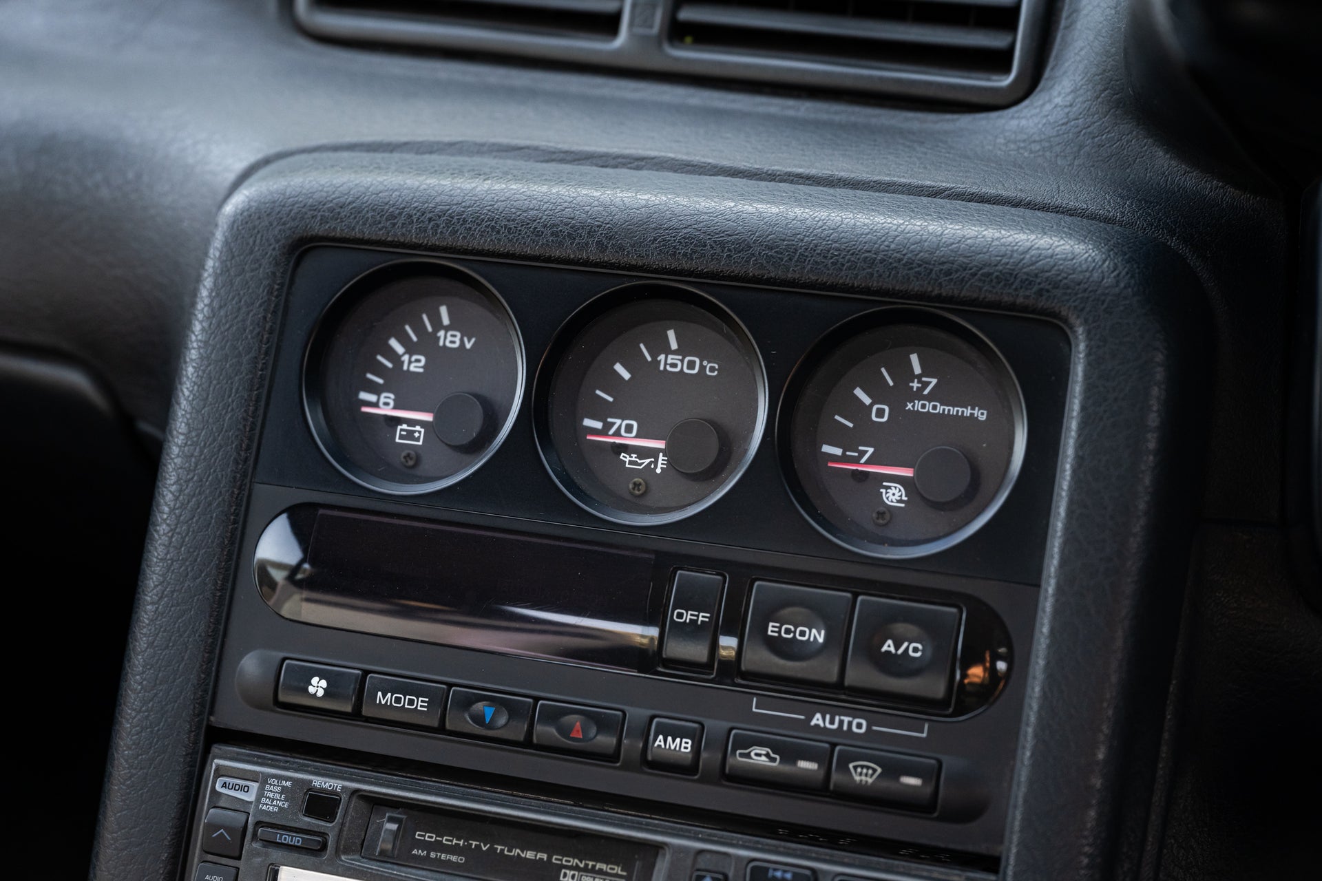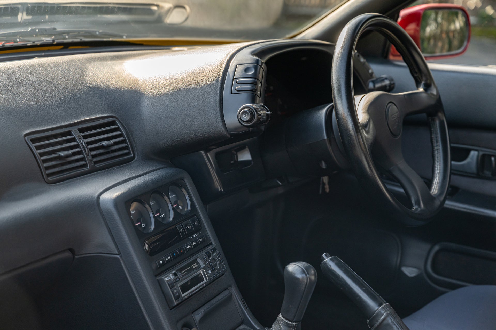 In addition to the awesome twin turbo performance, the Skyline GT-R offered a serious driving environment. The interior features a well instrumented offset cockpit style dash focused on the driver and sporty bolstered twin seats. A period correct Japanese-spec Kenwood cassette stereo is fitted to the console. Upholstery is fabric and faux suede in deep grey tones. The rear seat offers twin bucket positions and there is a practically sized trunk.