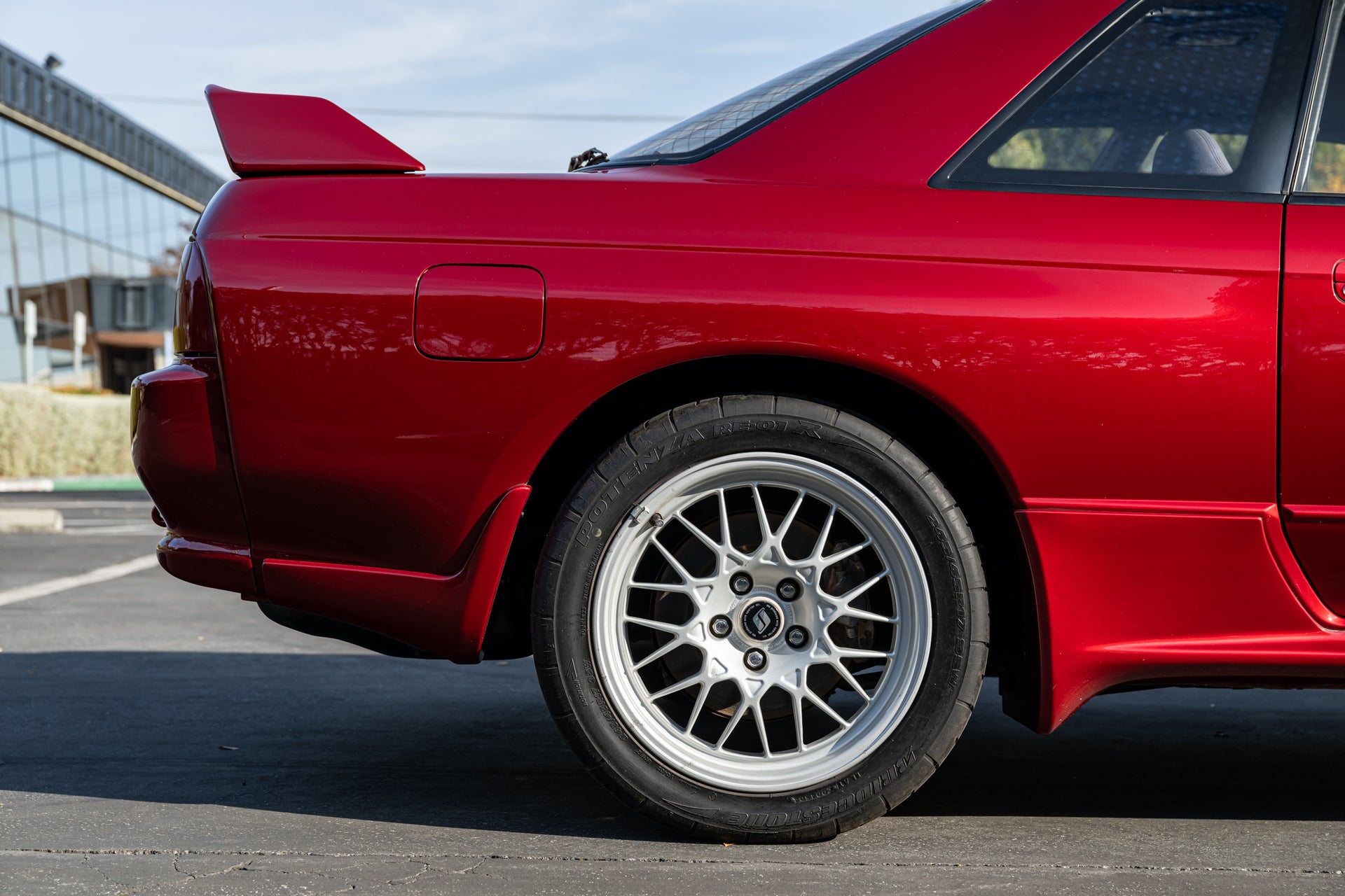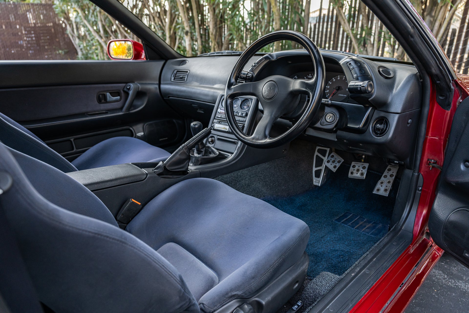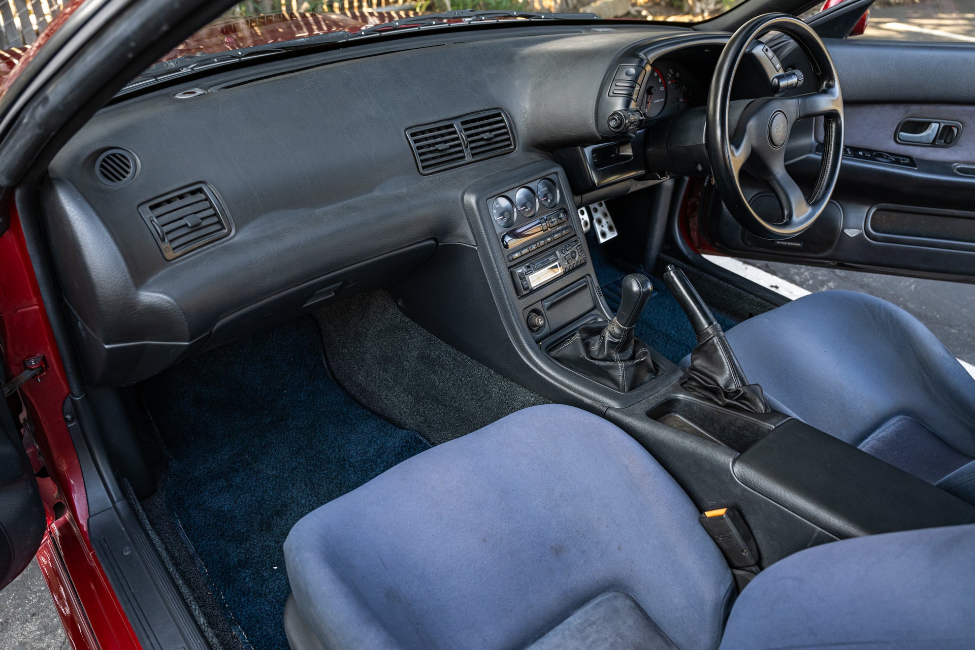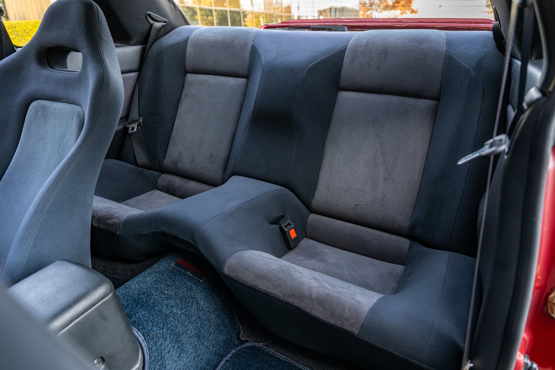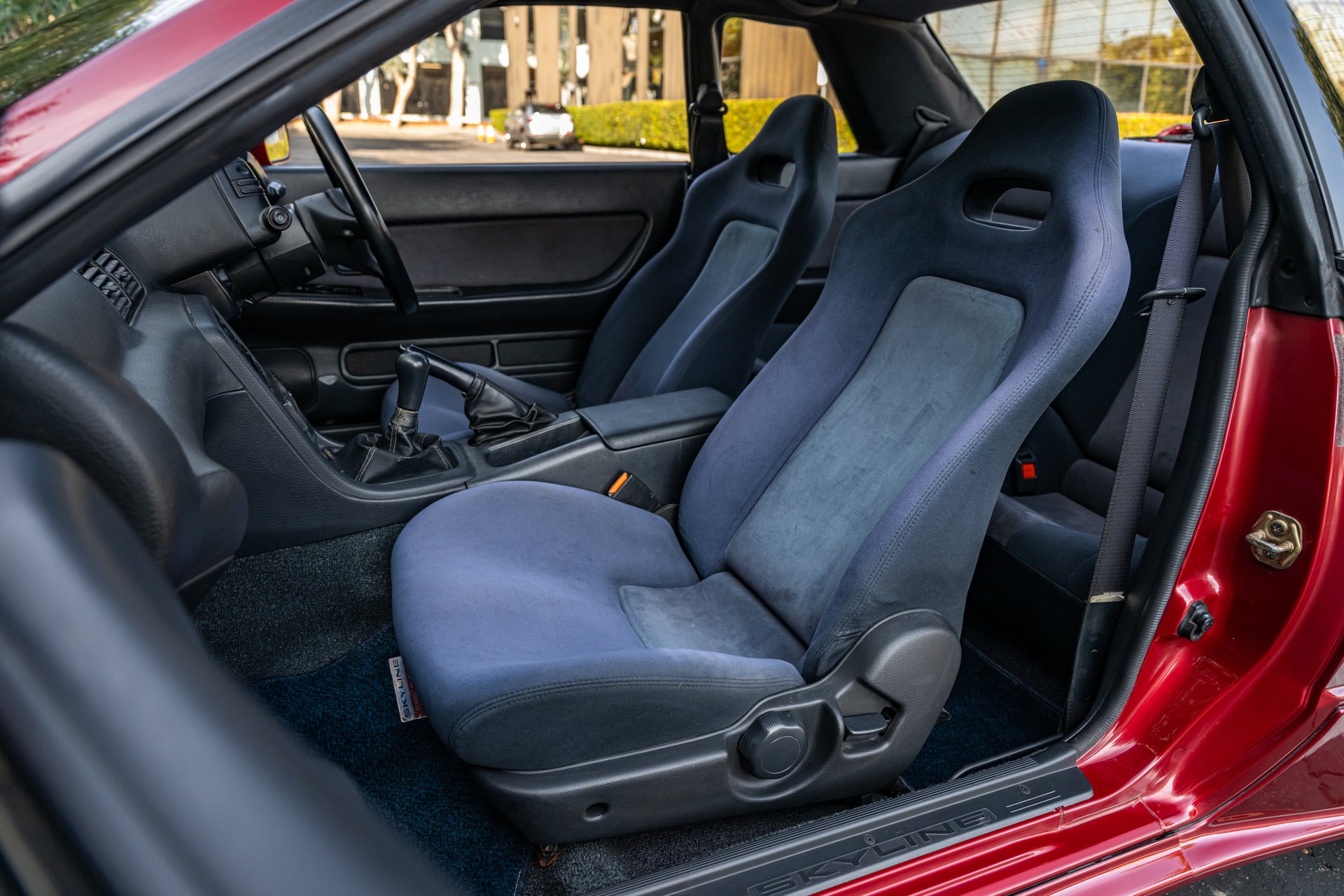 In addition to the awesome twin turbo performance, the Skyline GT-R offered a serious driving environment. The interior features a well instrumented offset cockpit style dash focused on the driver and sporty bolstered twin seats. A period correct Japanese-spec Kenwood cassette stereo is fitted to the console. Upholstery is fabric and faux suede in deep grey tones. The rear seat offers twin bucket positions and there is a practically sized trunk.
