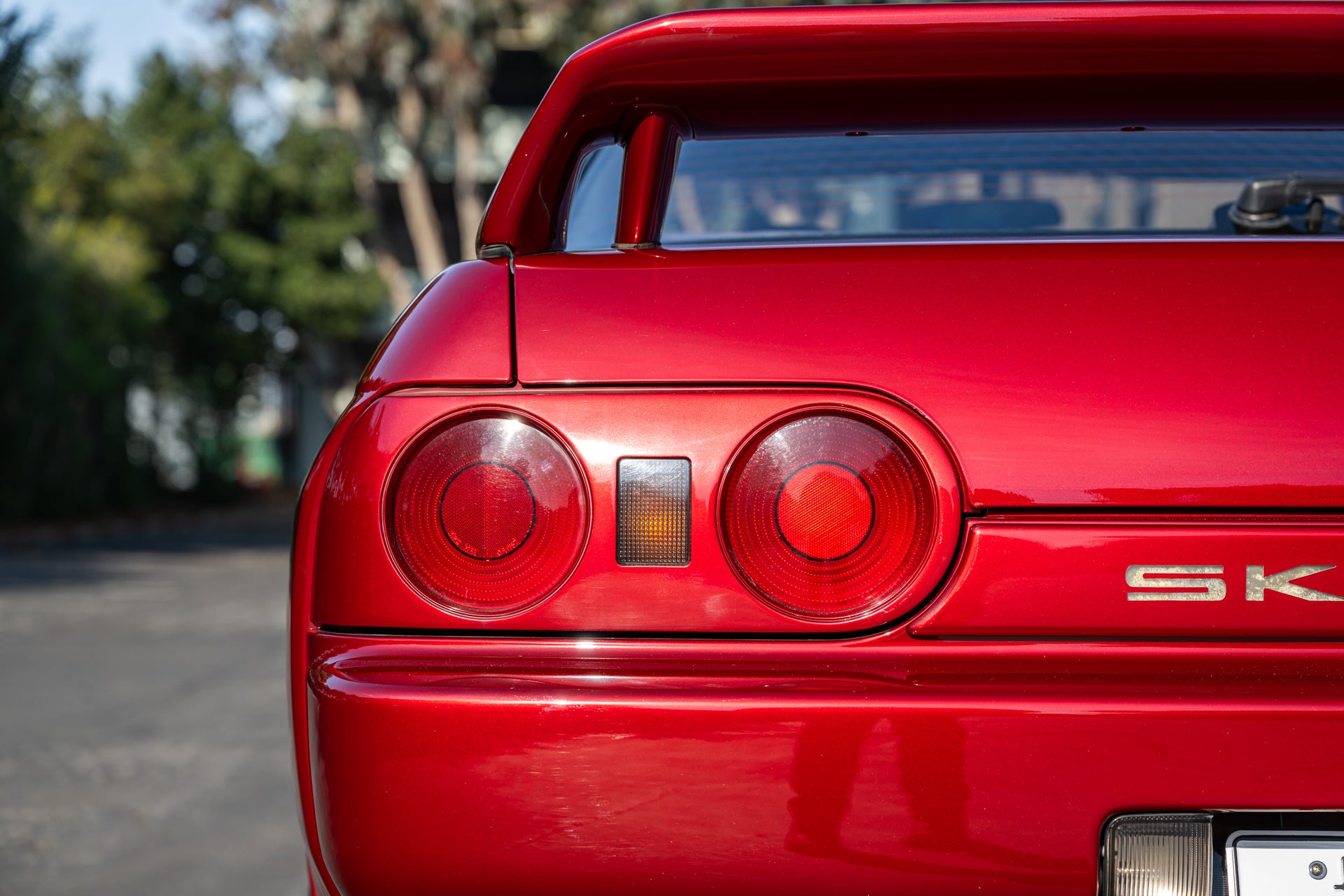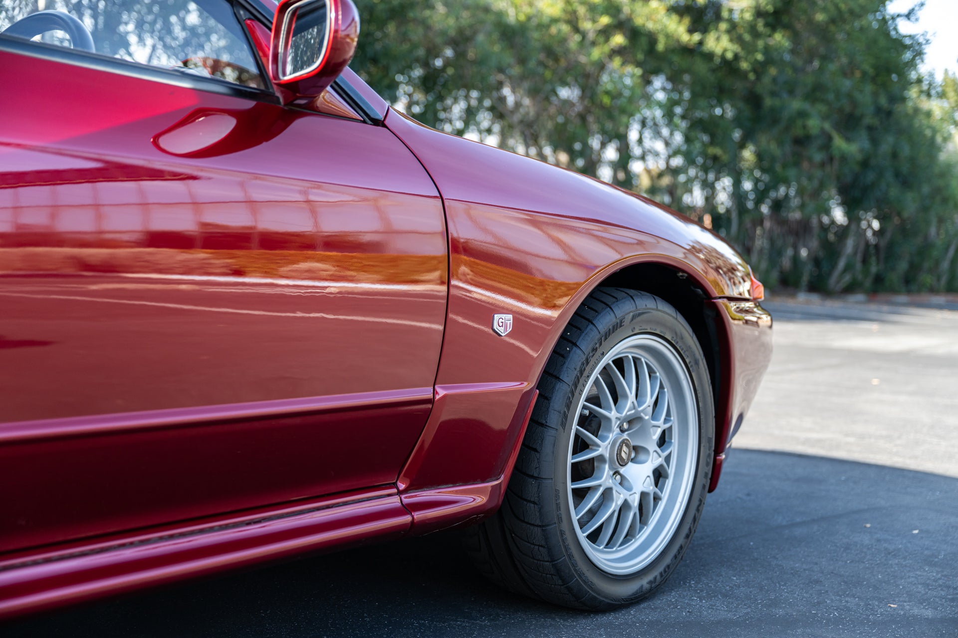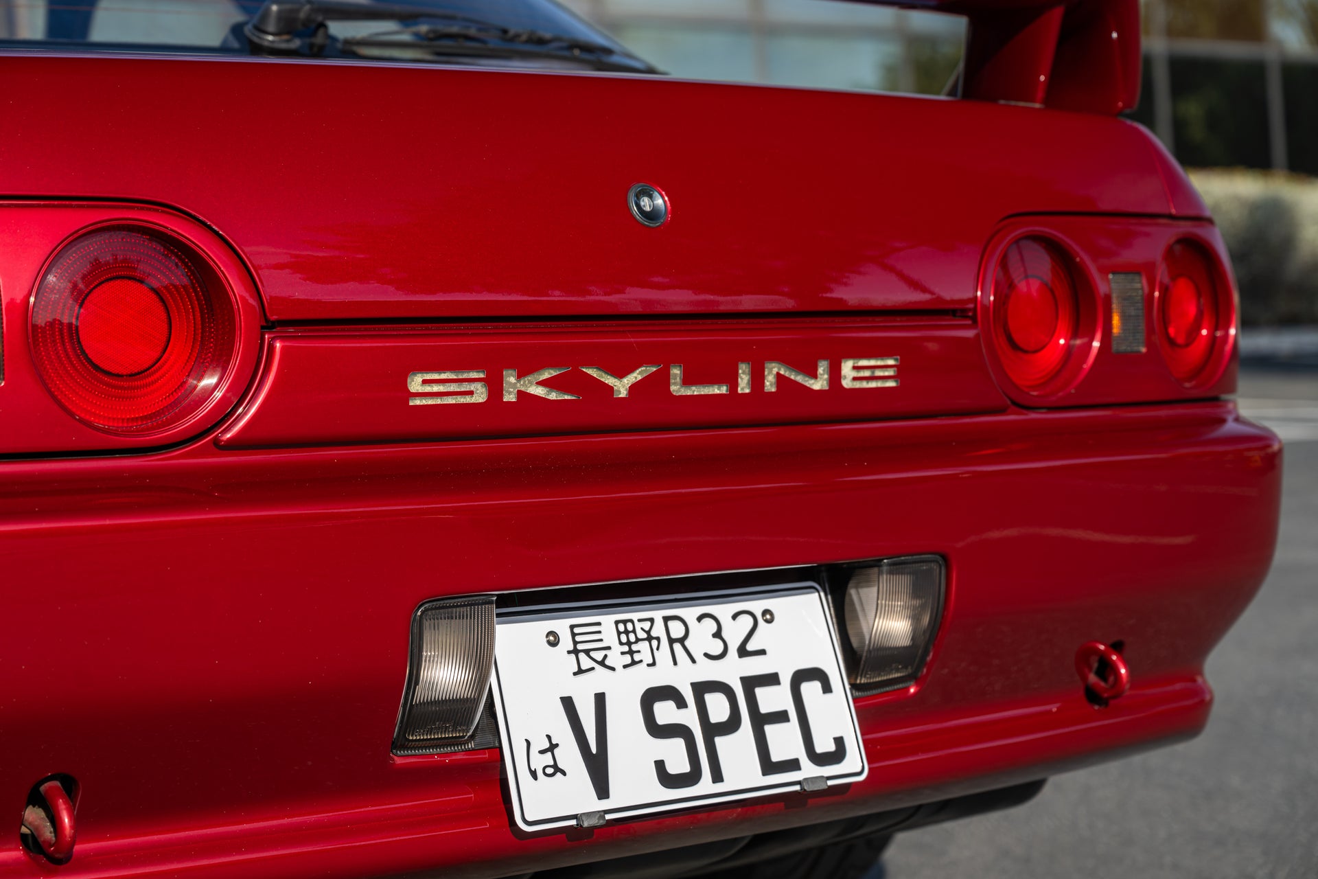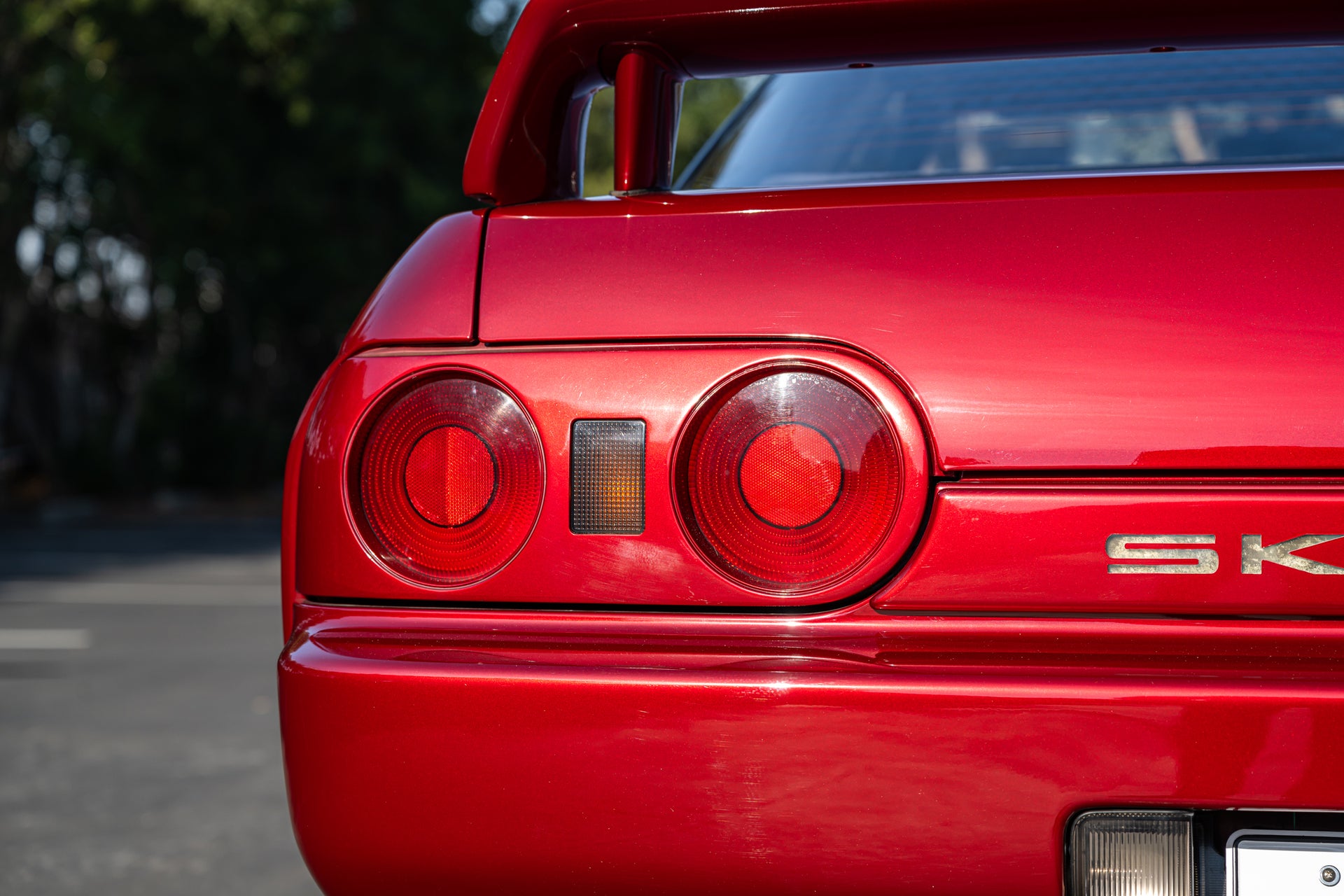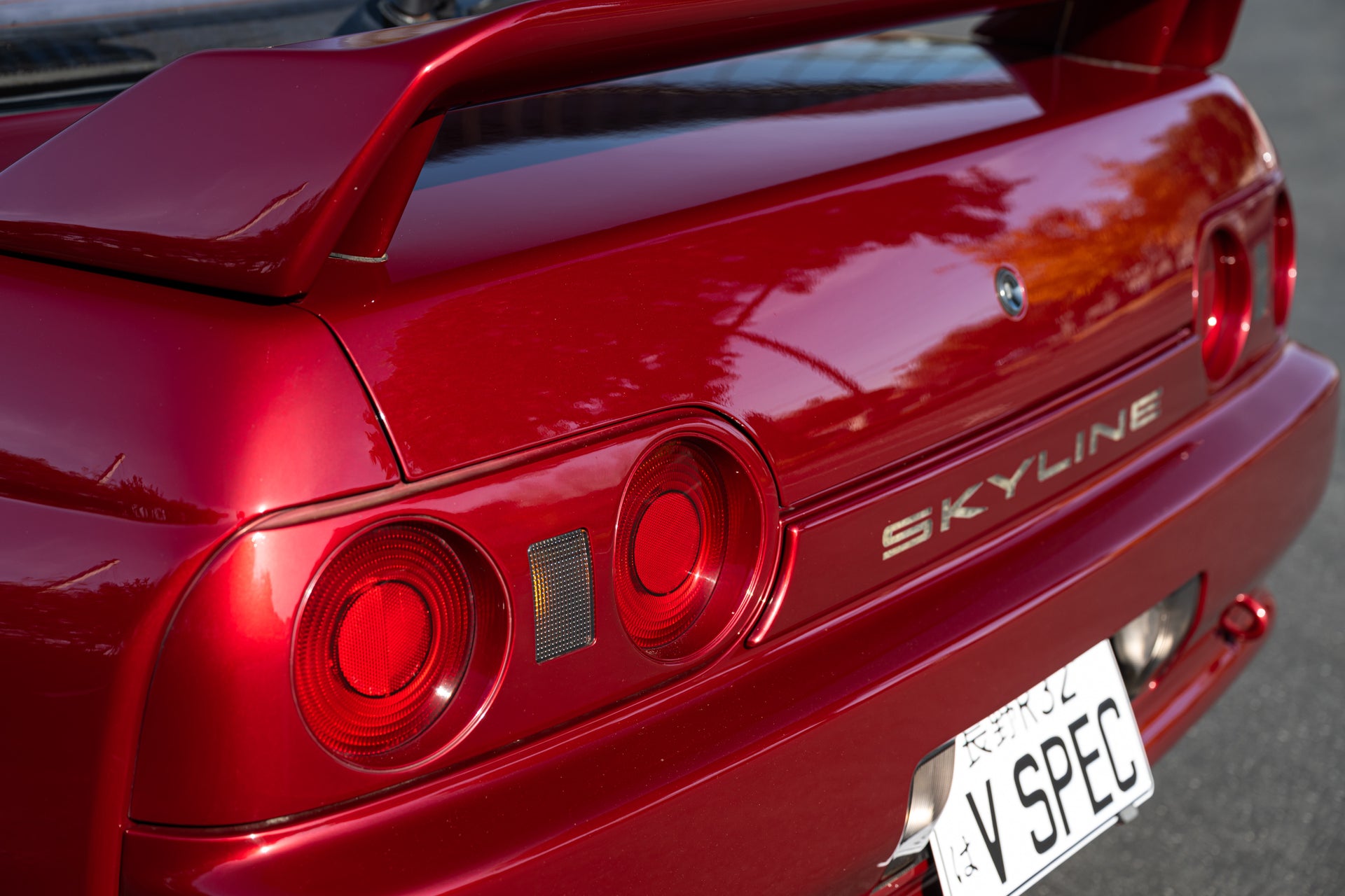 Unicorn 1994 Nissan Skyline GT-R R32 V-Spec II in rare Red Pearl Metallic (AH3) features excellent overall condition and only 21k miles (34k km) on the odometer. A special find, completely stock, no rust, full maintenance records and ready to go. This R32 V-Spec II belongs to the first generation of the Skyline GT-R series dubbed “Godzilla” (1989 -1994) and features the RB26DETT engine and classic 1990’s styling. This is a late model R-32 V-Spec that has a track-focused suspension setup with an emphasis on agility. A favorite of driving enthusiasts due to the emphasis on power and handling and the no nonsense looks and interior.