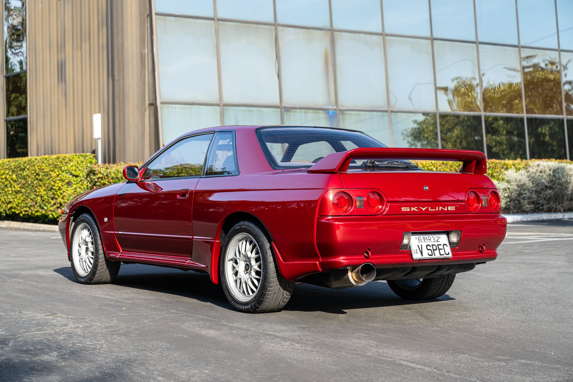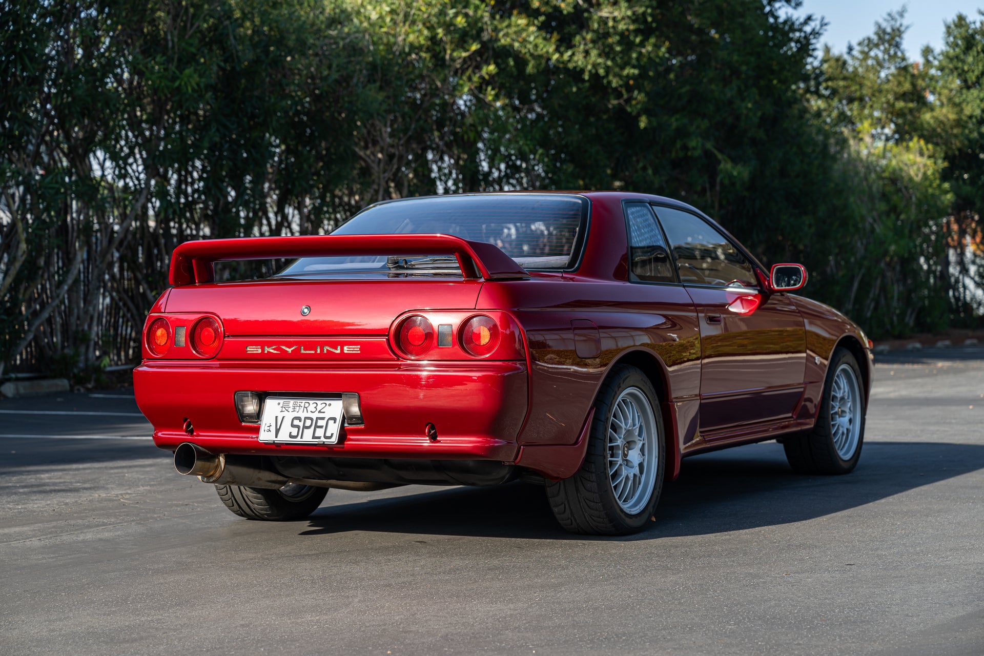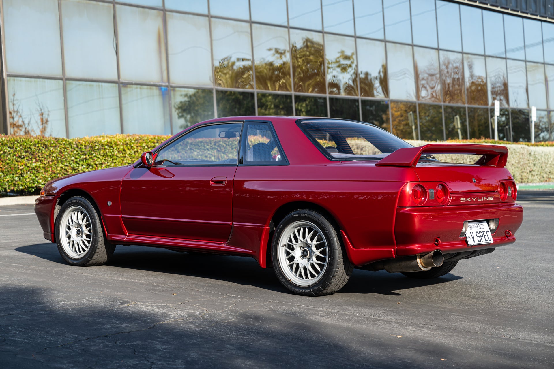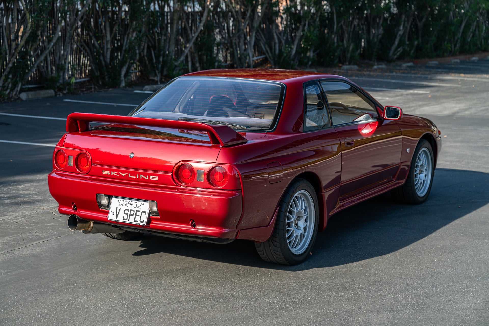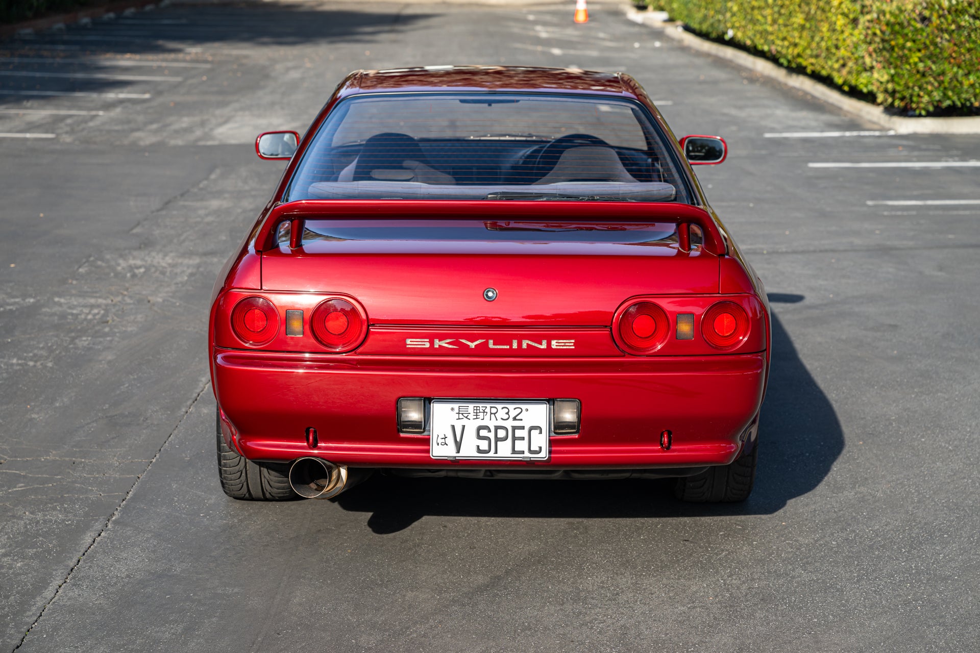 Unicorn 1994 Nissan Skyline GT-R R32 V-Spec II in rare Red Pearl Metallic (AH3) features excellent overall condition and only 21k miles (34k km) on the odometer. A special find, completely stock, no rust, full maintenance records and ready to go. This R32 V-Spec II belongs to the first generation of the Skyline GT-R series dubbed “Godzilla” (1989 -1994) and features the RB26DETT engine and classic 1990’s styling. This is a late model R-32 V-Spec that has a track-focused suspension setup with an emphasis on agility. A favorite of driving enthusiasts due to the emphasis on power and handling and the no nonsense looks and interior.