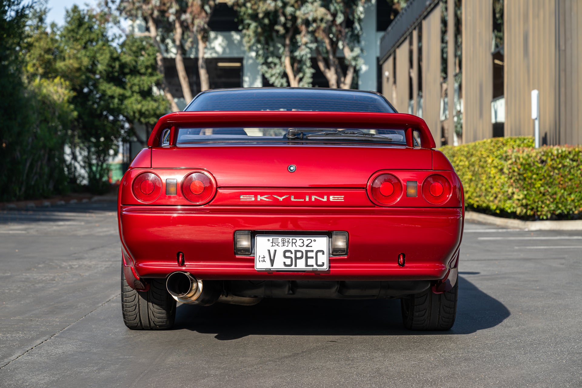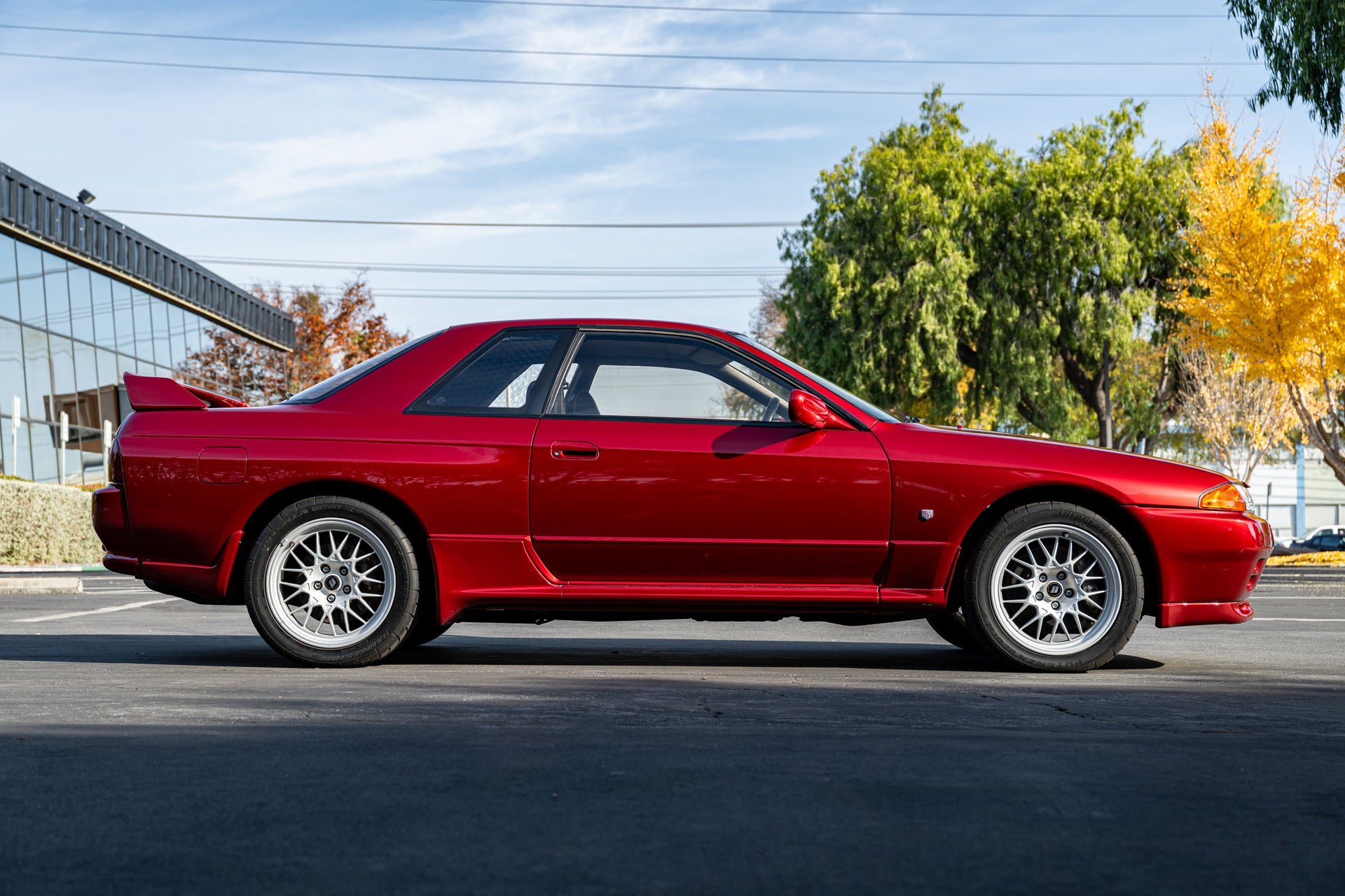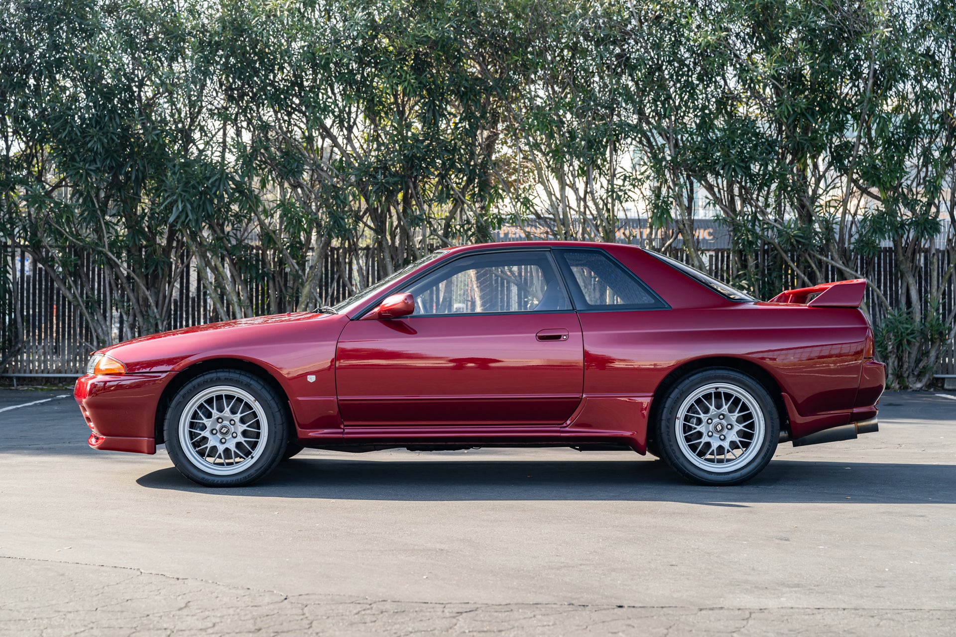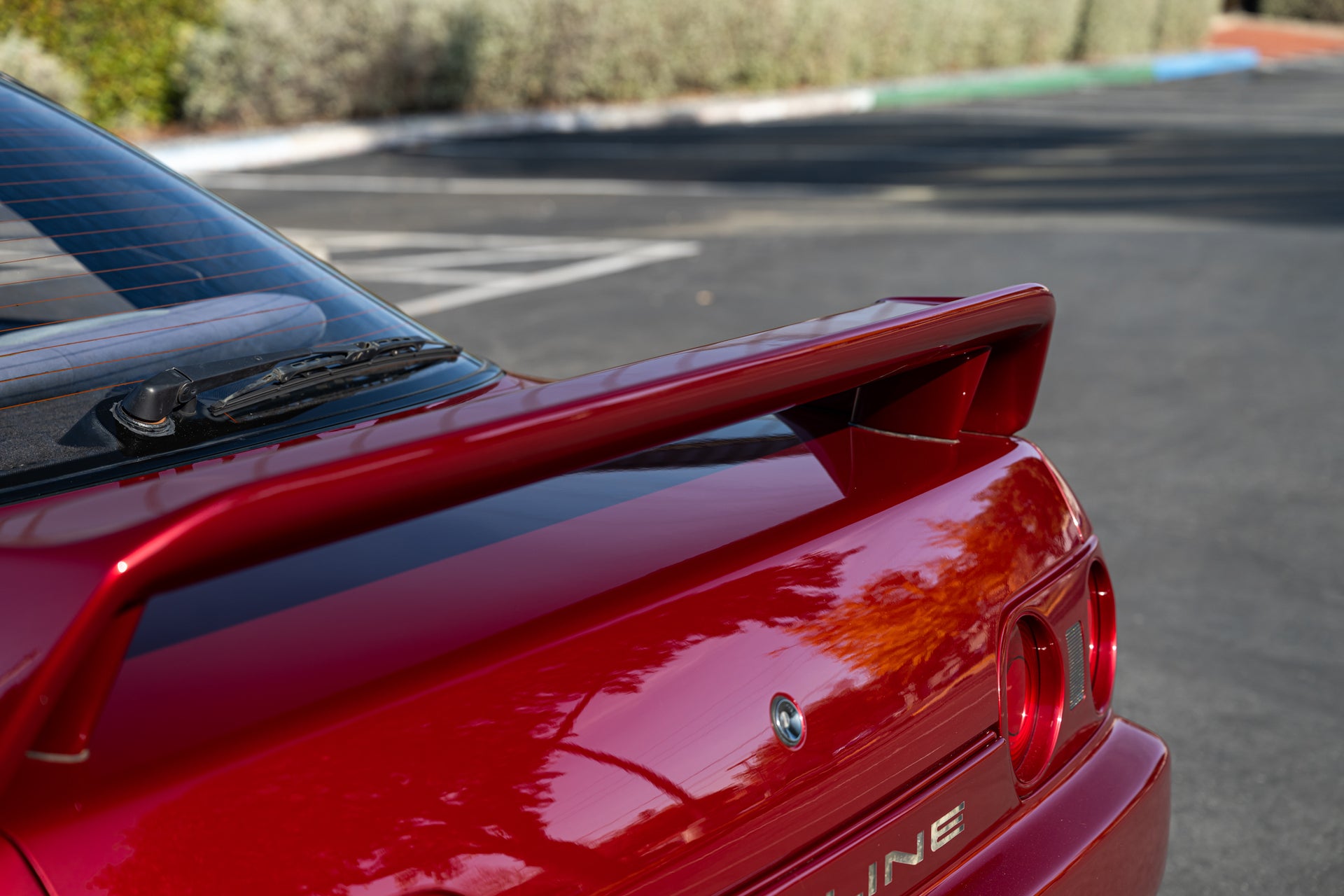 Unicorn 1994 Nissan Skyline GT-R R32 V-Spec II in rare Red Pearl Metallic (AH3) features excellent overall condition and only 21k miles (34k km) on the odometer. A special find, completely stock, no rust, full maintenance records and ready to go. This R32 V-Spec II belongs to the first generation of the Skyline GT-R series dubbed “Godzilla” (1989 -1994) and features the RB26DETT engine and classic 1990’s styling. This is a late model R-32 V-Spec that has a track-focused suspension setup with an emphasis on agility. A favorite of driving enthusiasts due to the emphasis on power and handling and the no nonsense looks and interior.